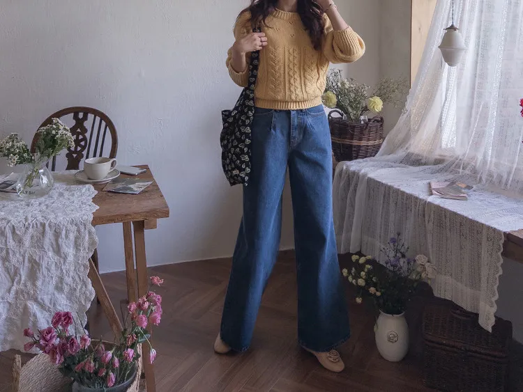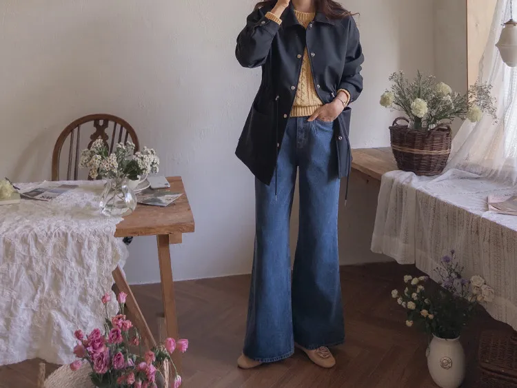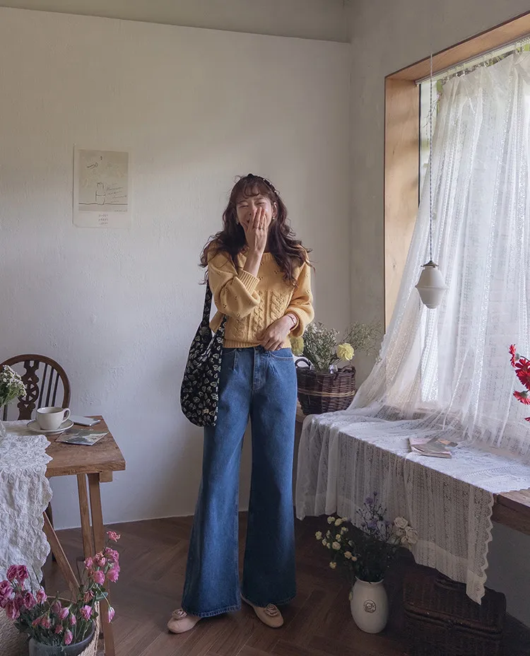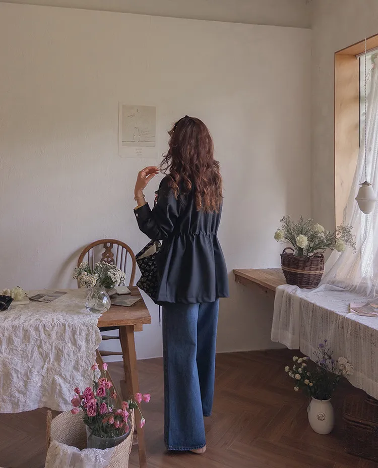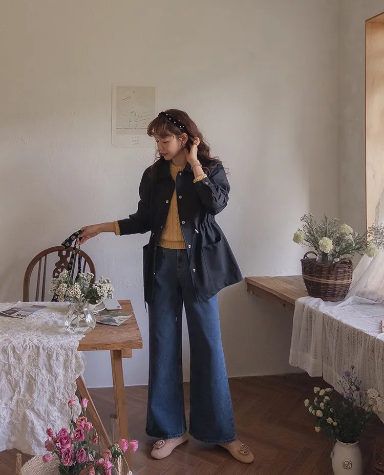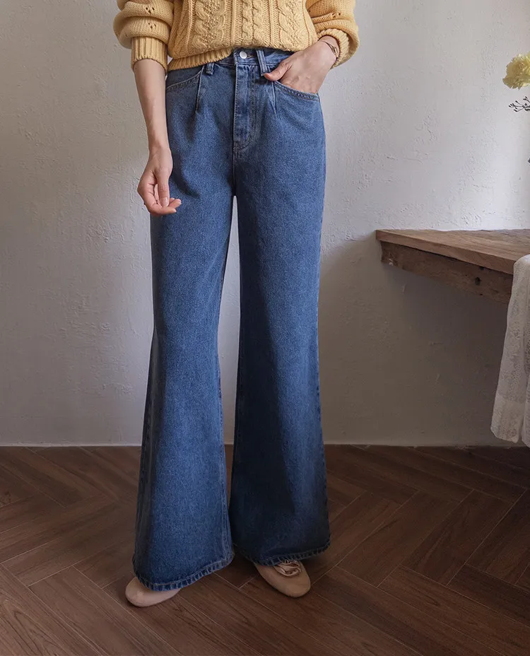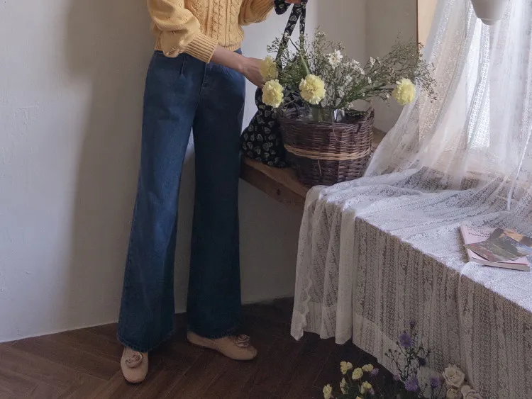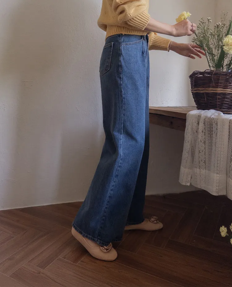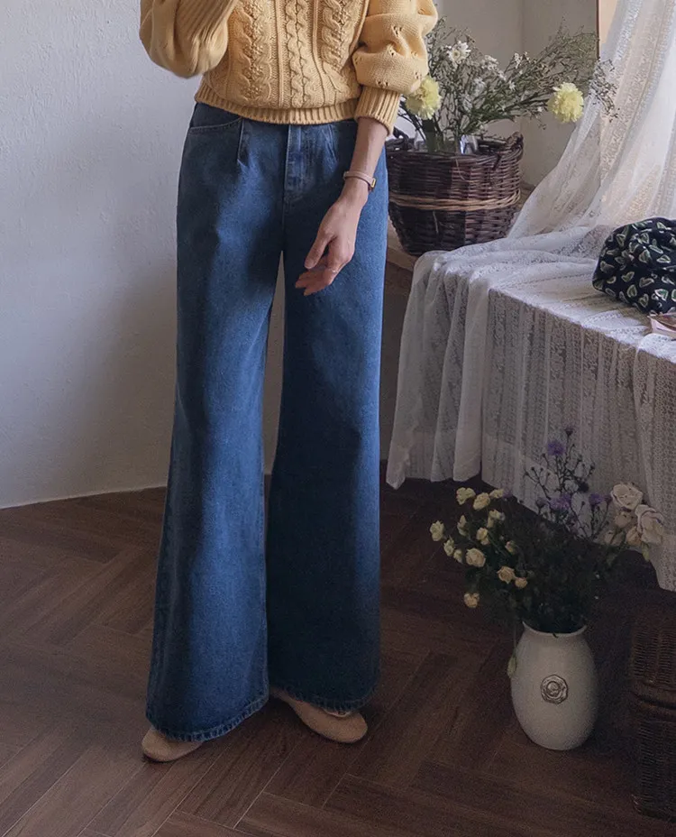 【腰部有時尚褶邊的牛仔褲】 【完美包裹下半身!寬鬆版型】 【時尚合身】 【100%純棉布料】