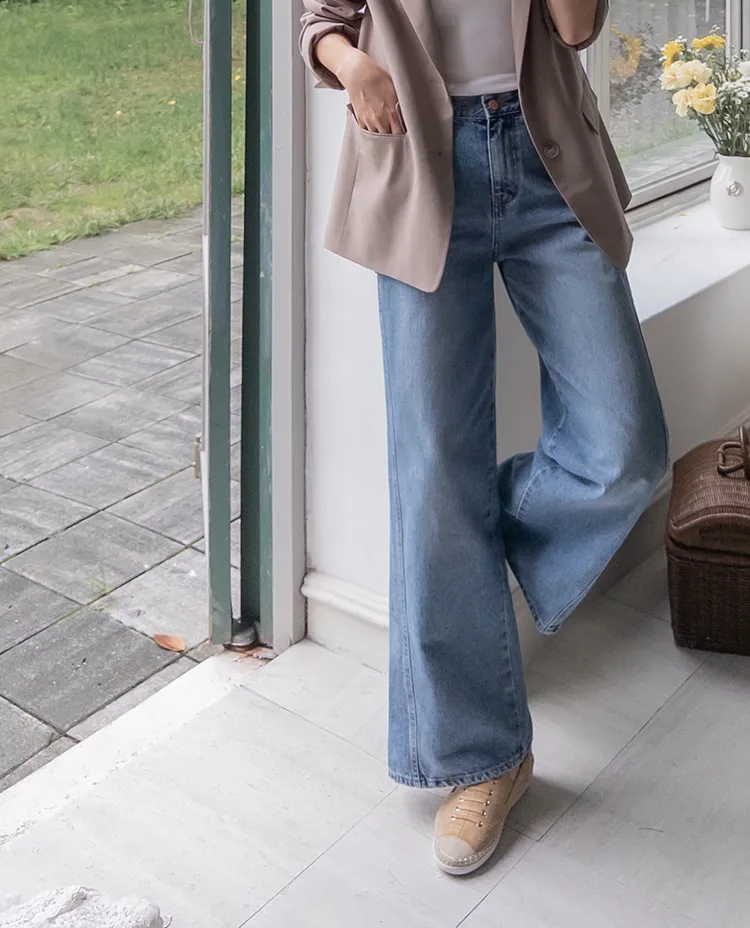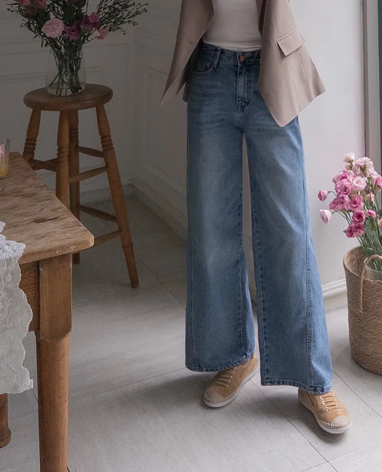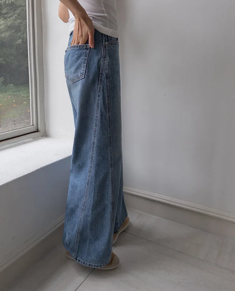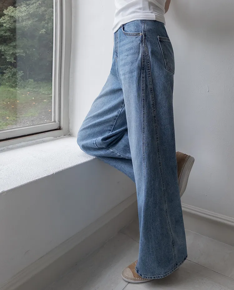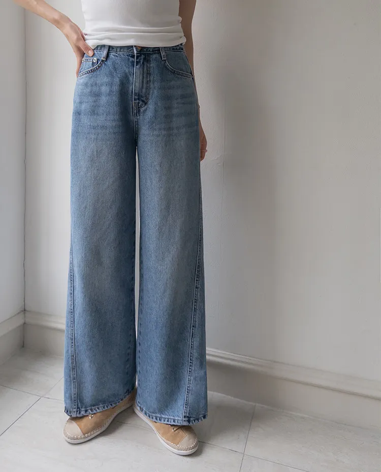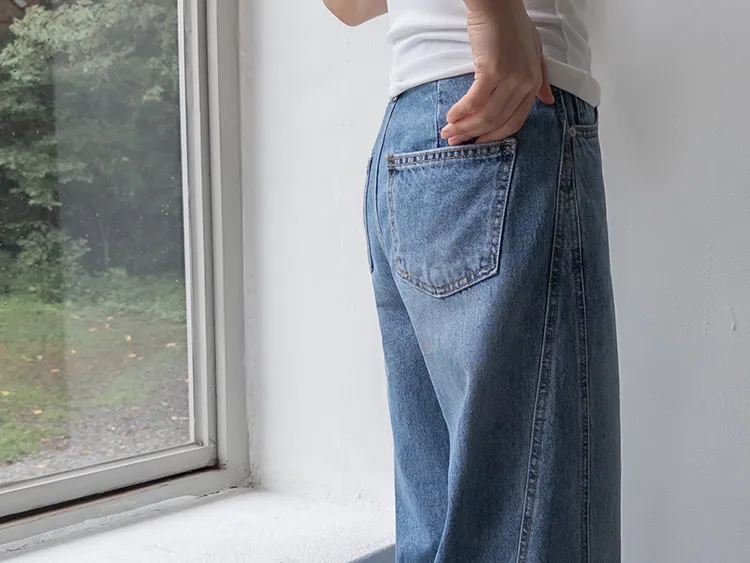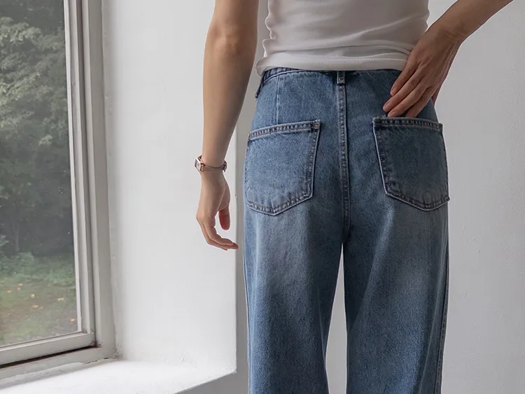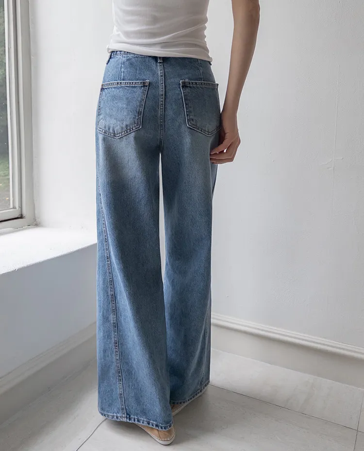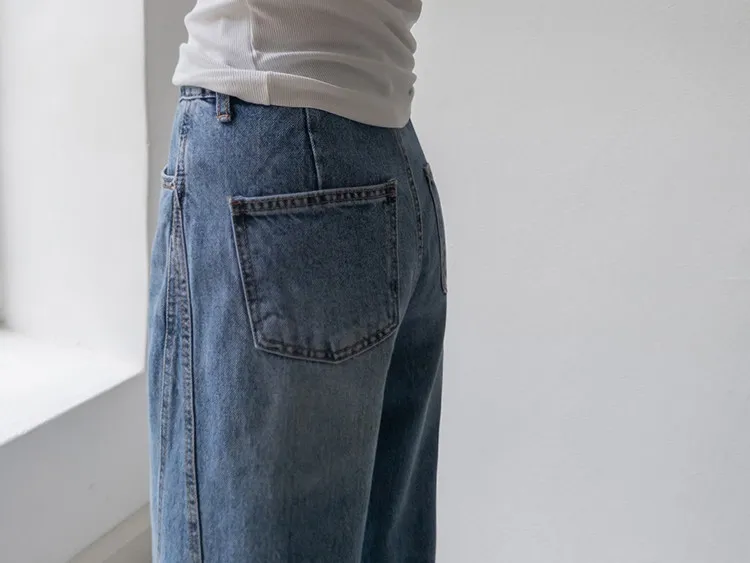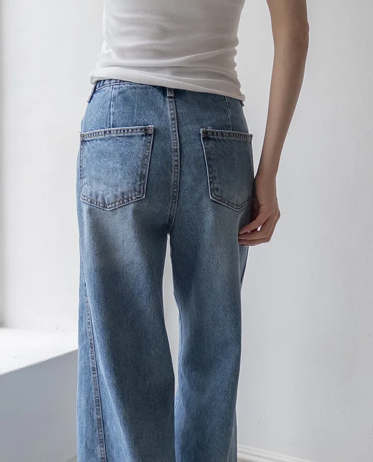 獨特斜角剪裁線條設計寬版修身牛仔褲