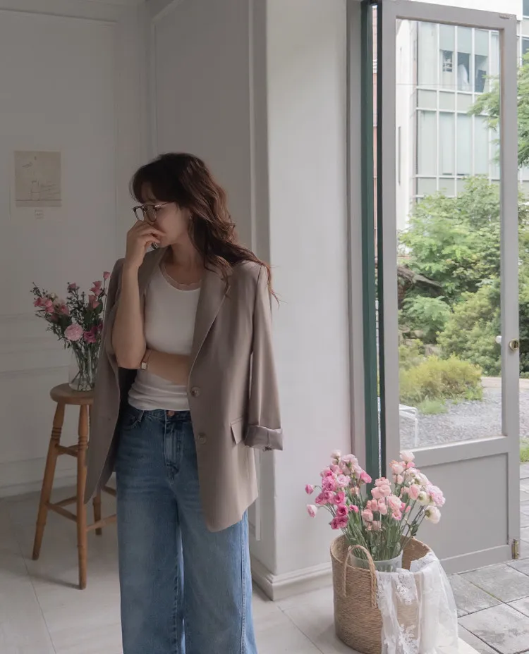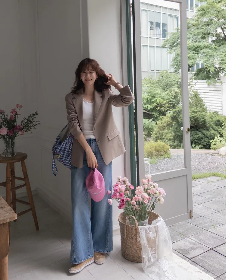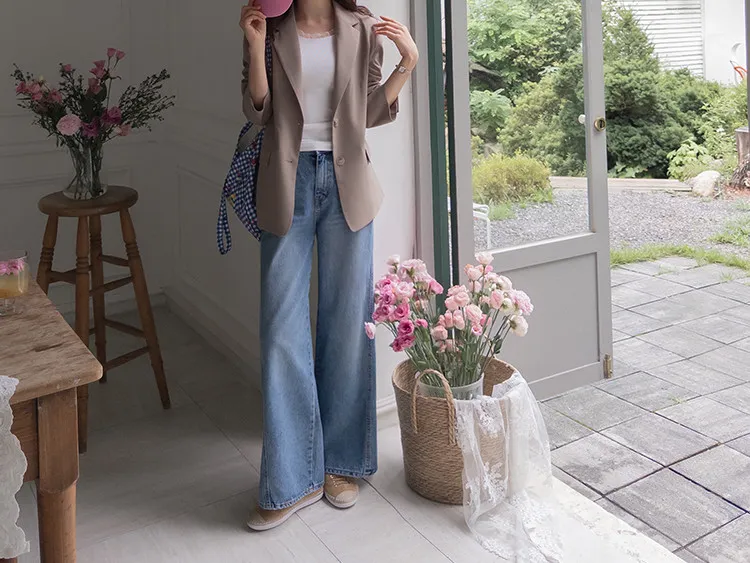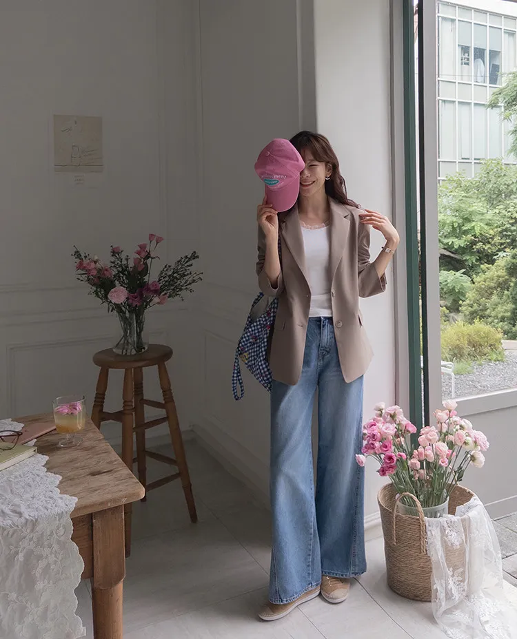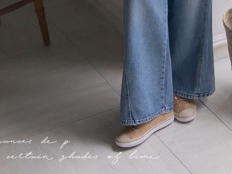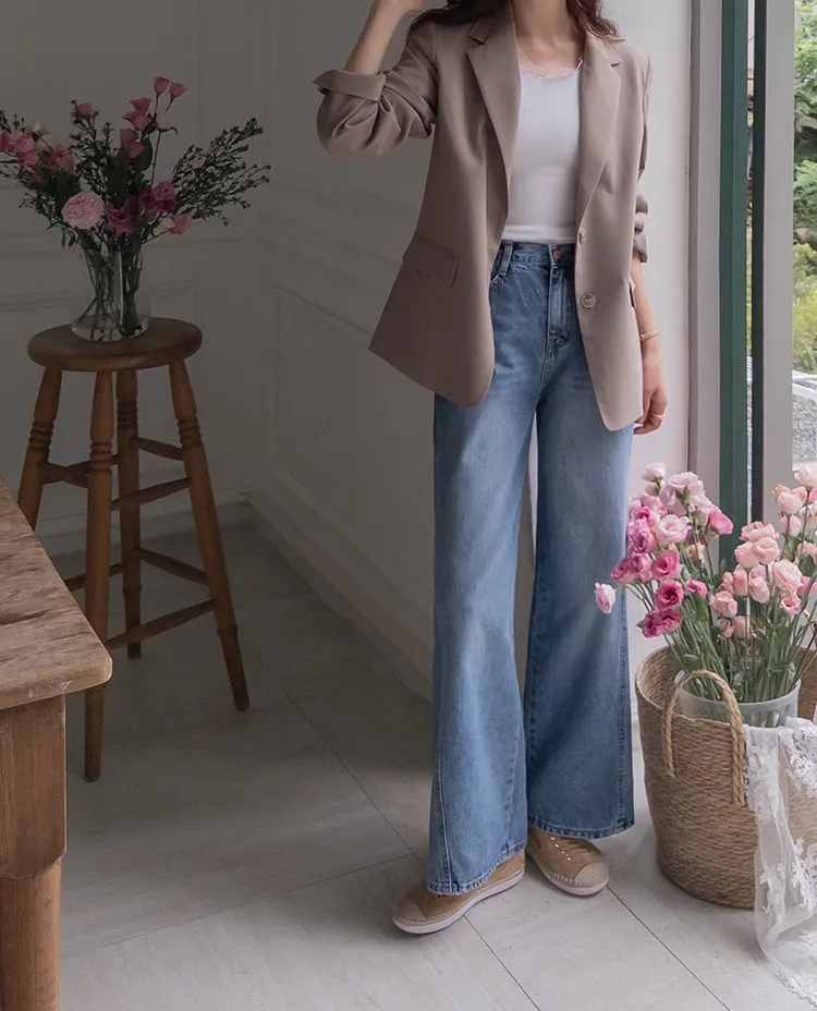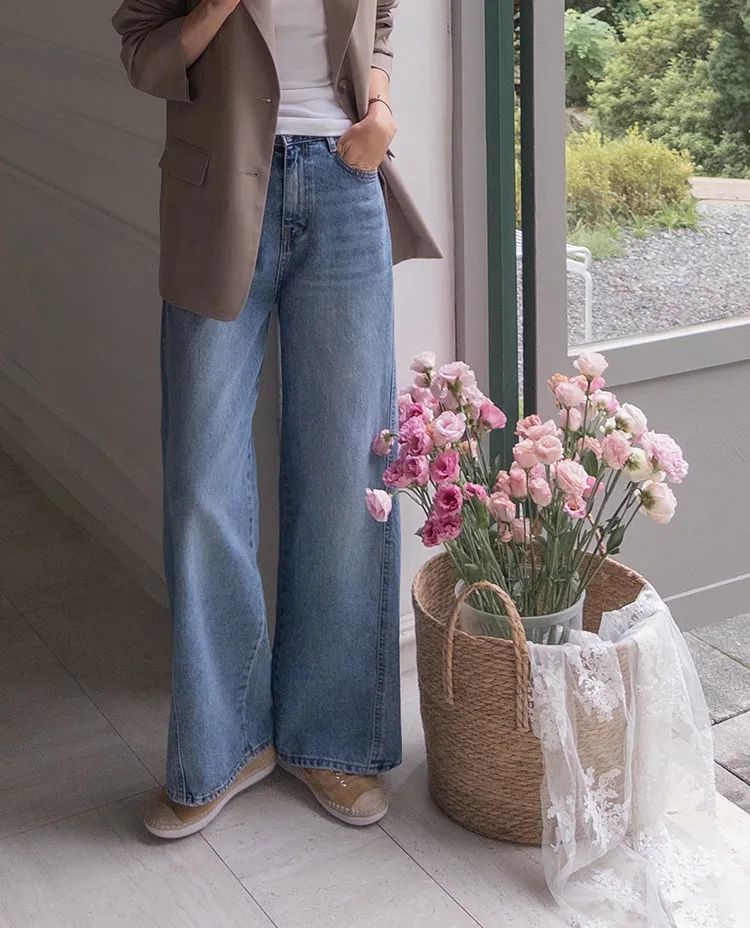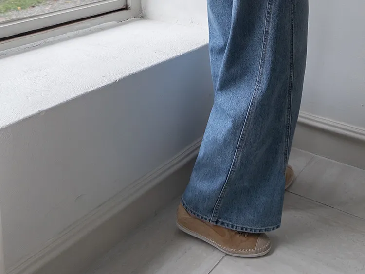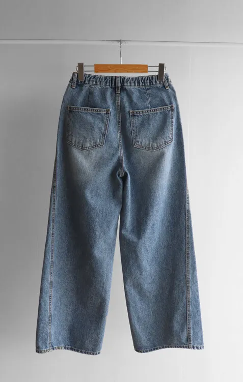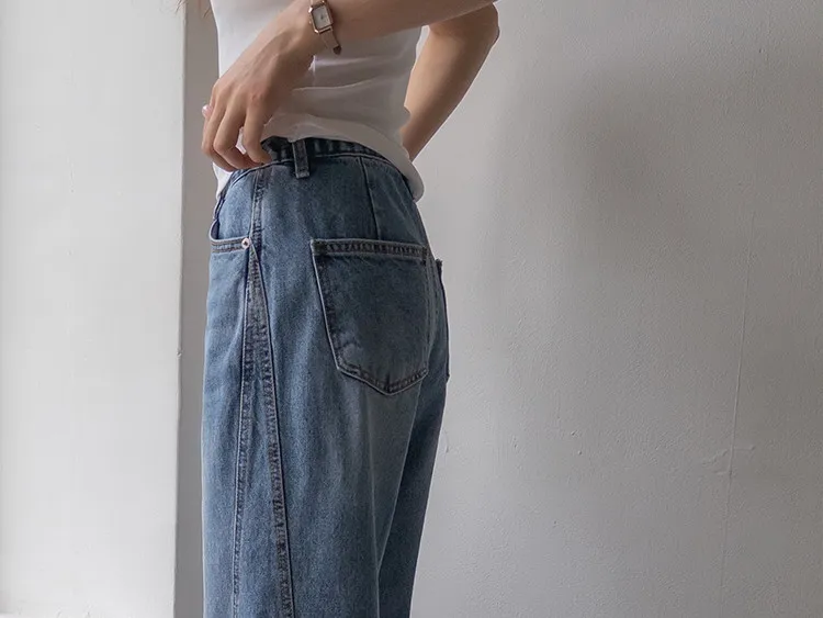 獨特斜角剪裁線條設計寬版修身牛仔褲