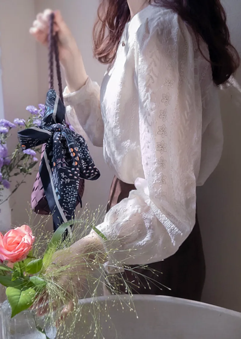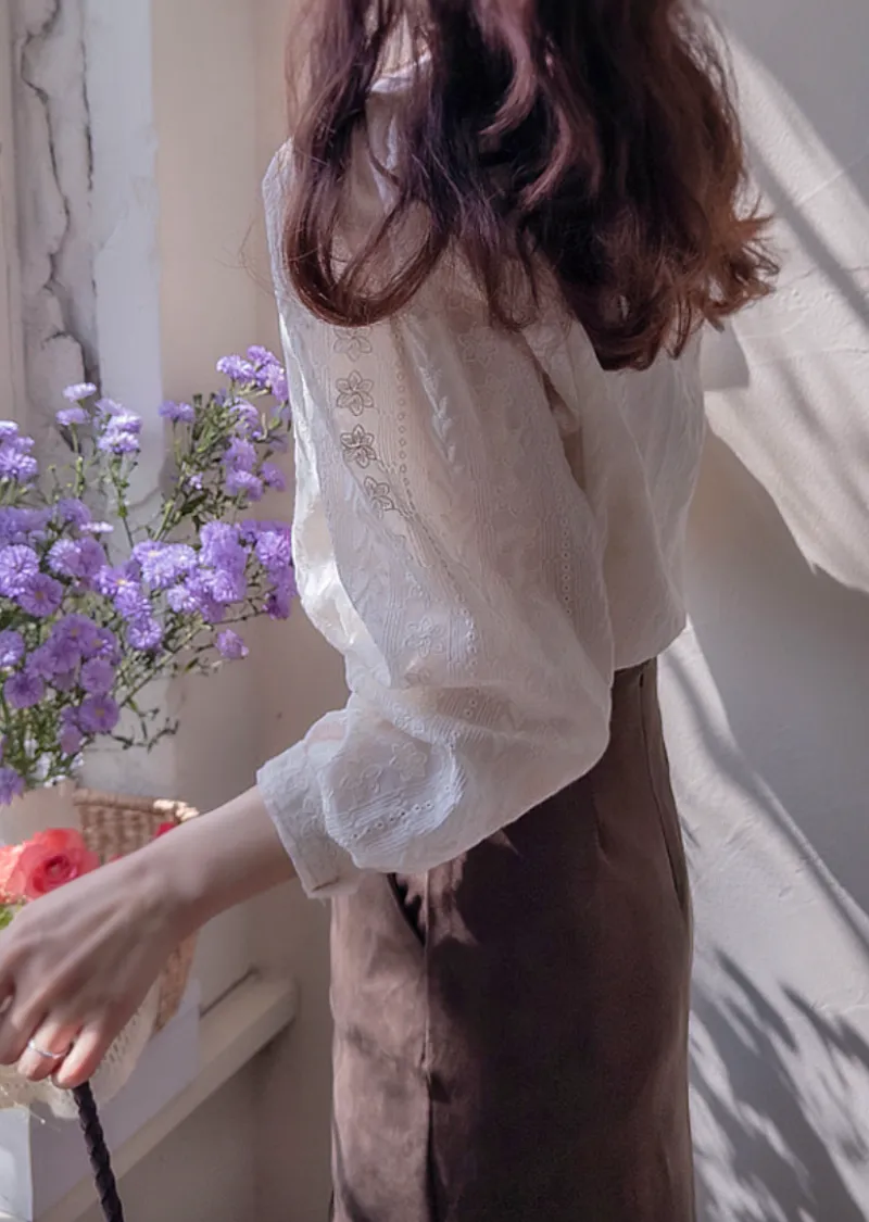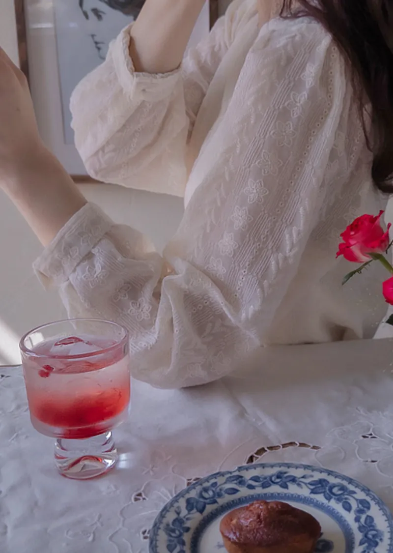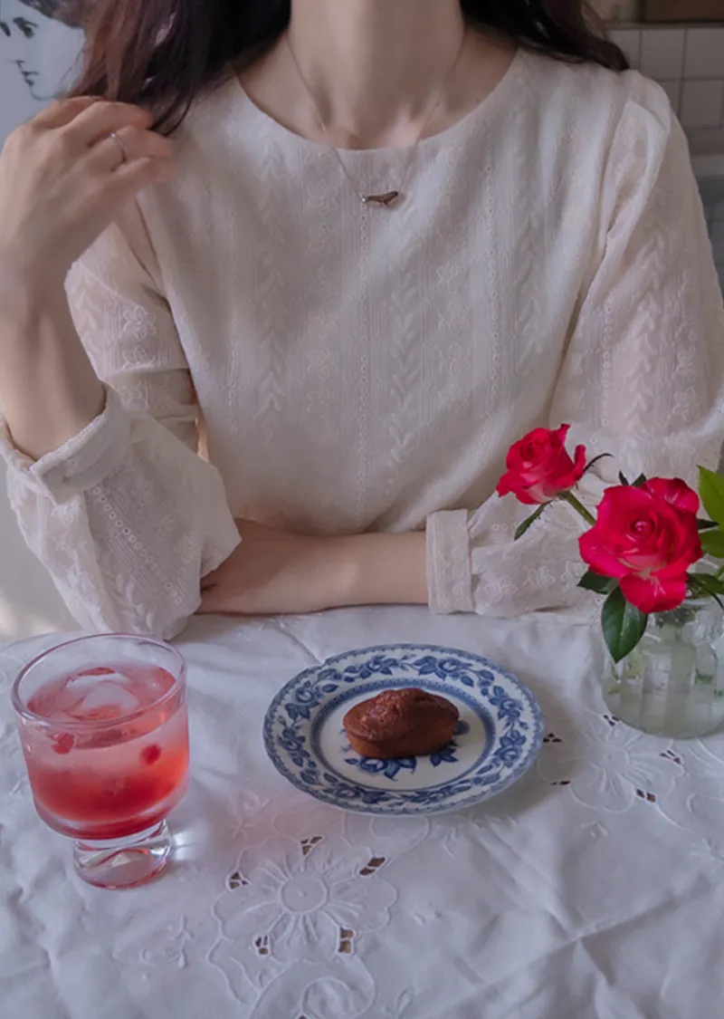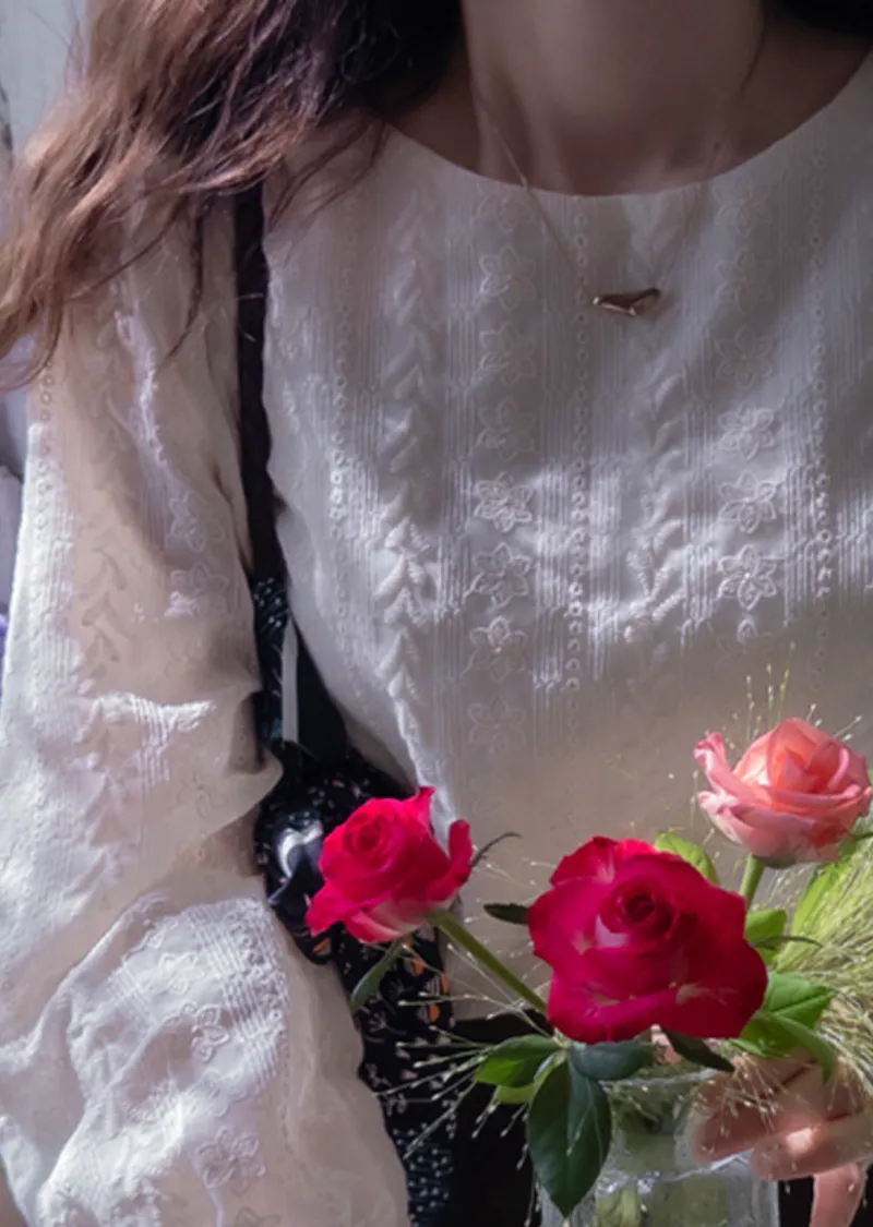 [衣身裡料:聚酯纖維] [精緻的花卉刺繡,設計可愛] [花卉刺繡與迷你鏤空刺繡相結合的肩線剪裁設計,漂亮優雅的上衣] [適合秋季穿著的明亮或精緻的顏色]