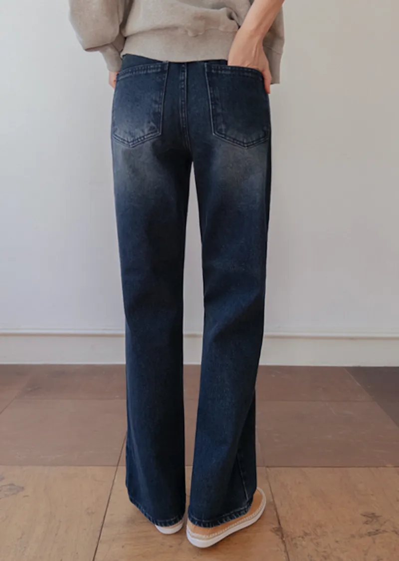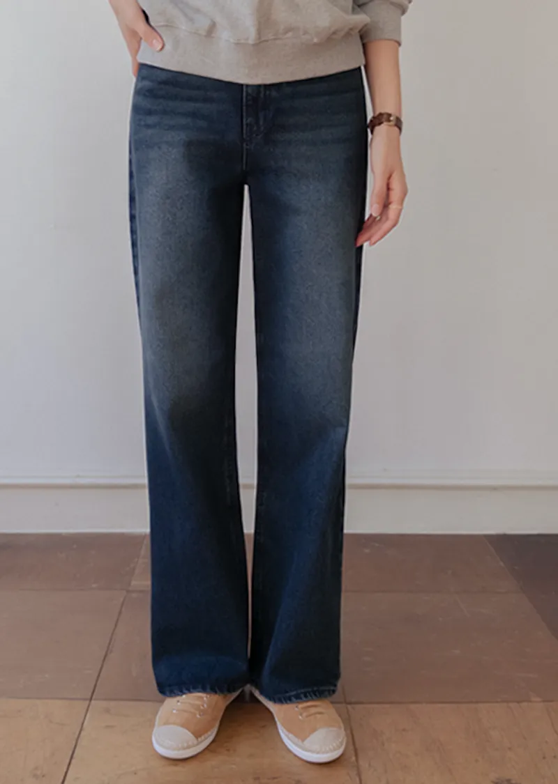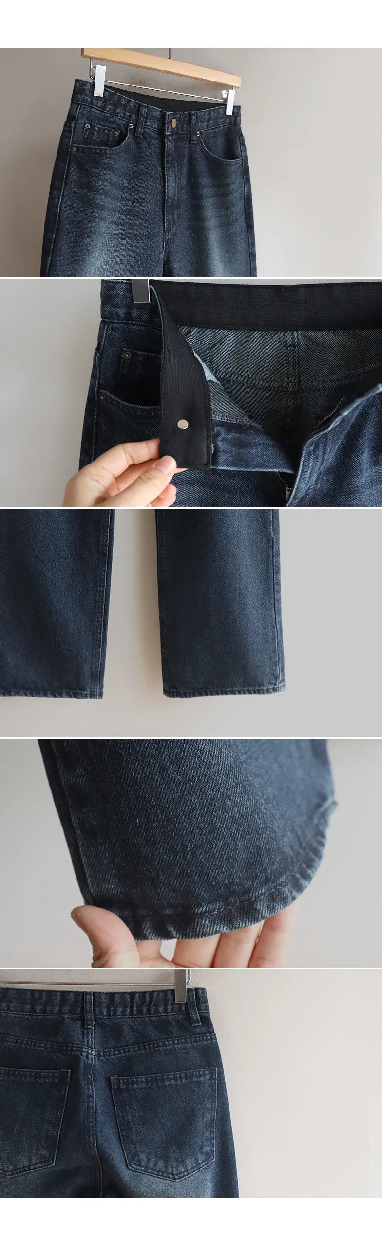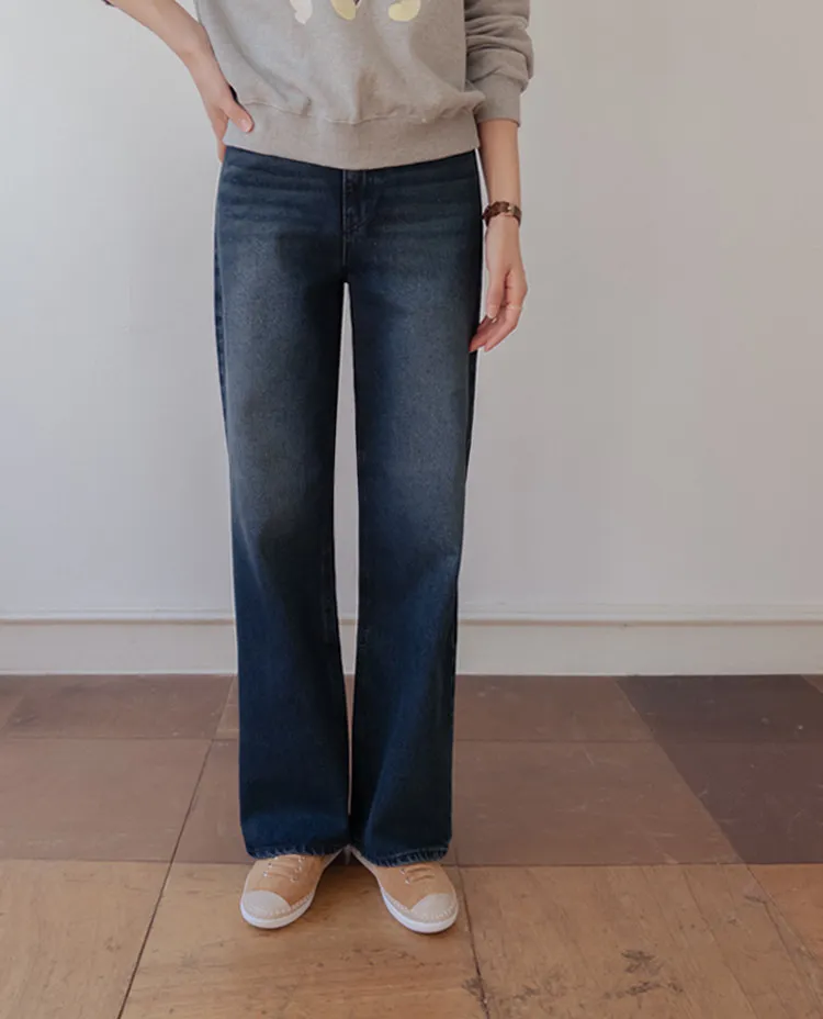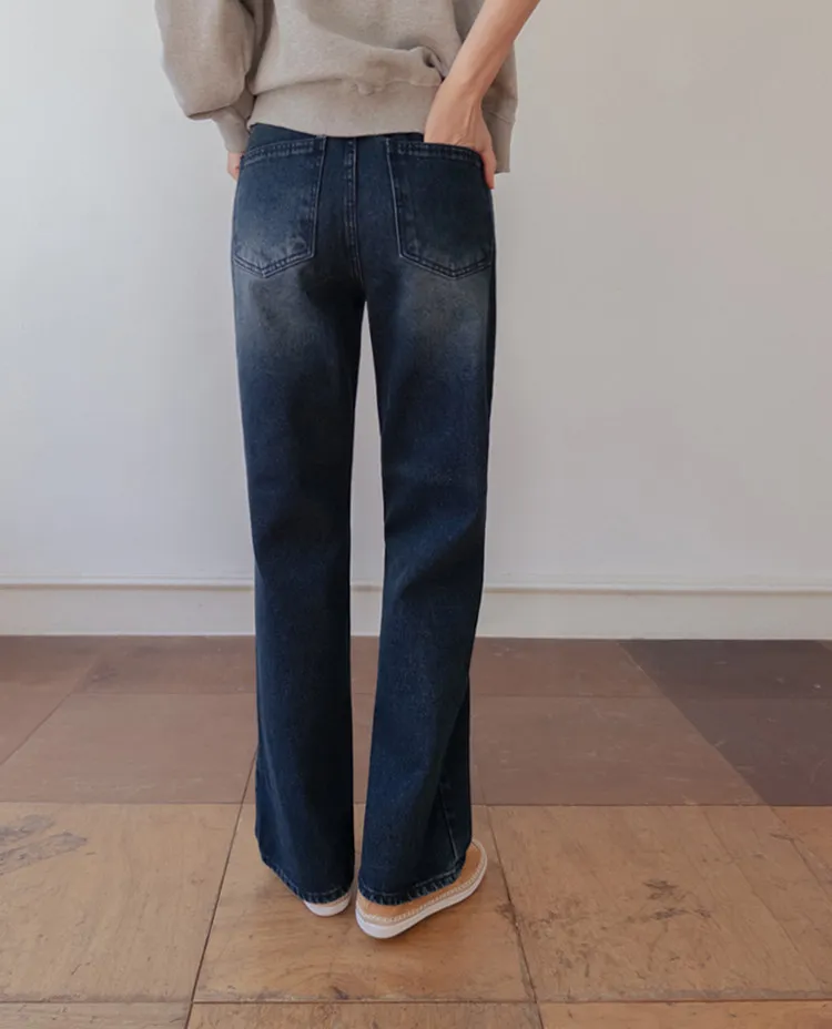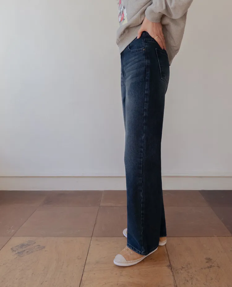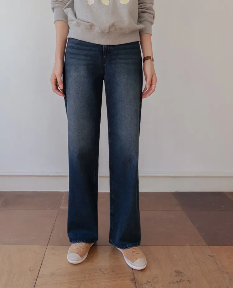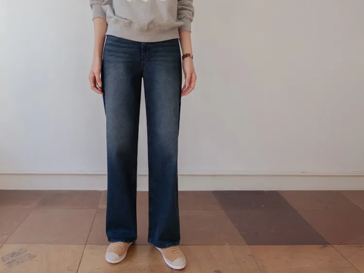 [迷人憂鬱色感的的深藍色牛仔褲] [奢華的水洗細節讓您的雙腿更加纖細〜] [隱藏的腰彈性帶穿著舒適] [直筒版型修飾身材! ]