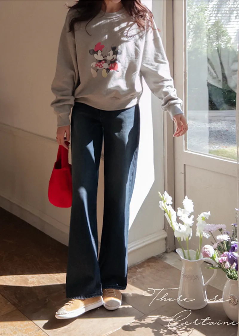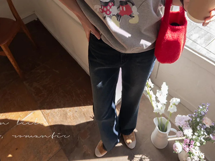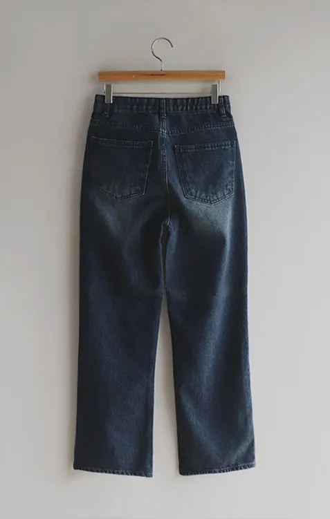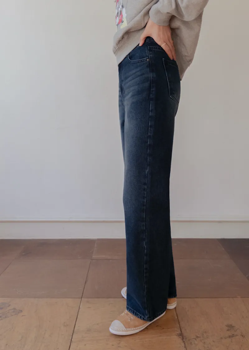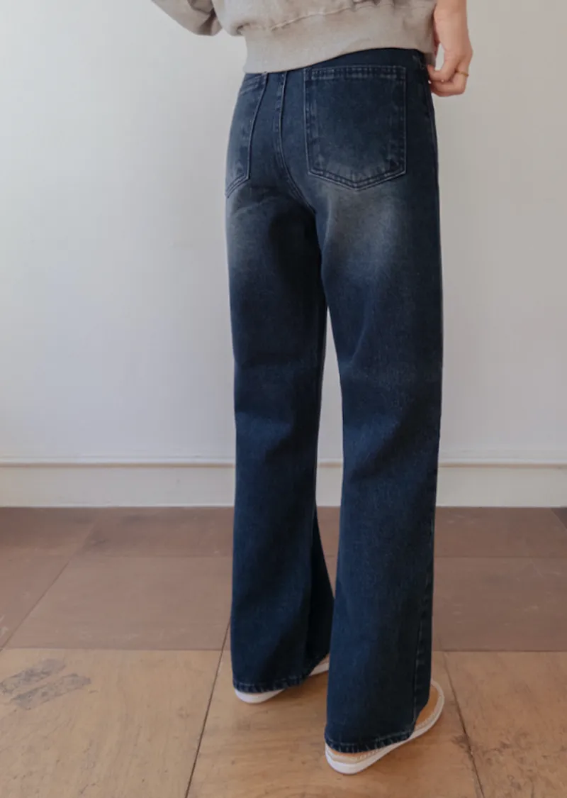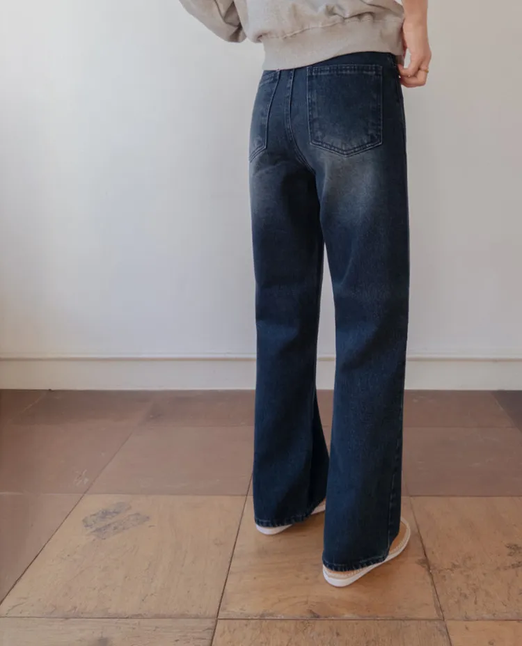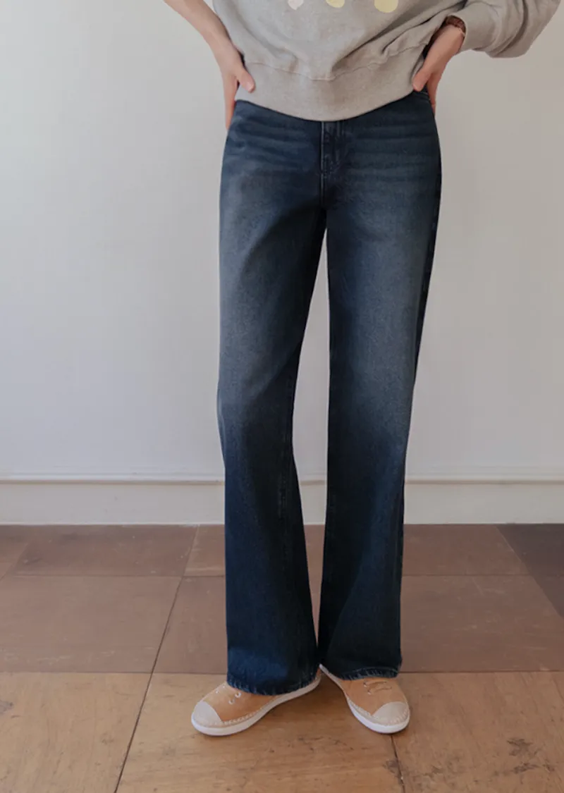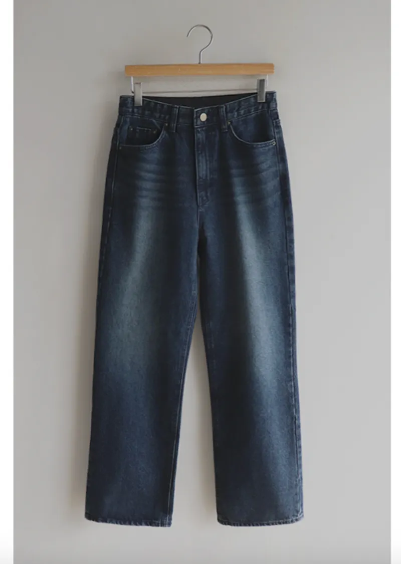 [迷人憂鬱色感的的深藍色牛仔褲] [奢華的水洗細節讓您的雙腿更加纖細〜] [隱藏的腰彈性帶穿著舒適] [直筒版型修飾身材! ]