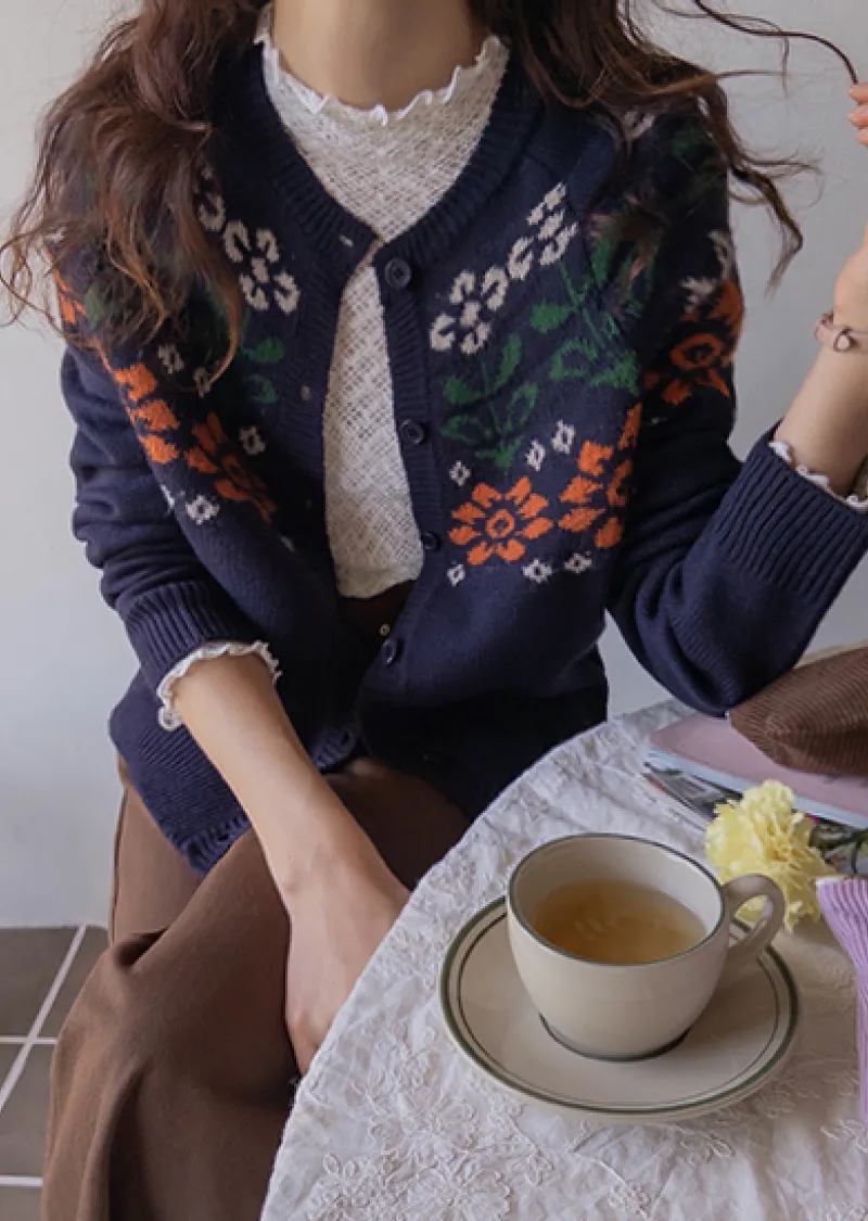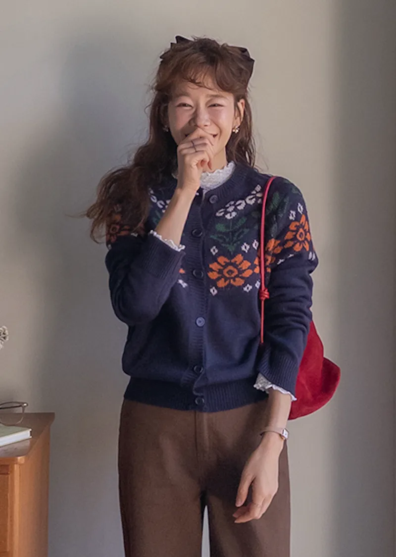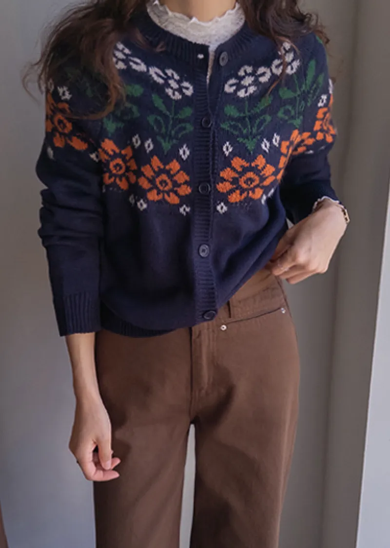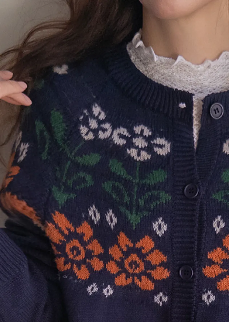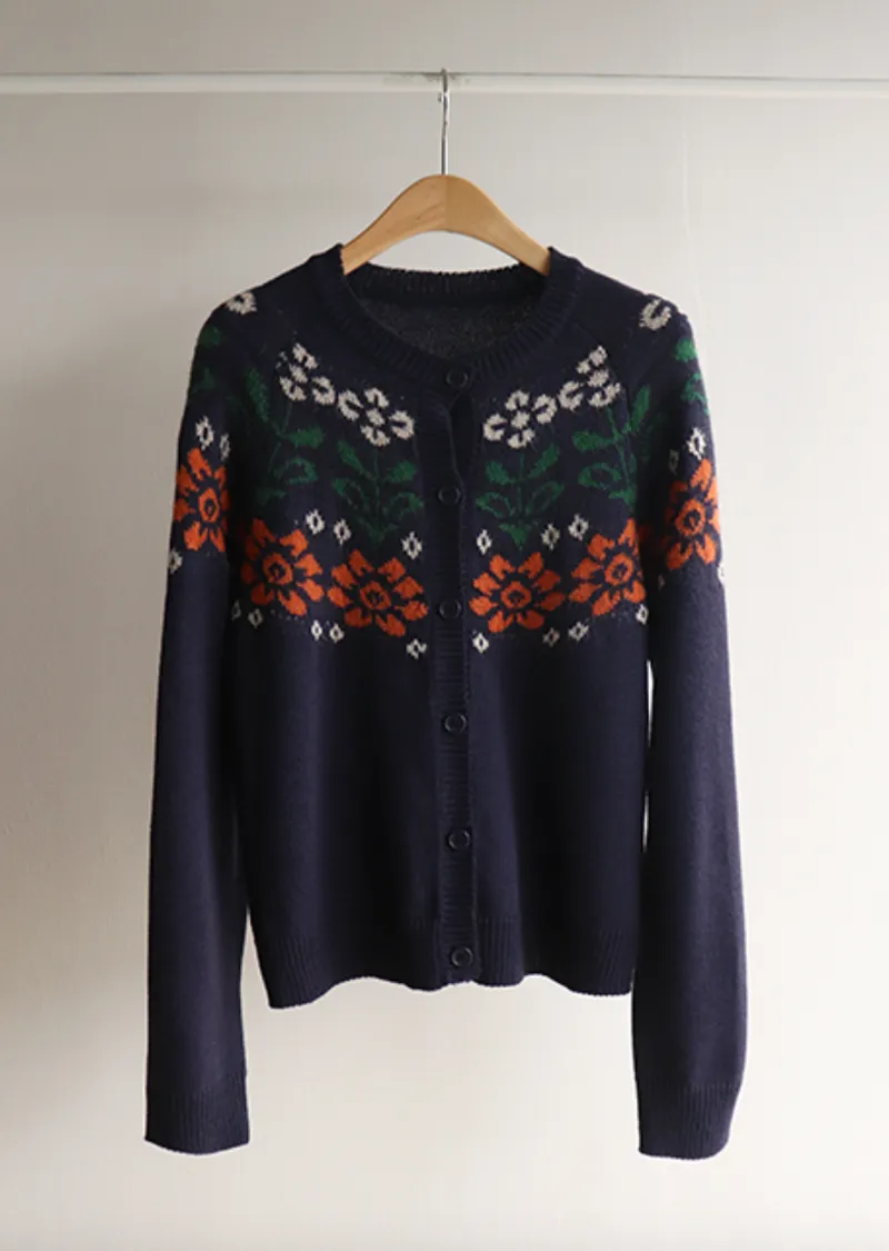 【可愛的花朵緹花圖案開衫♥】【含有10%的舒適羊毛】【獨特的配色,凸顯了整體的亮點! 】【穿上就完成時尚造型】
