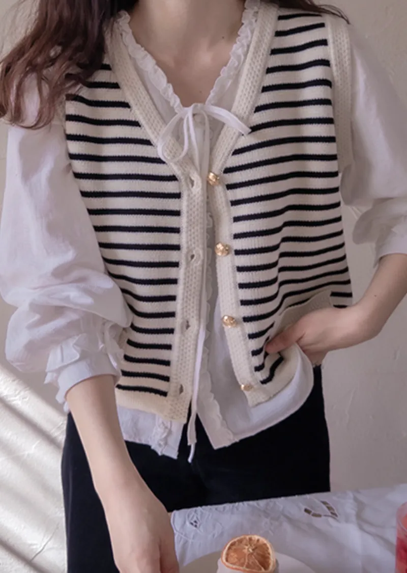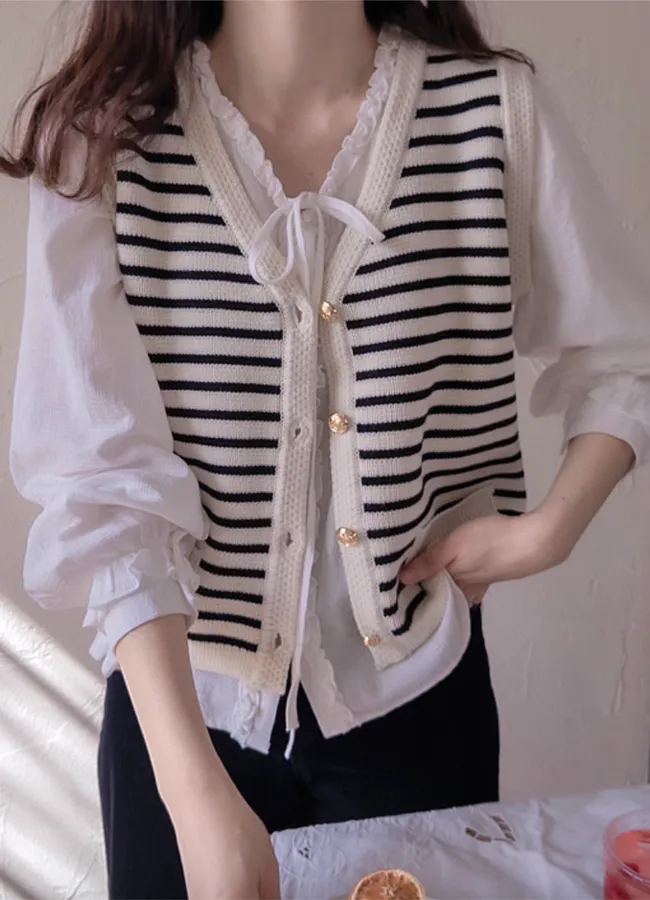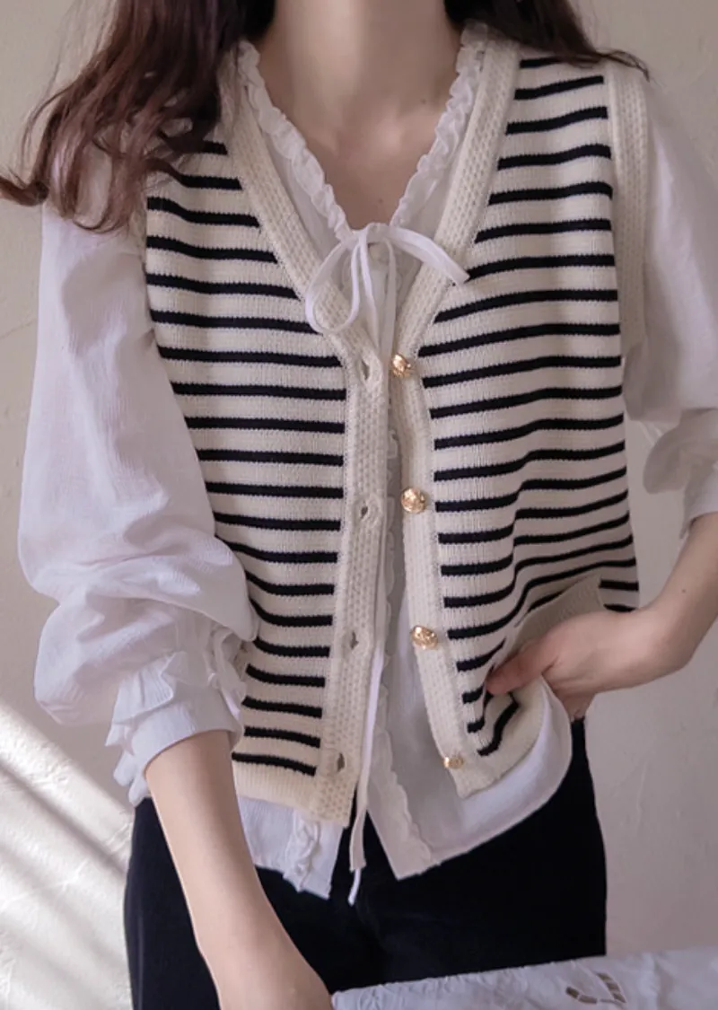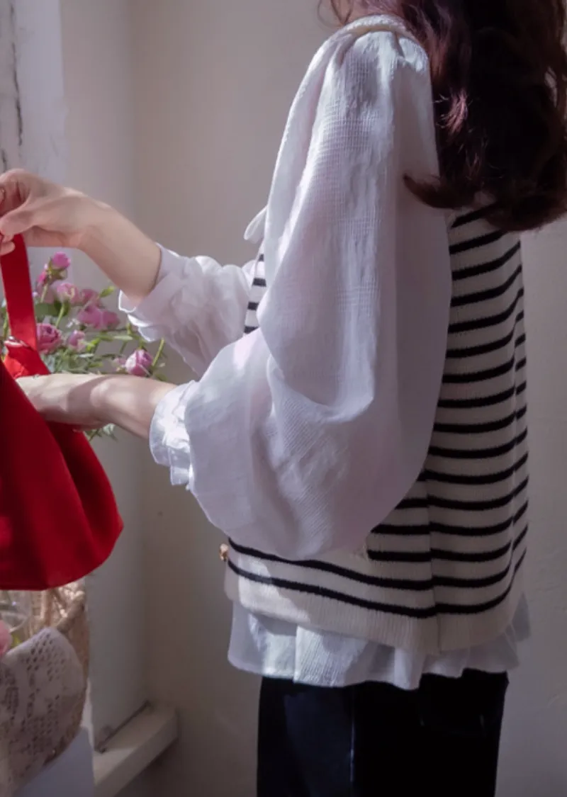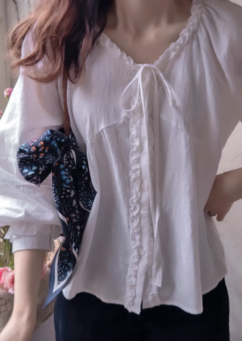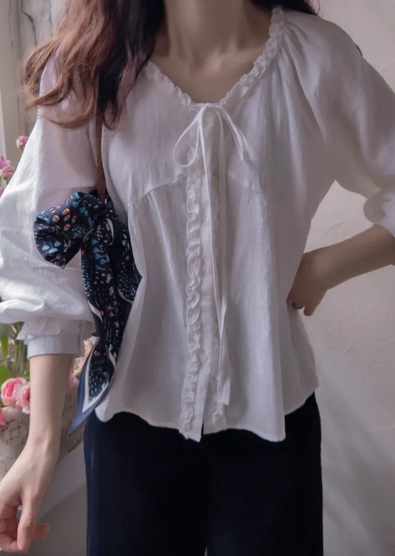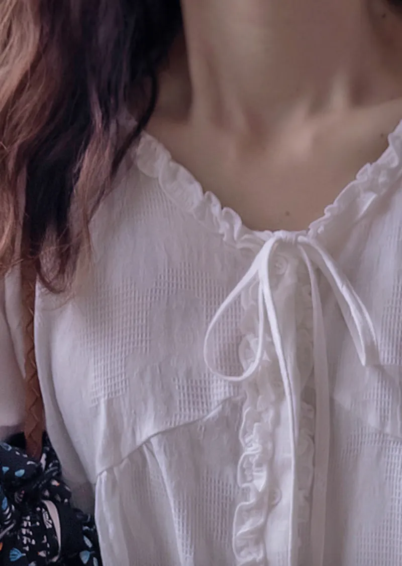 漂亮立體緹花摺邊點綴綁帶排扣上衣