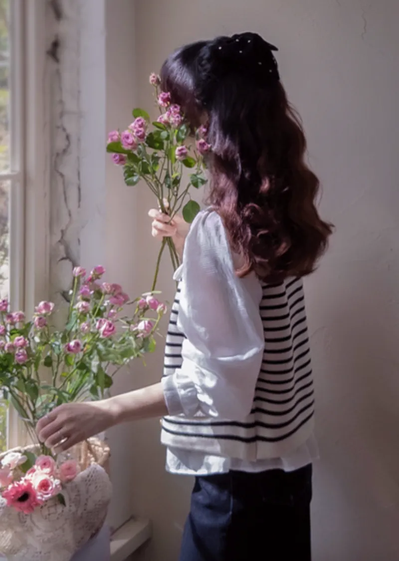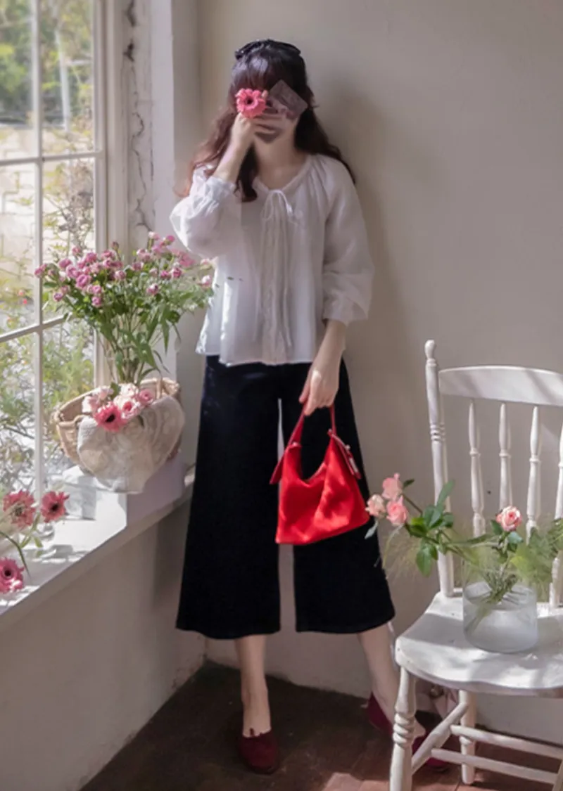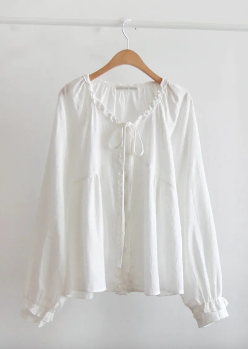 【奢華立體的緹花布料:純色花朵圖案的可愛上衣】 【領口的褶皺設計,營造精緻氛圍】 【明亮易搭配的秋季上衣】 【作為獨特的純色緹花上衣】