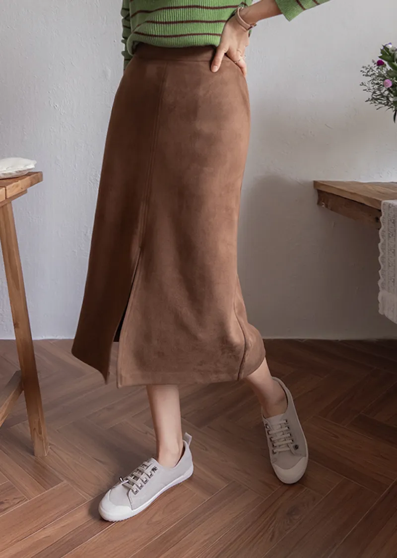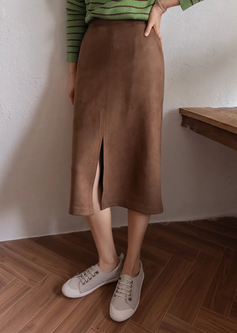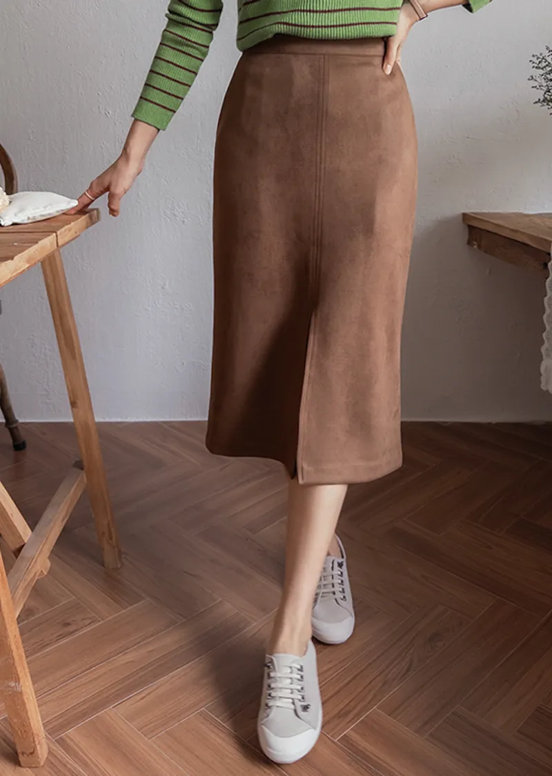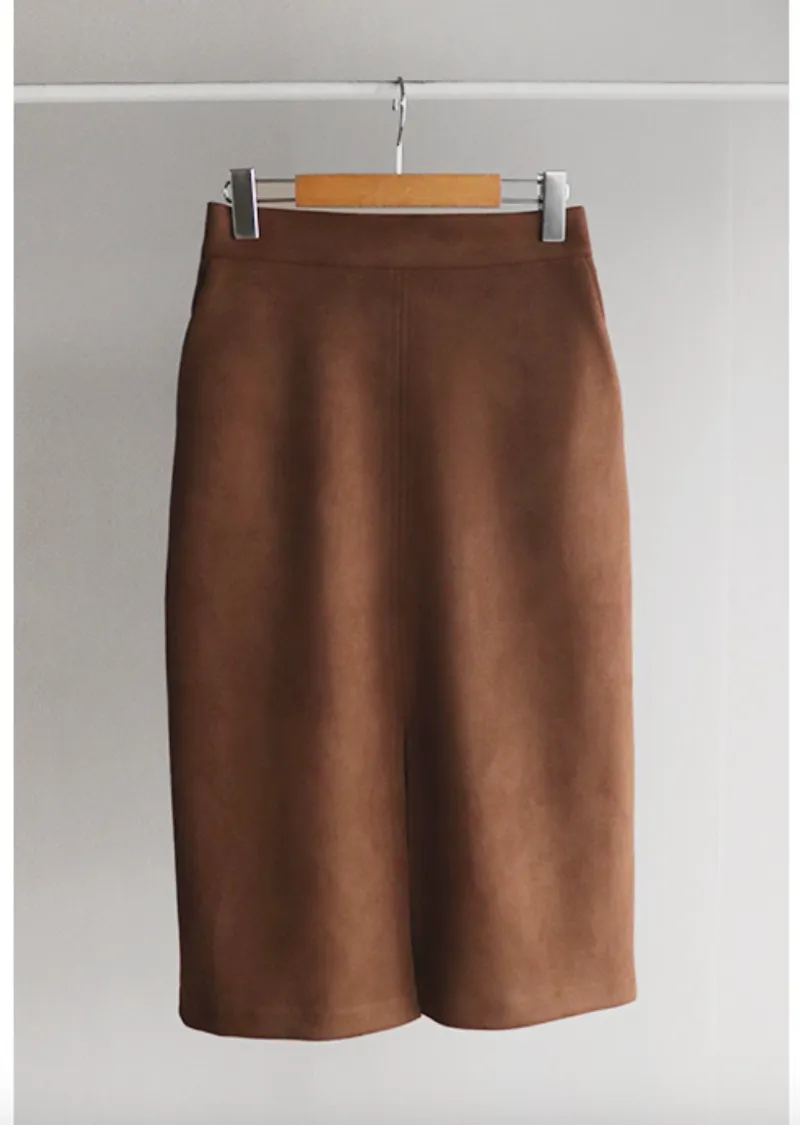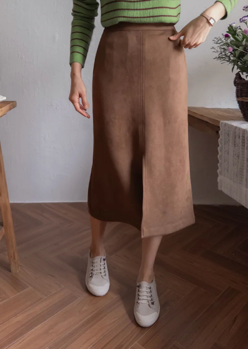 【優雅完成秋季造型!絨面革H剪裁裙子♥】【四向拉伸,彈性十足,活動自如】【前開衩設計,更加舒適~】【後部鬆緊彈性帶,全天舒適~】
