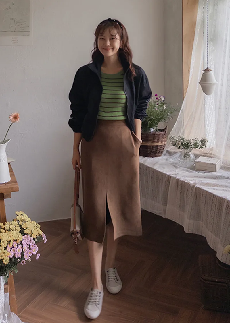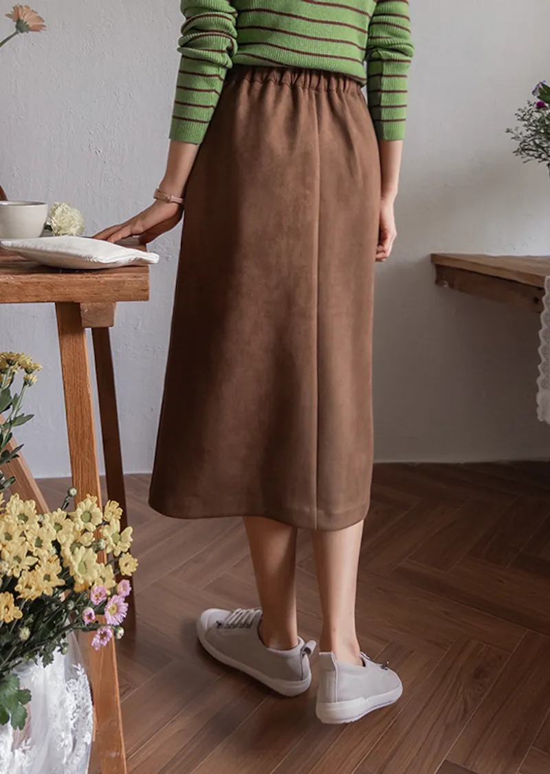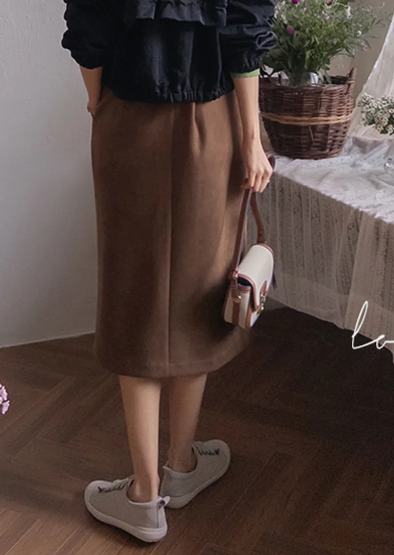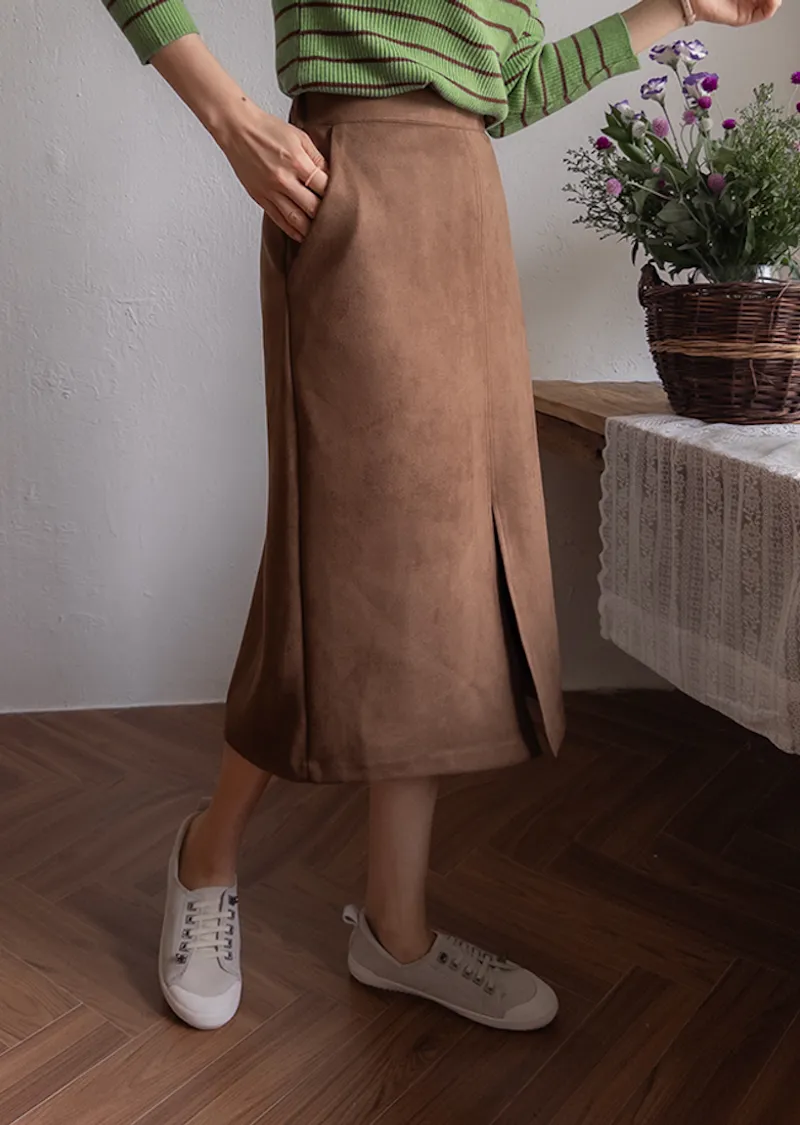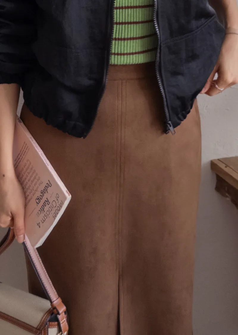 【優雅完成秋季造型!絨面革H剪裁裙子♥】【四向拉伸,彈性十足,活動自如】【前開衩設計,更加舒適~】【後部鬆緊彈性帶,全天舒適~】