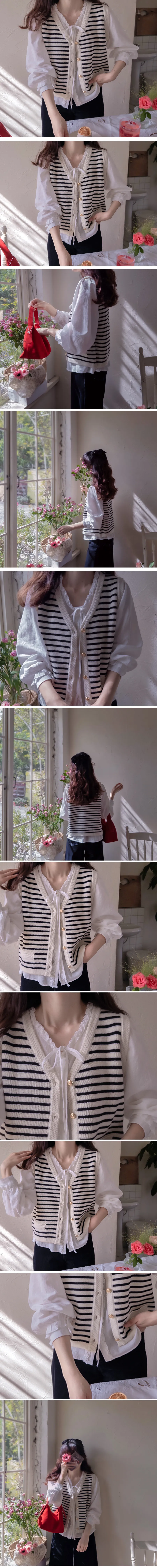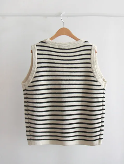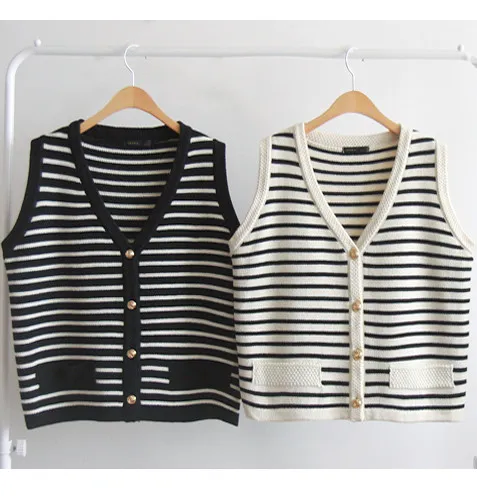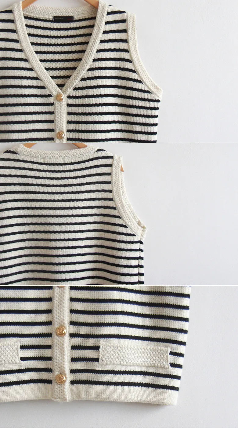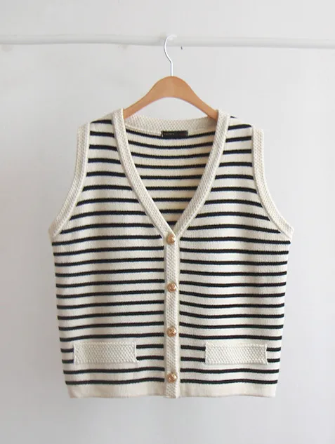 漂亮經典條紋點綴金扣V領穿搭針織背心