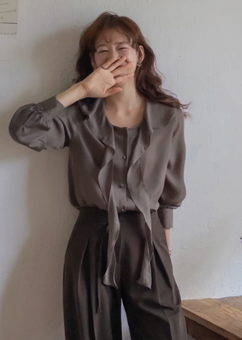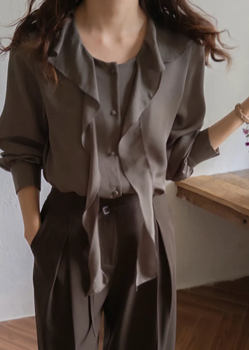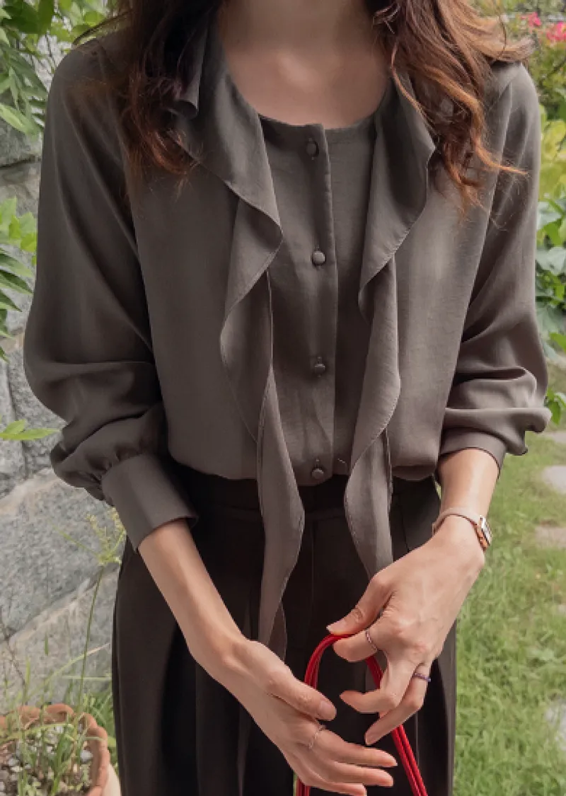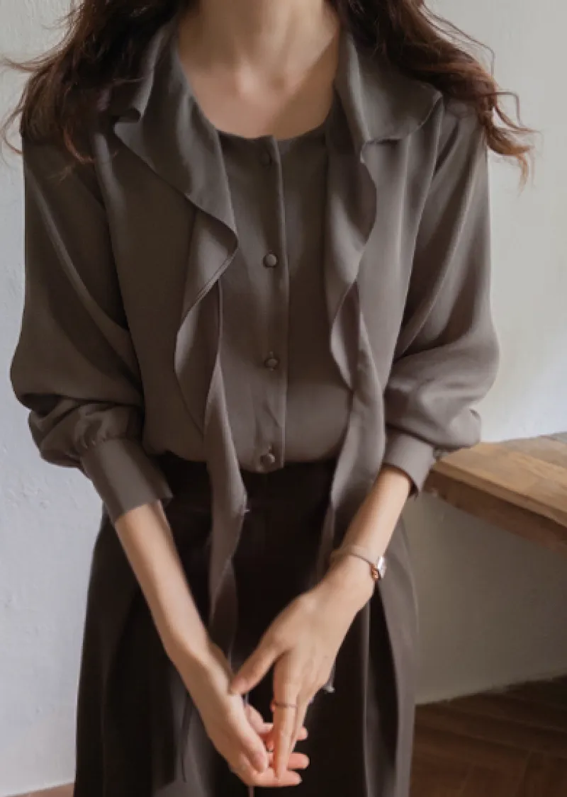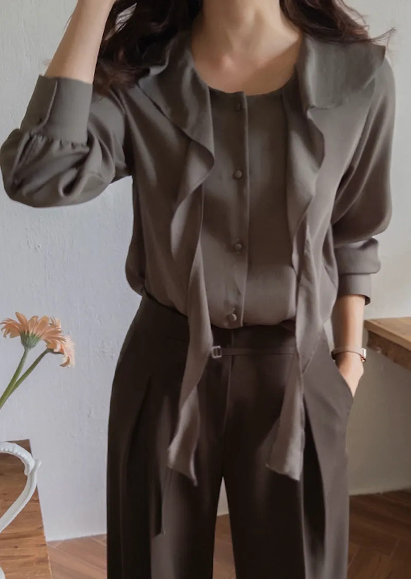 浪漫飄逸荷葉摺邊綁帶領排扣上衣