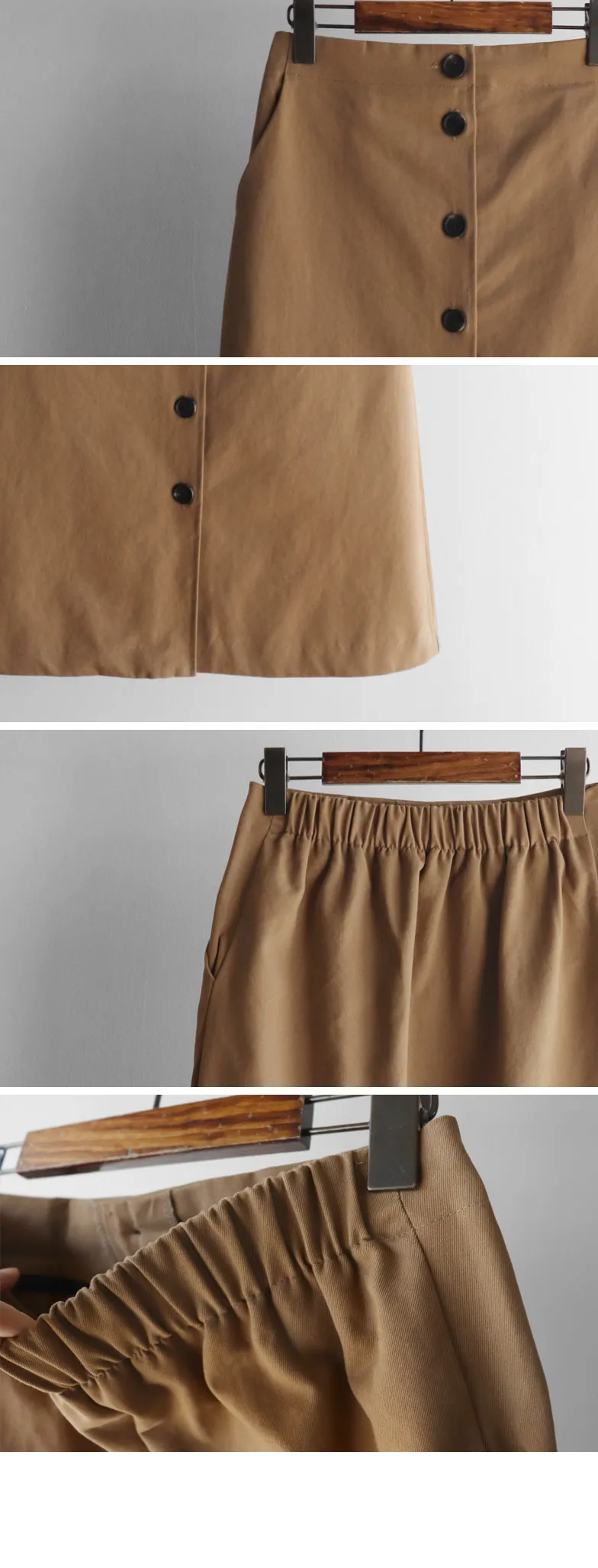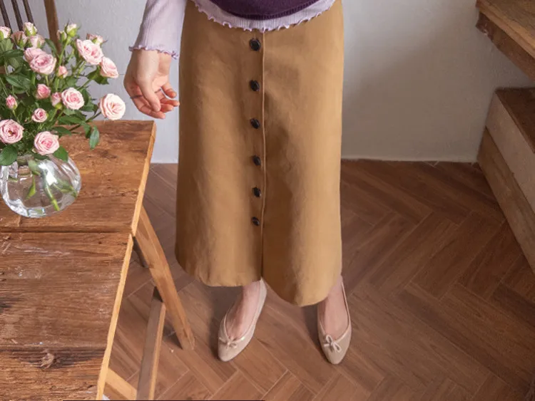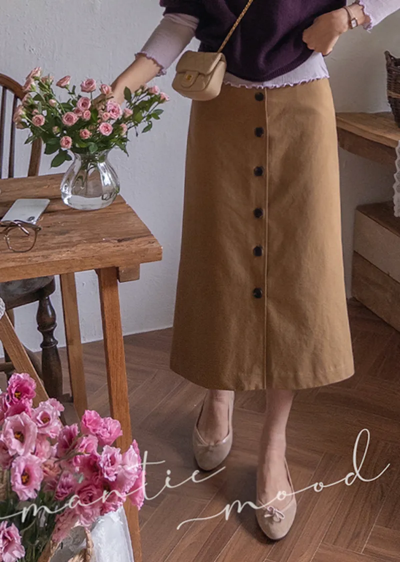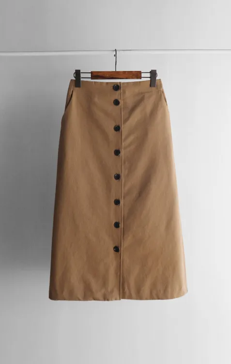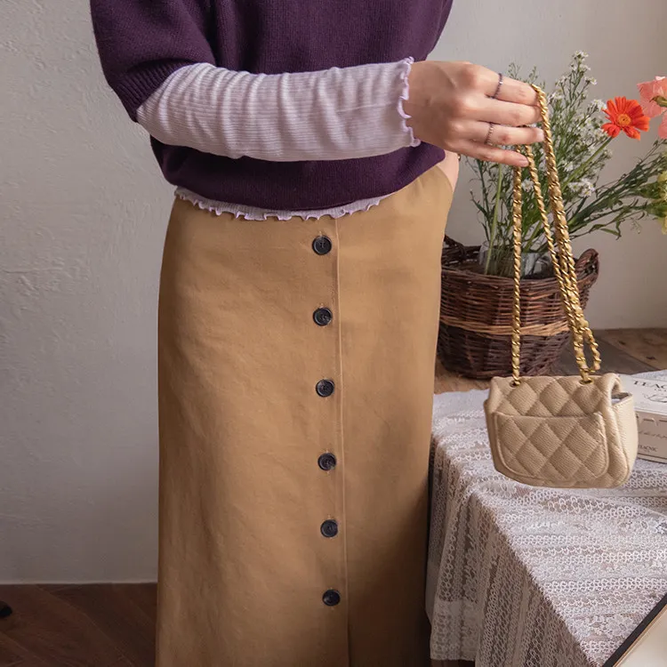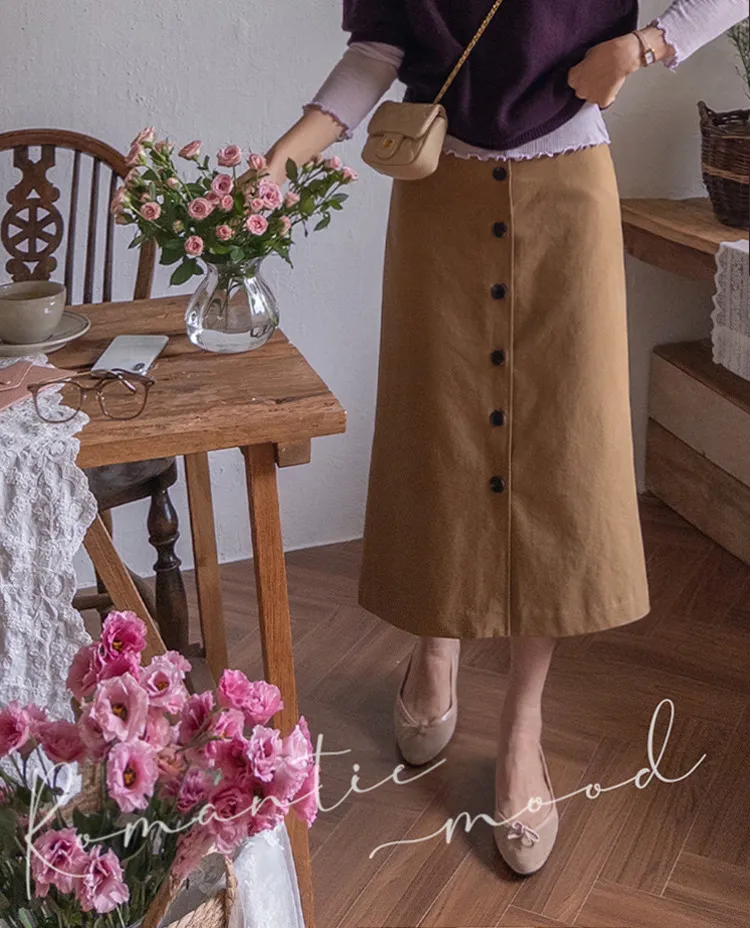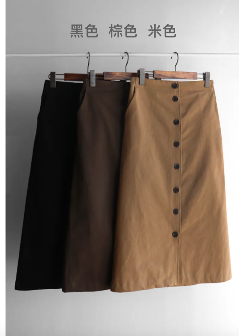 秋天氣息色感點綴前排扣微A字剪裁中長裙