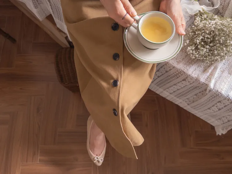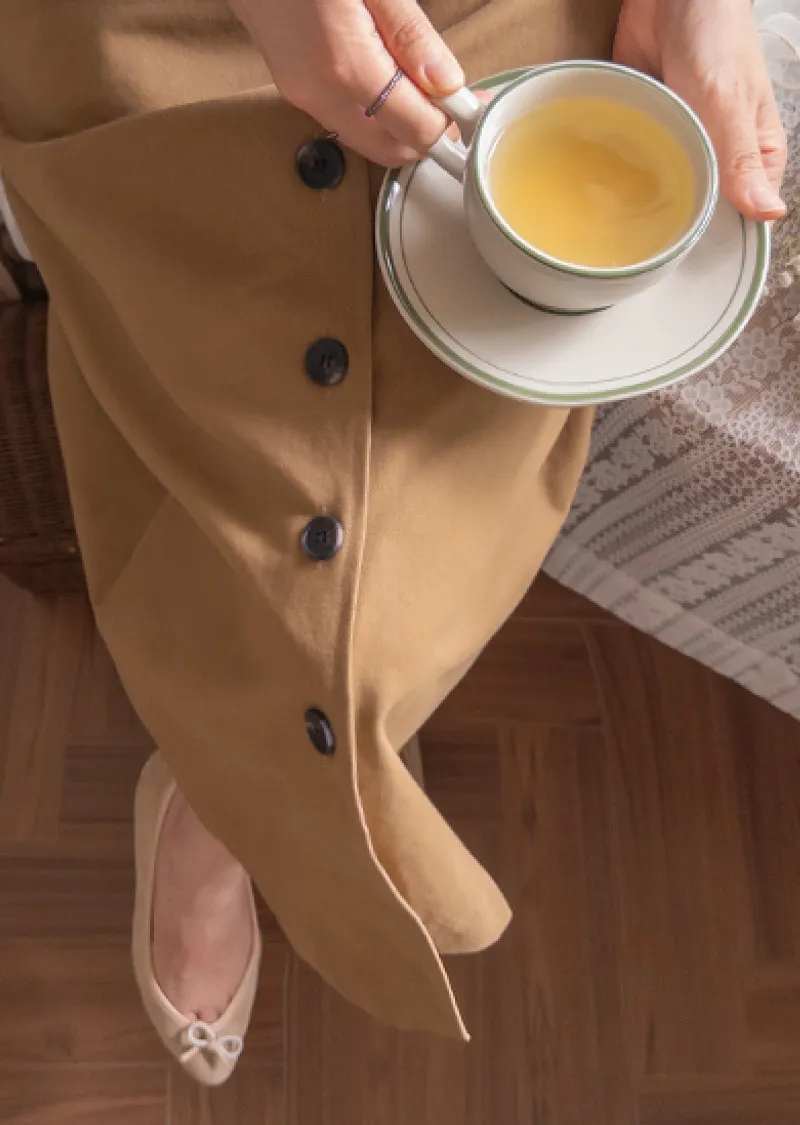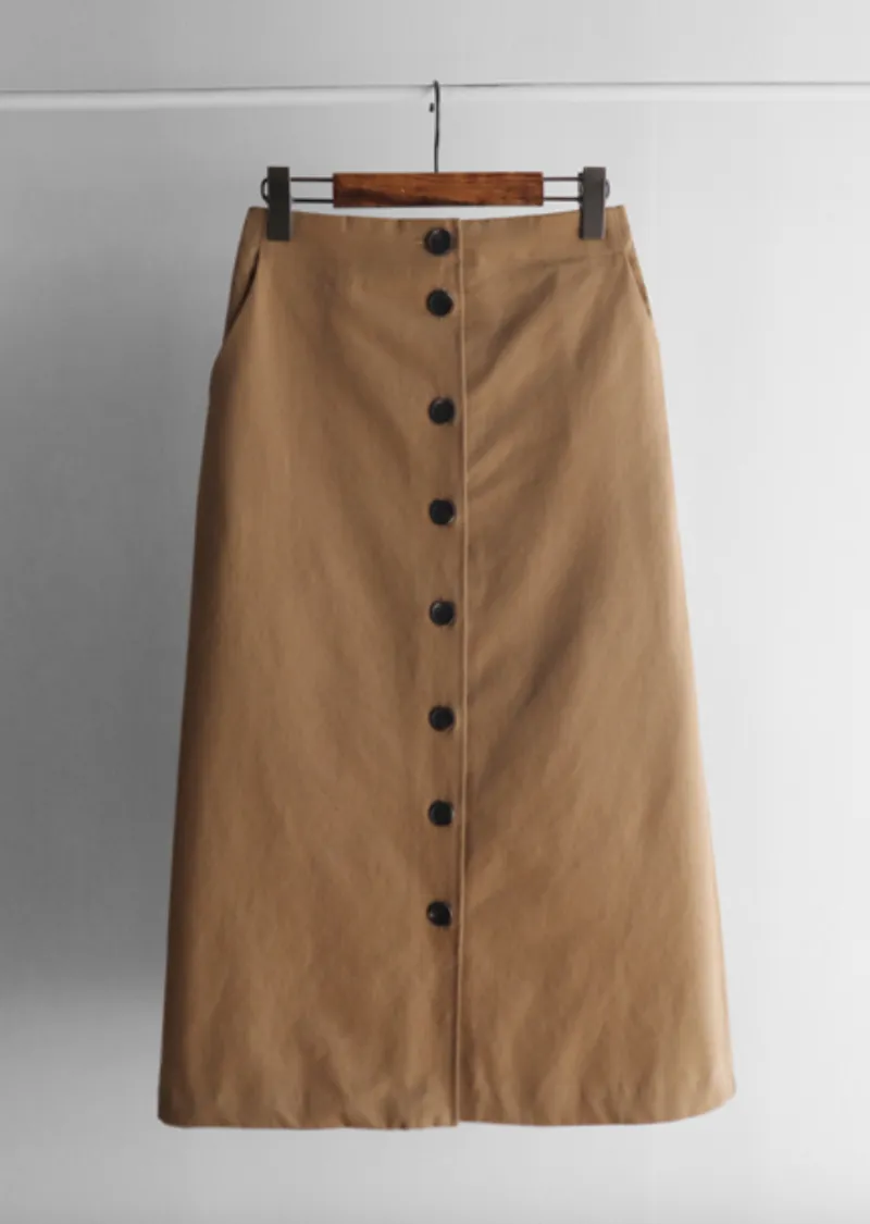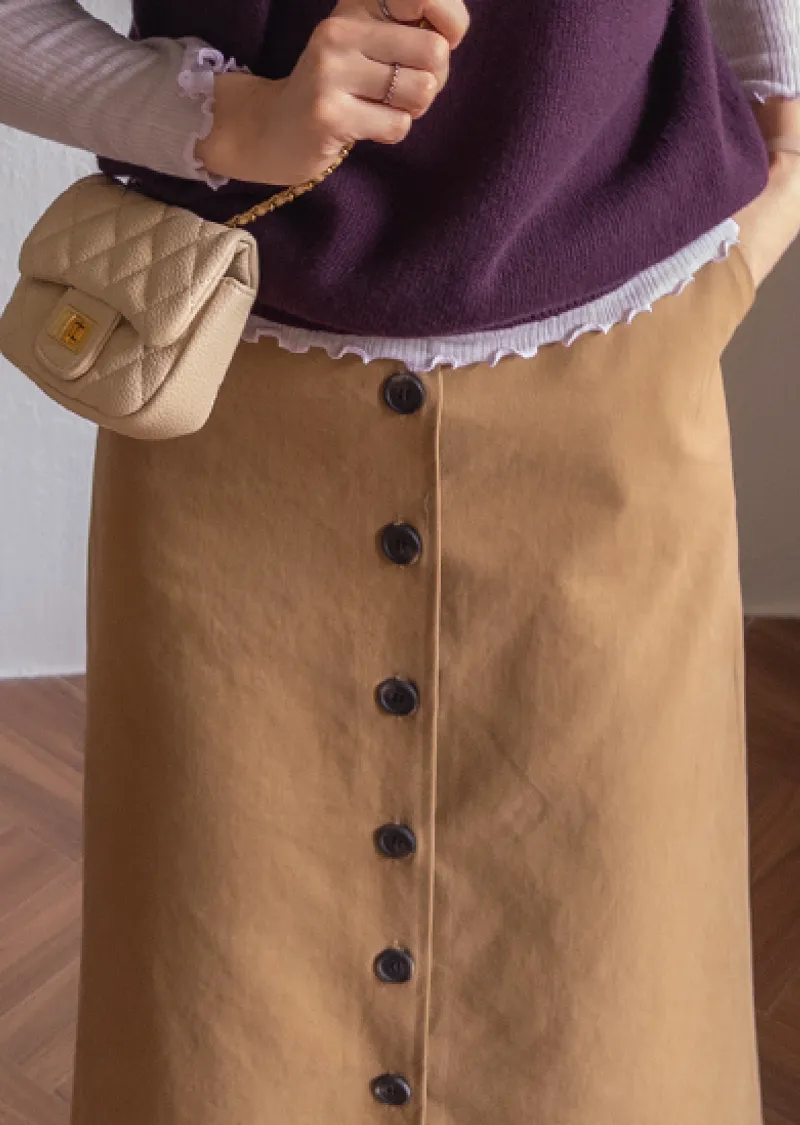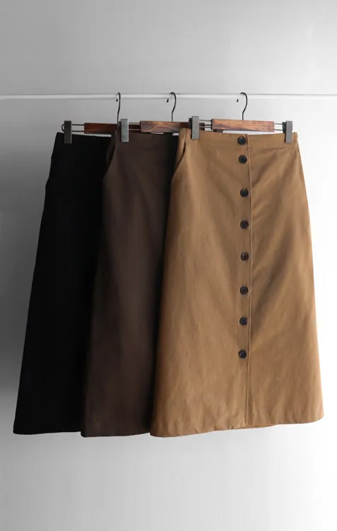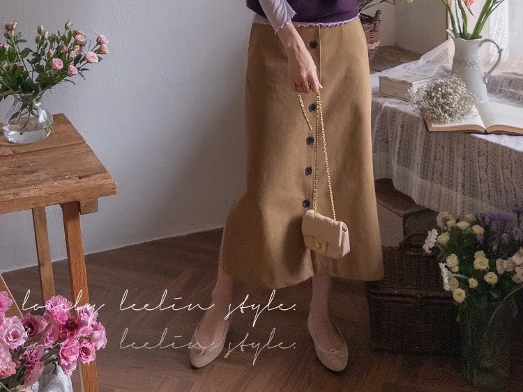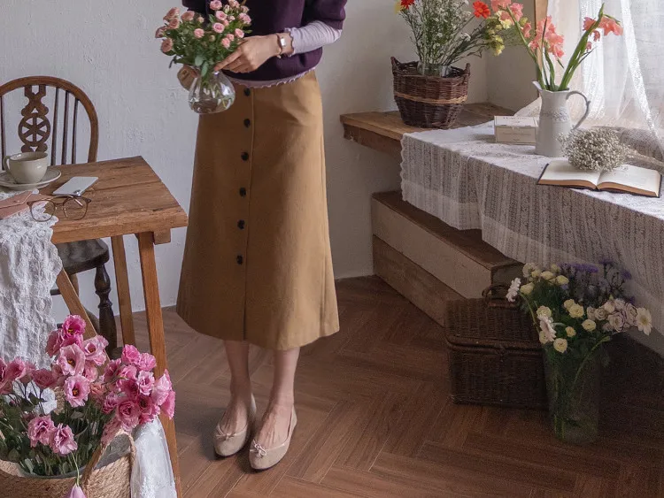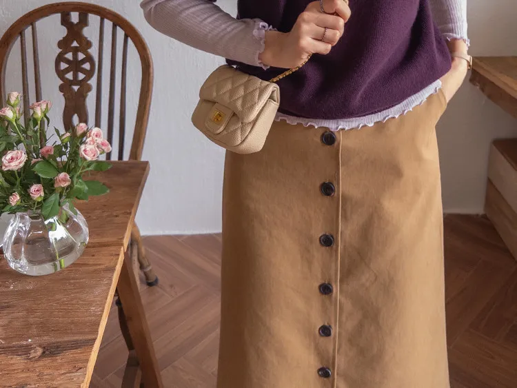 秋天氣息色感點綴前排扣微A字剪裁中長裙