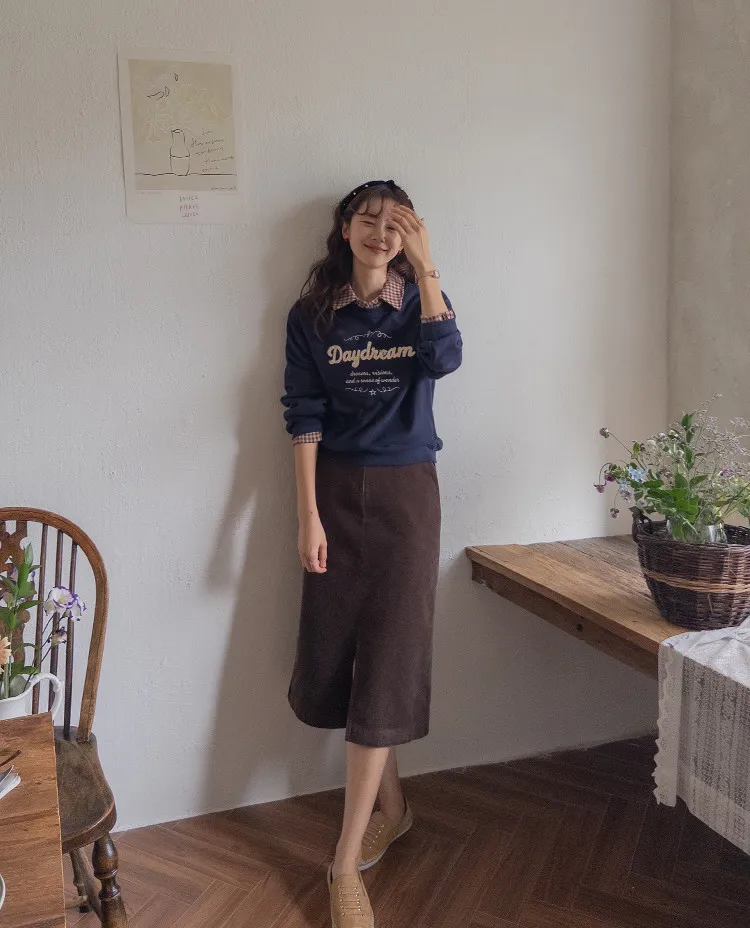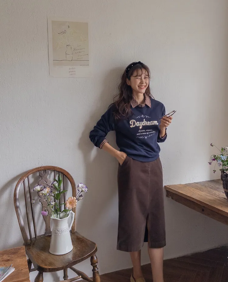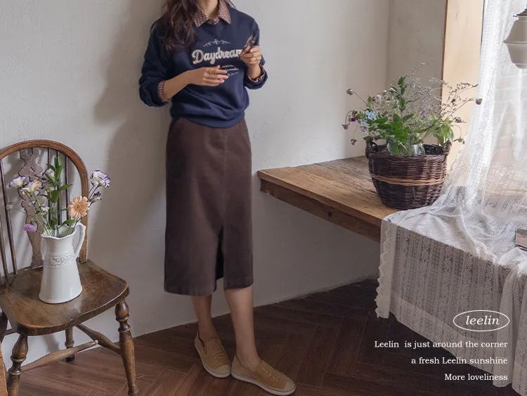 秋冬穿搭燈芯絨H剪裁前開衩中長裙