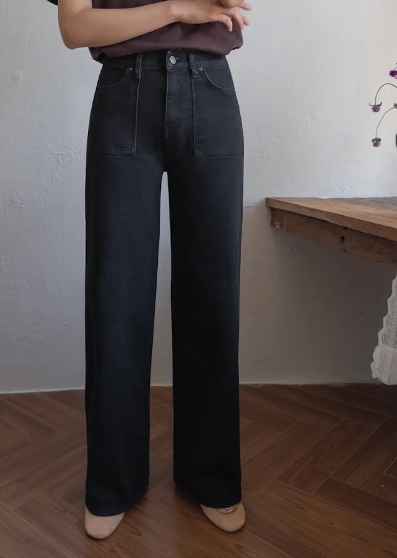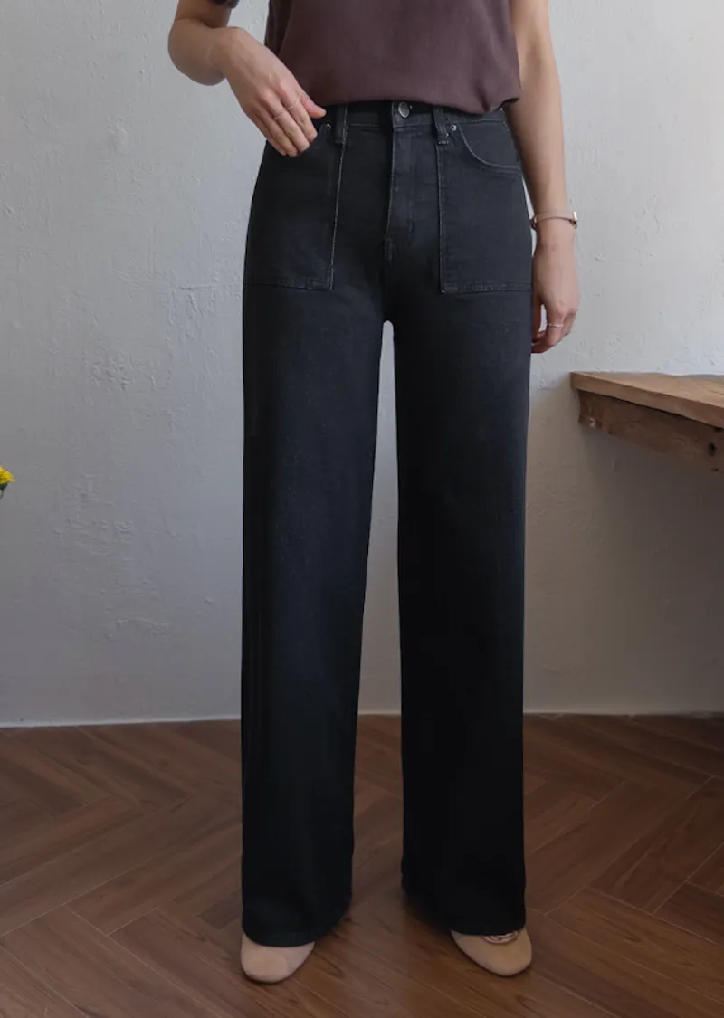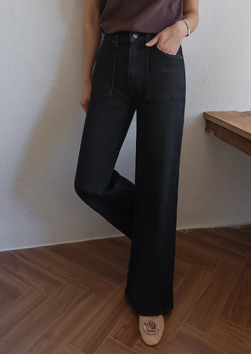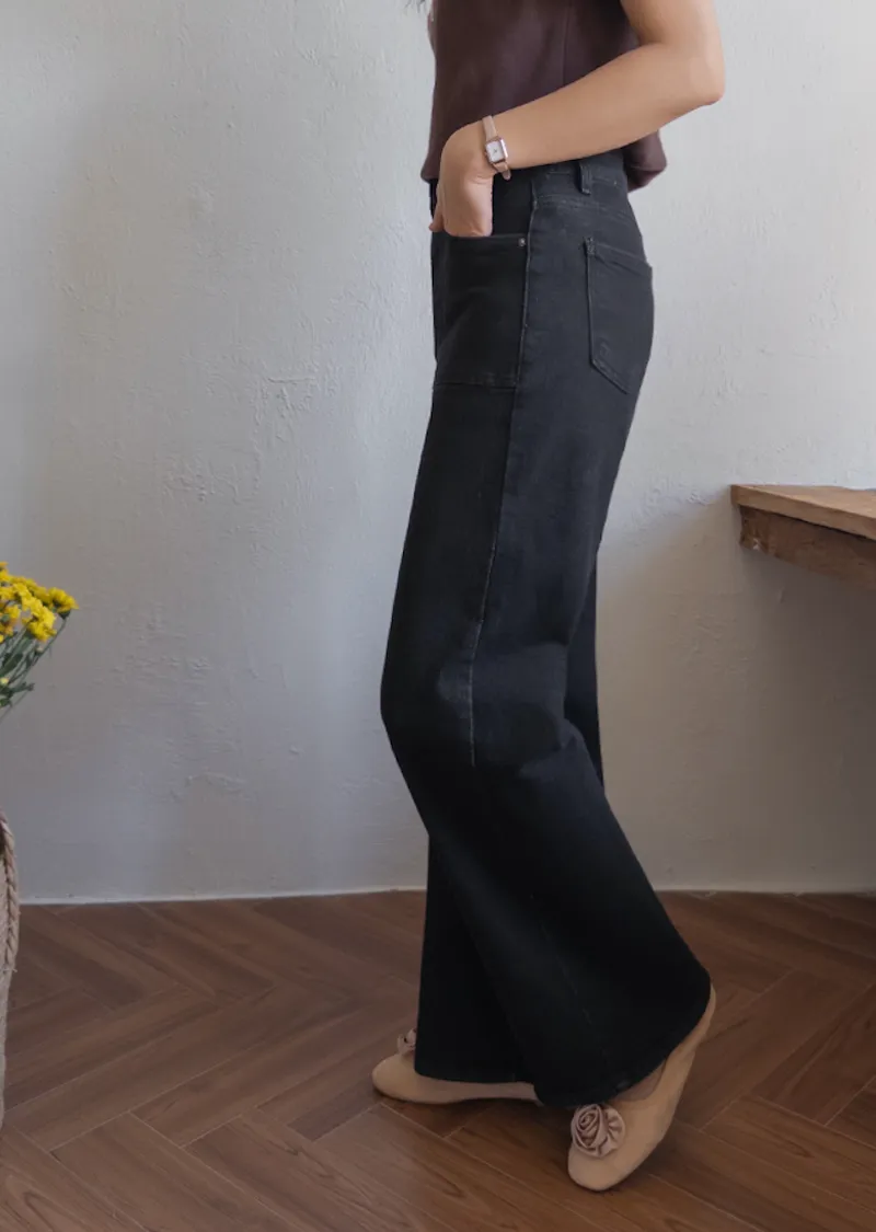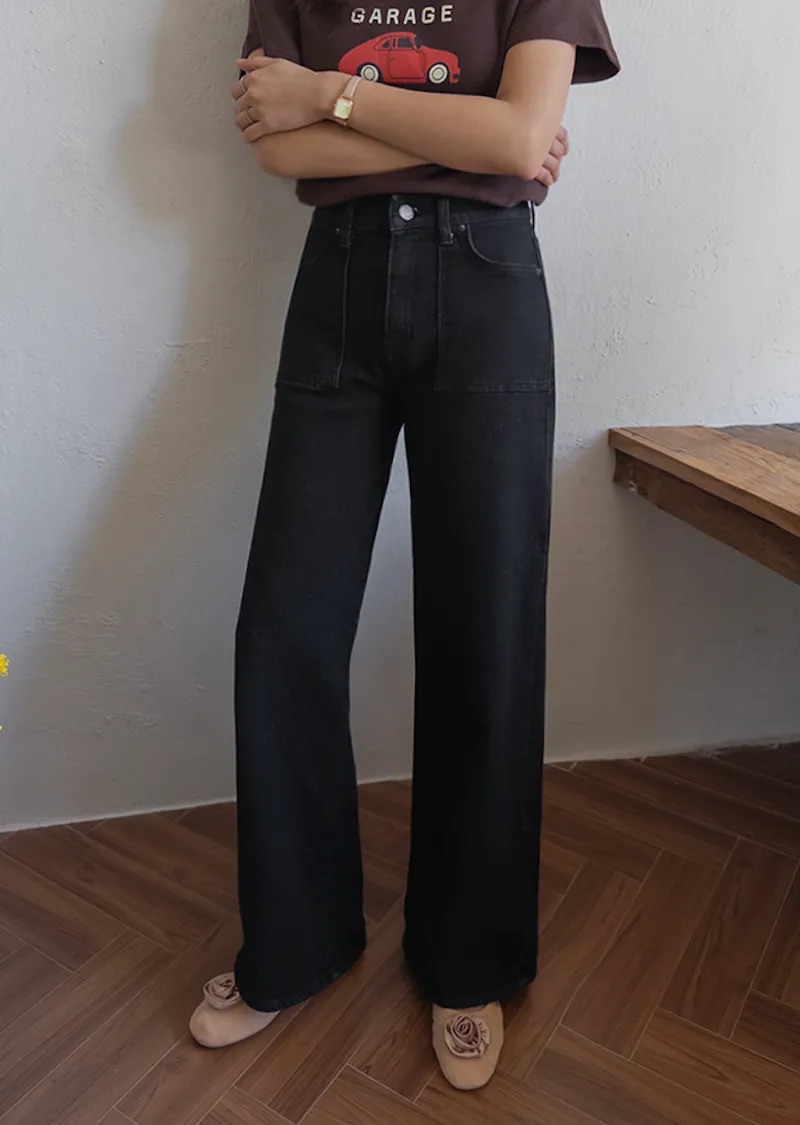 獨特方形口袋舒適修身直筒寬版牛仔褲