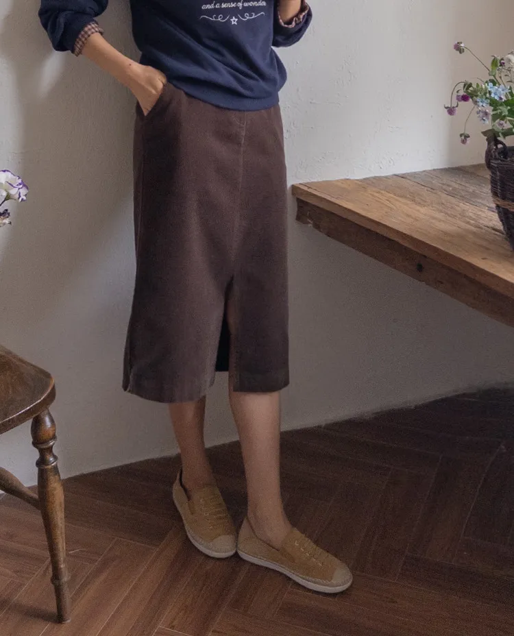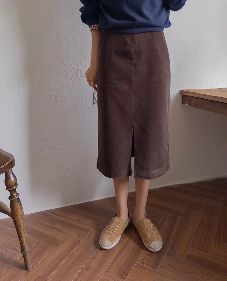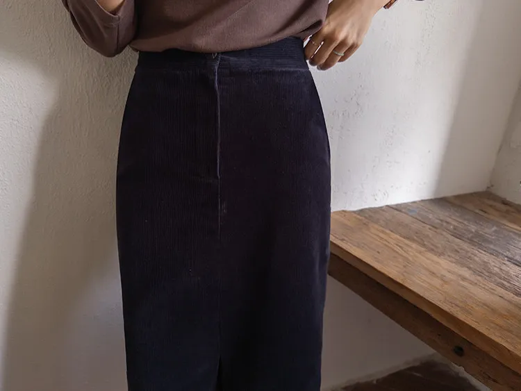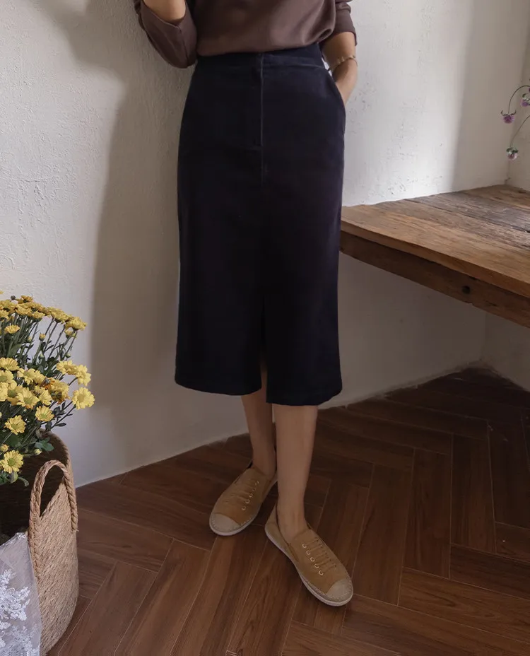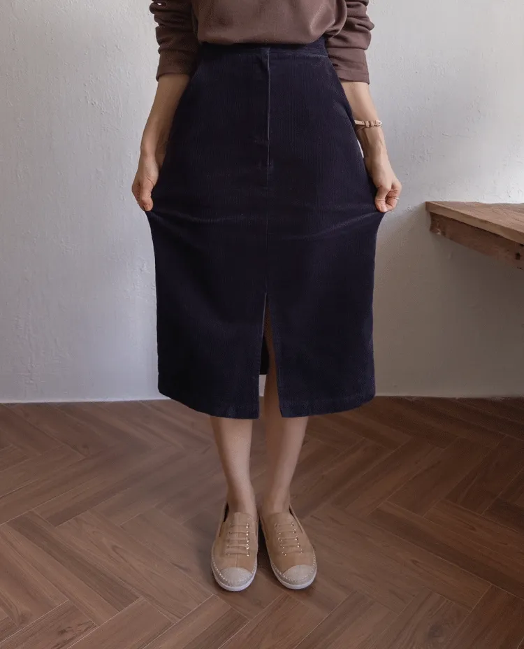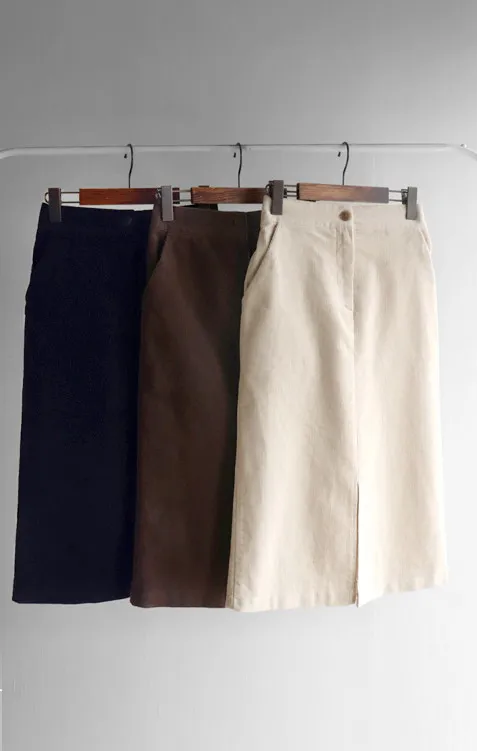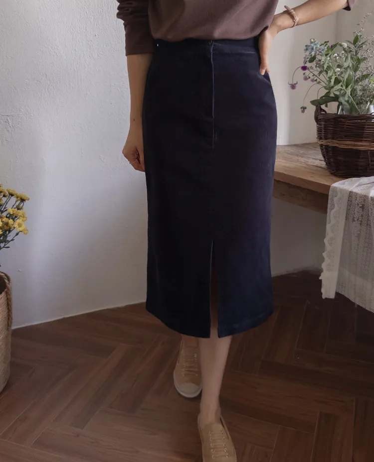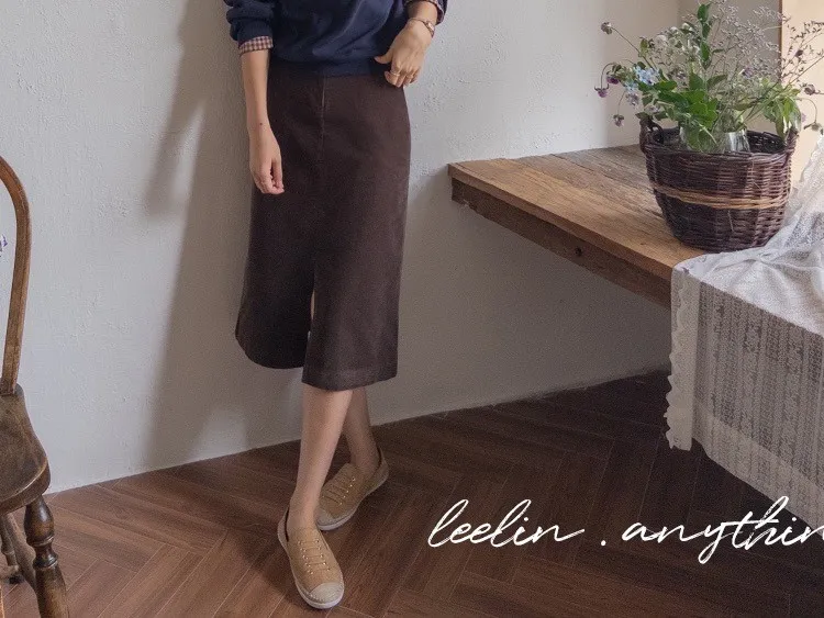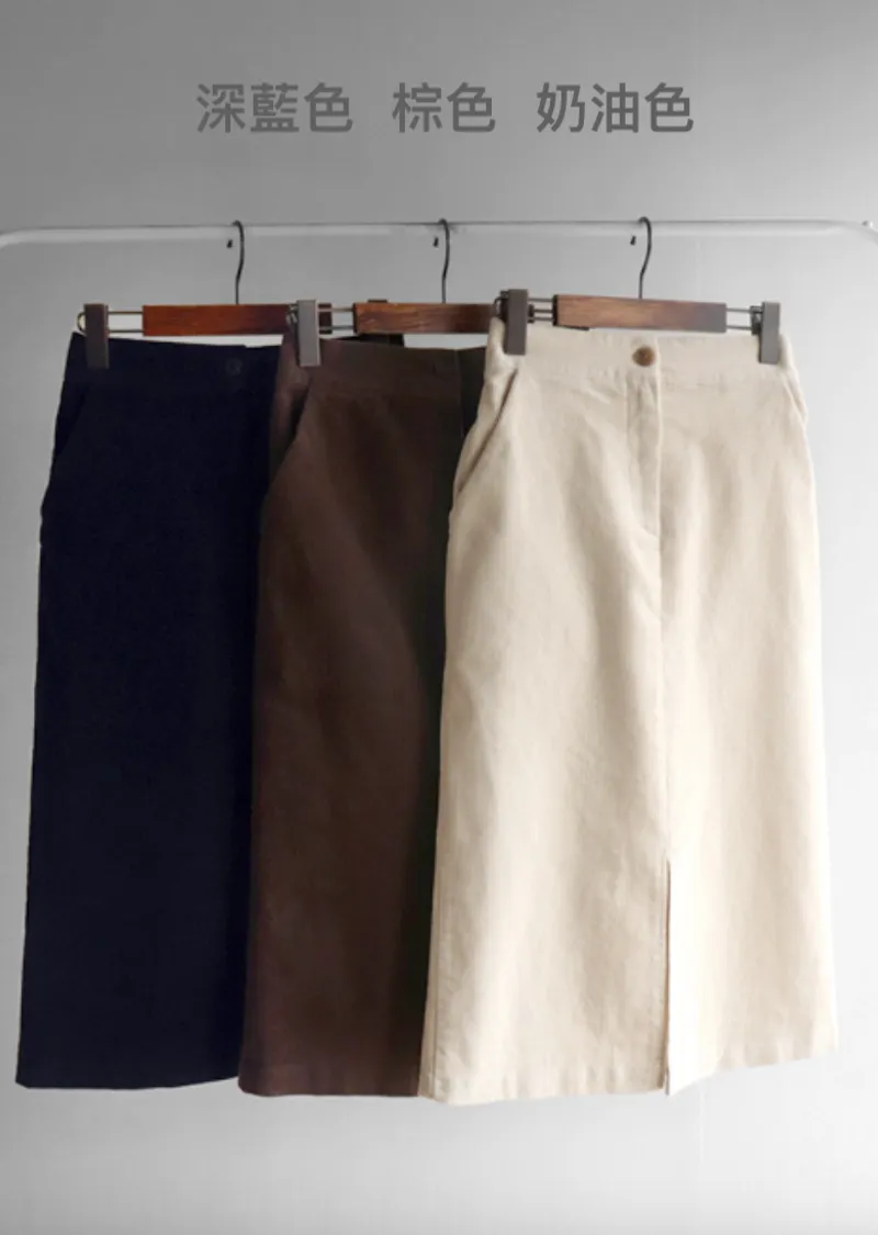 秋冬穿搭燈芯絨H剪裁前開衩中長裙