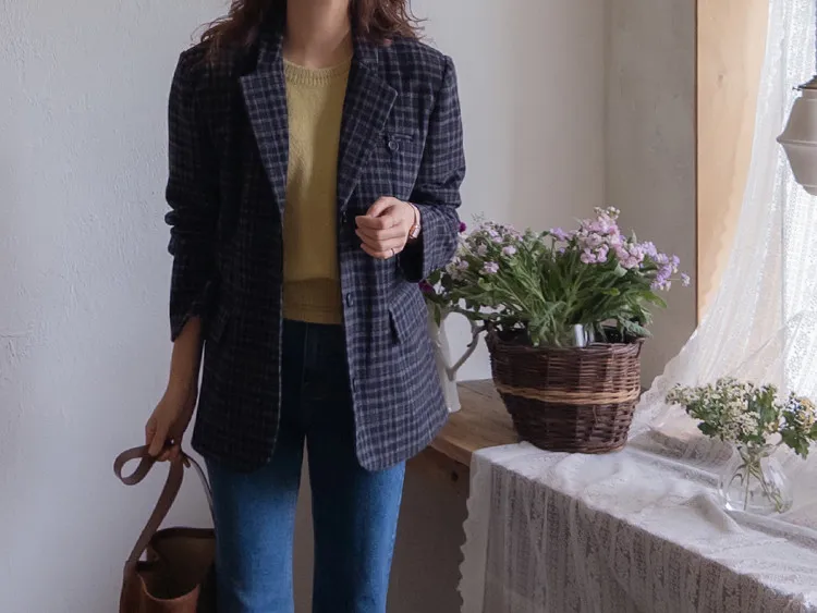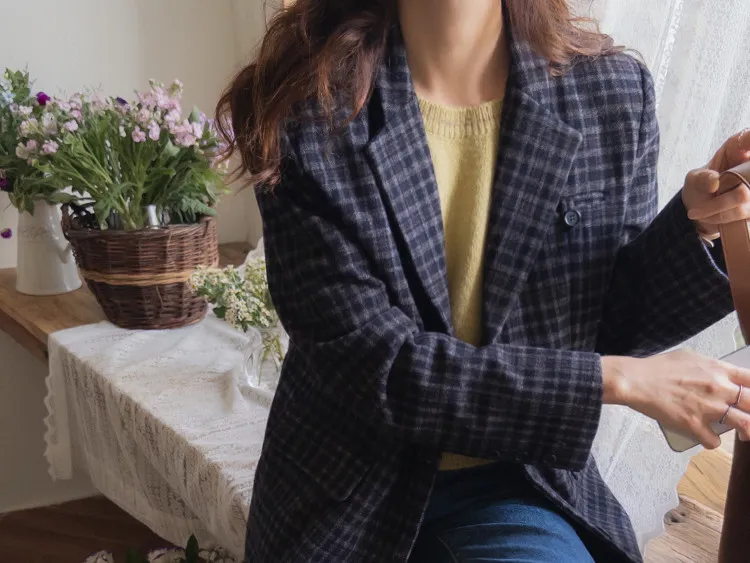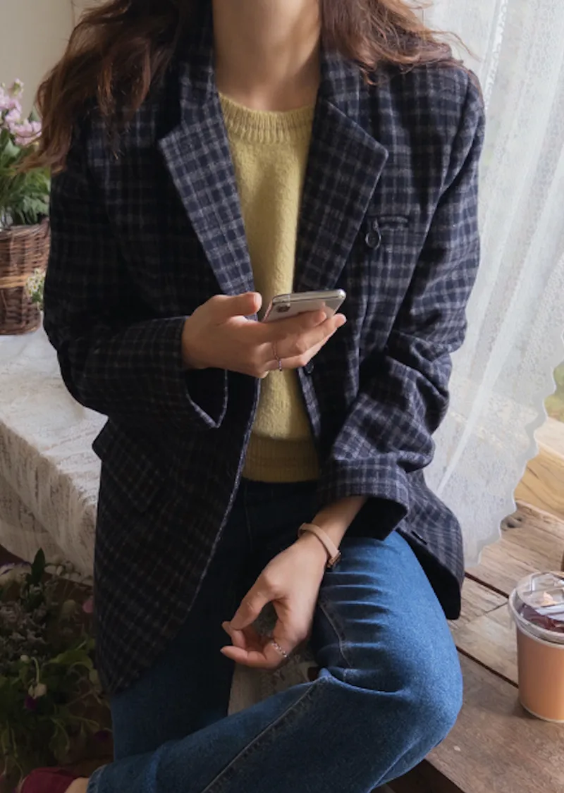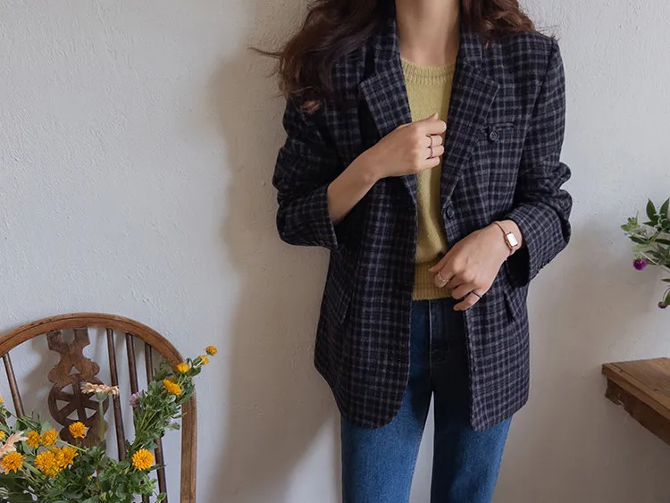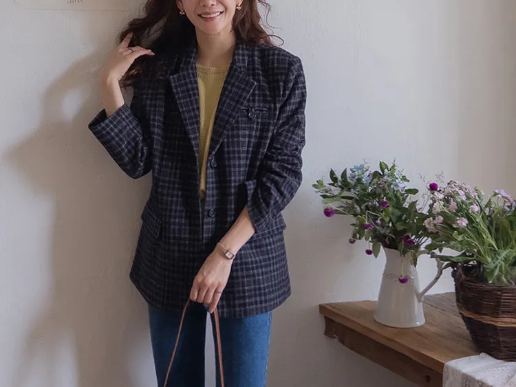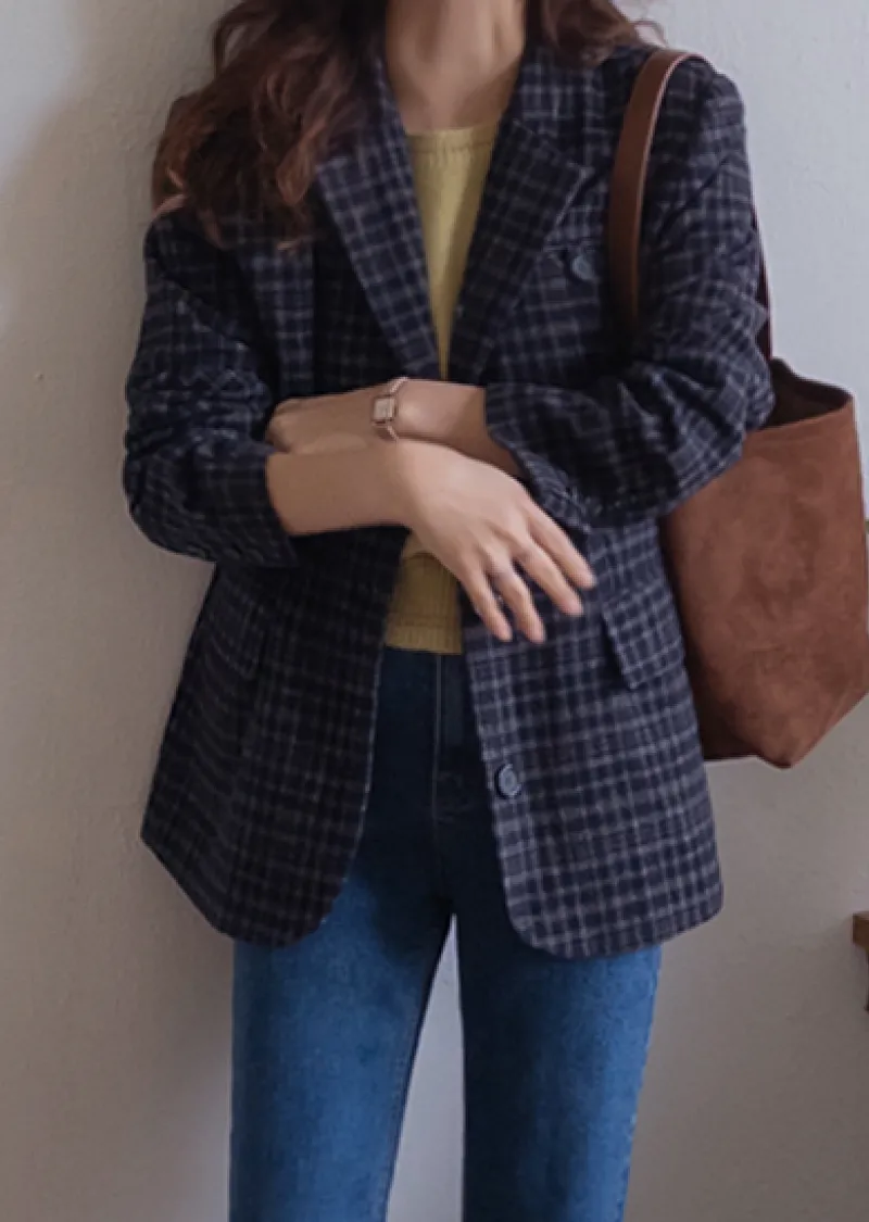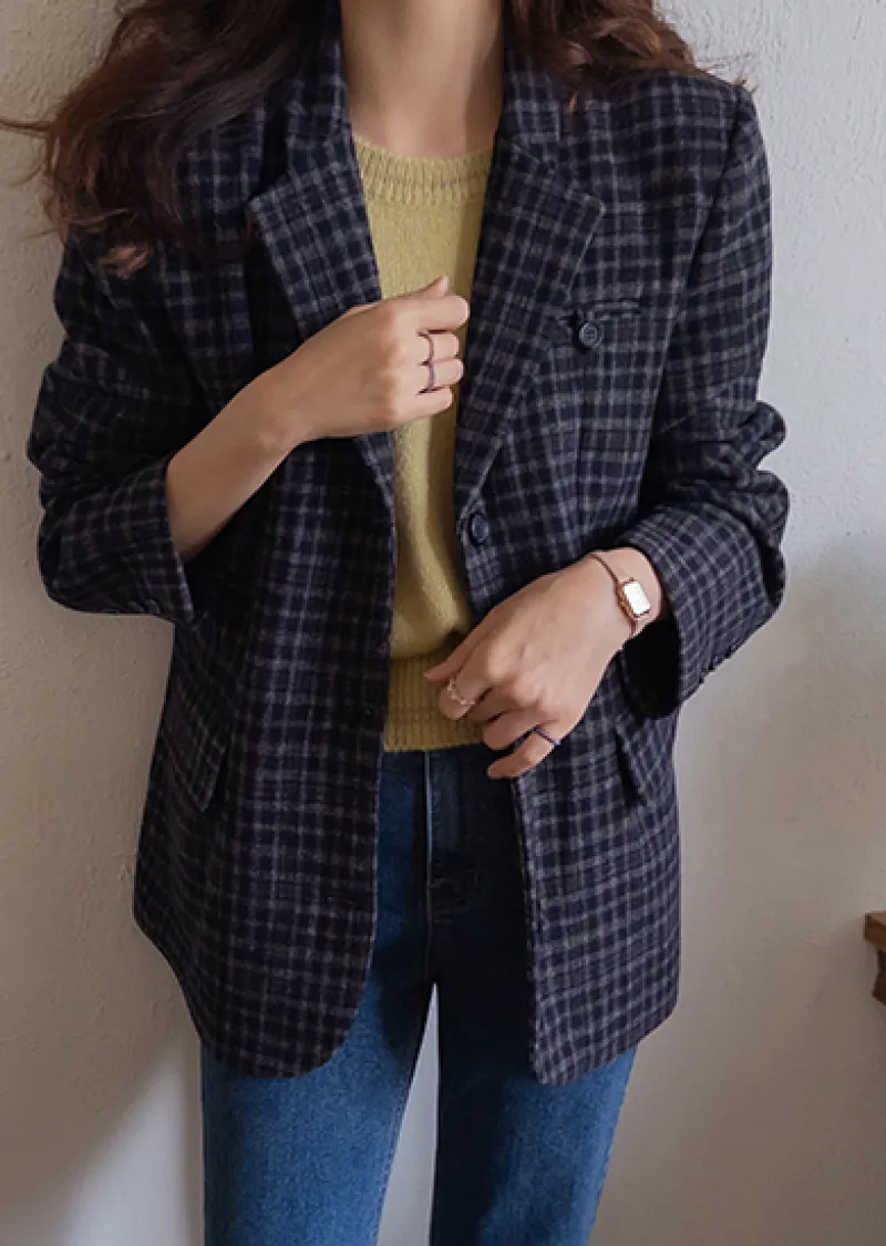 時尚中性魅力經典氛圍羊毛混紡格紋外套