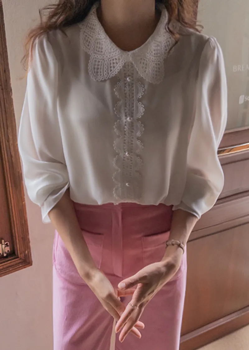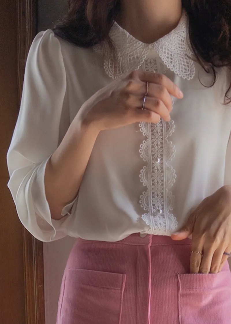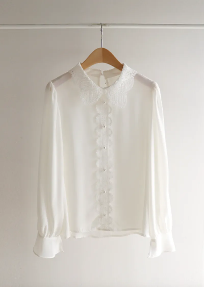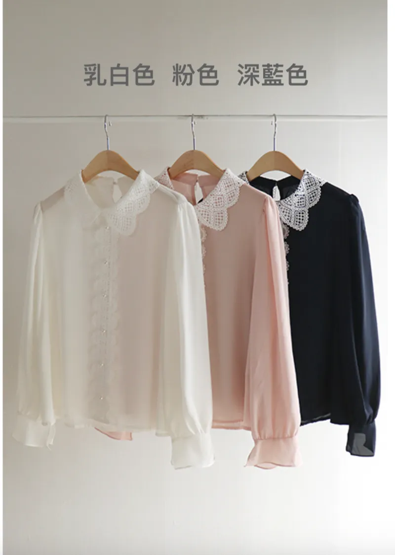浪漫蕾絲細節上衣] [蓬鬆肩線和飄逸的袖子] [絲滑的材質柔軟,更女性化的外觀] [零皺紋!充滿女性氣息! ]