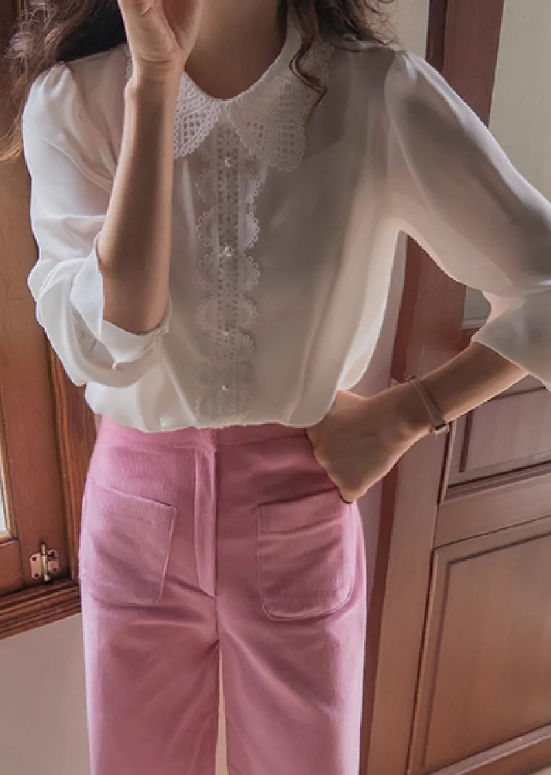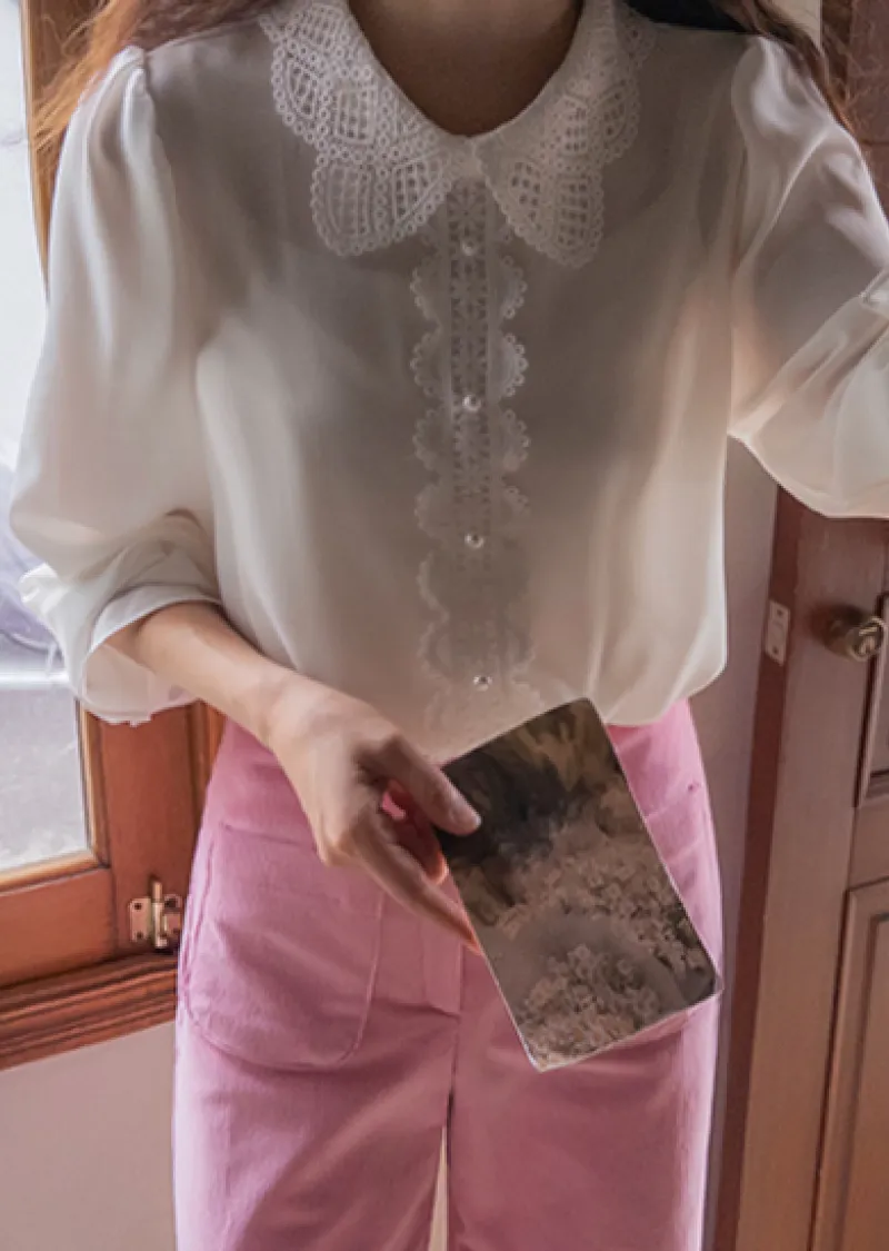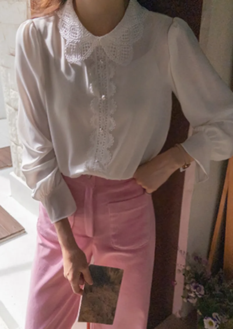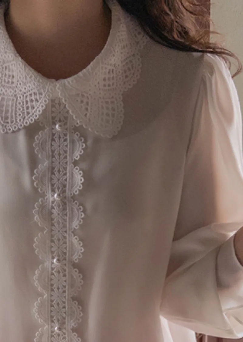 浪漫蕾絲細節上衣] [蓬鬆肩線和飄逸的袖子] [絲滑的材質柔軟,更女性化的外觀] [零皺紋!充滿女性氣息! ]