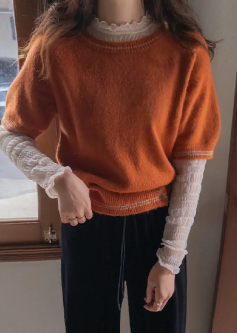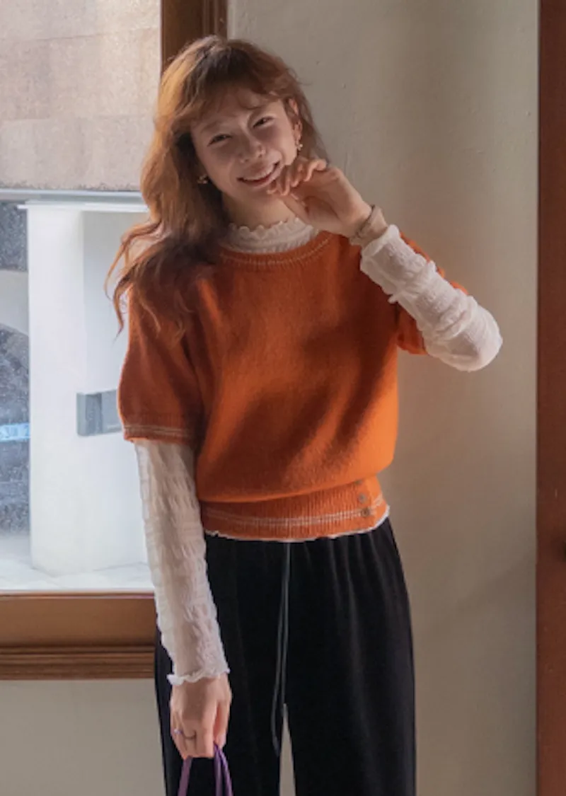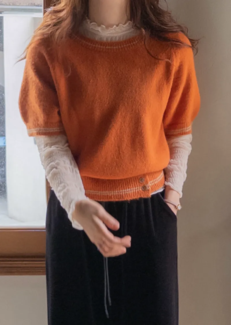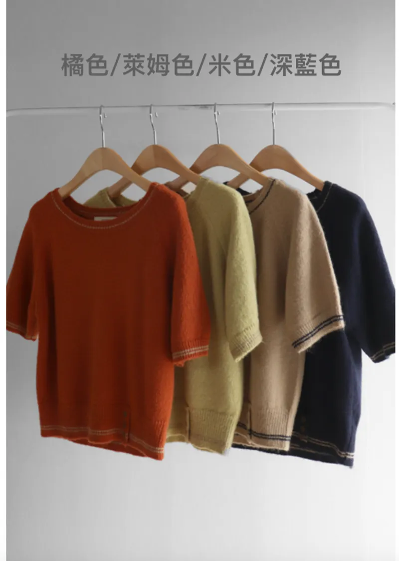 獨特配色線邊點綴下擺鈕扣短袖針織上衣