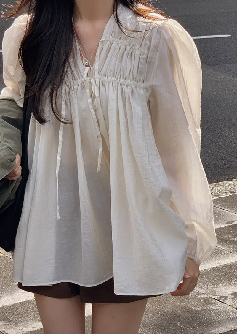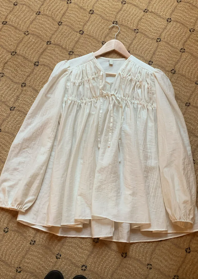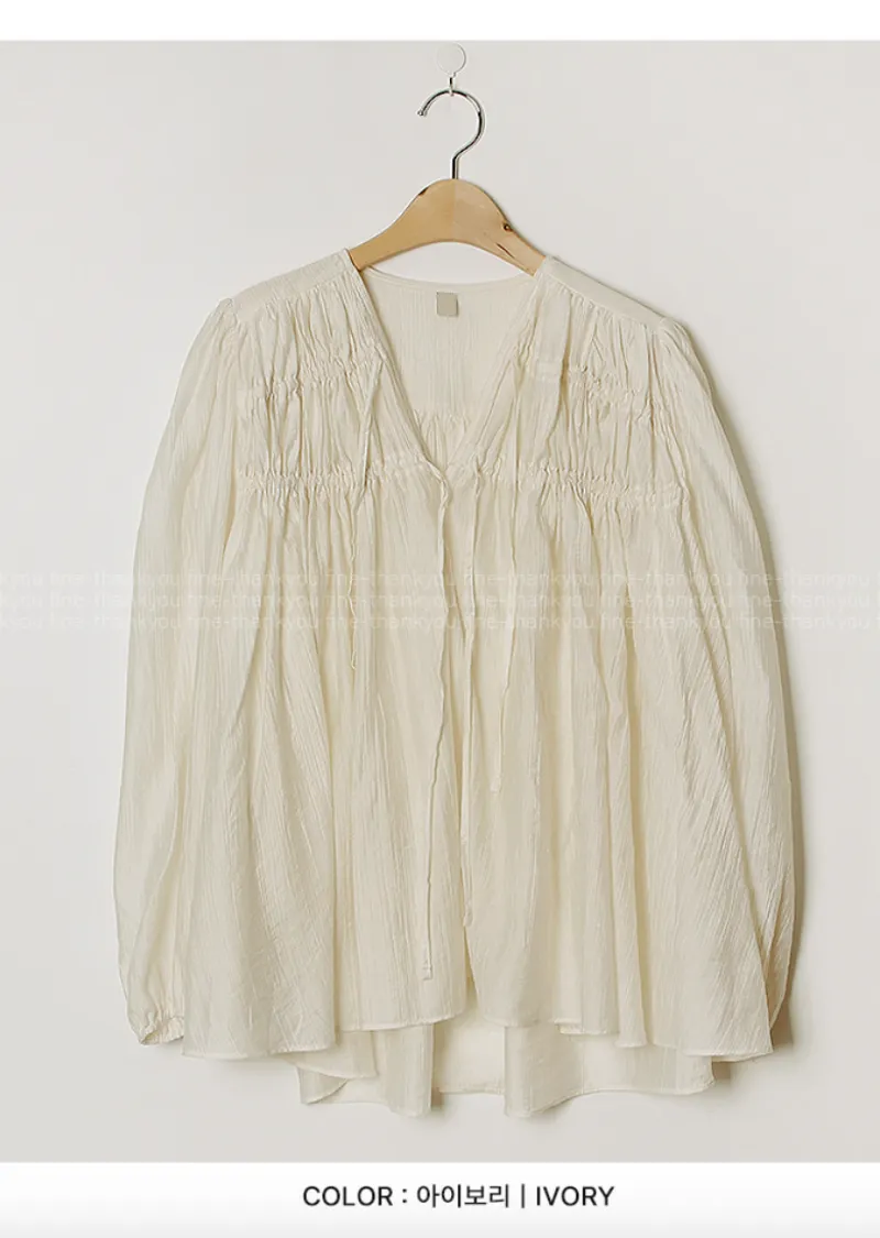 具有復古輪廓的可愛上衣 :)呈現出褶皺輪廓♡ 胸前綁帶可以用絲帶結打開和關閉 ,增添了更女性化的感覺 :) 傘擺形的剪裁不僅塑造了女性化的輪廓 ,而且還遮蓋了身形, 穿著舒適-! 泡泡袖使它更加女性化, 具有復古可愛感覺的少見設計 :)