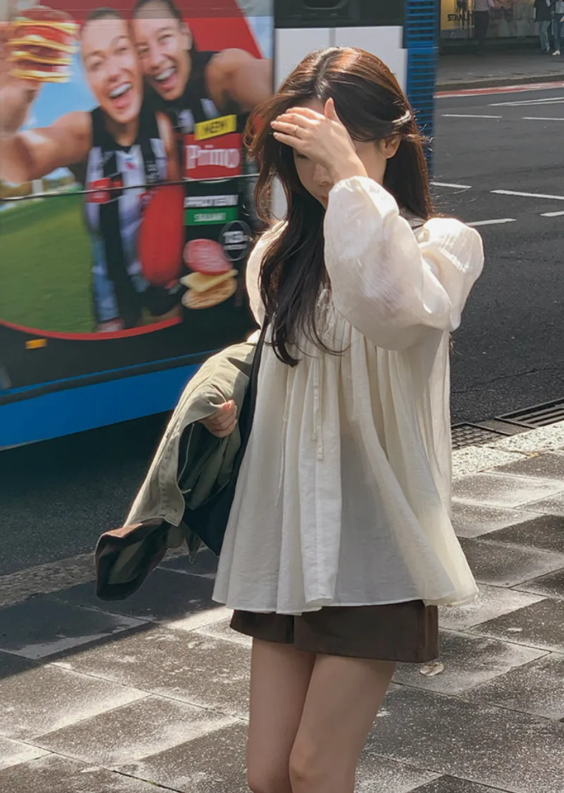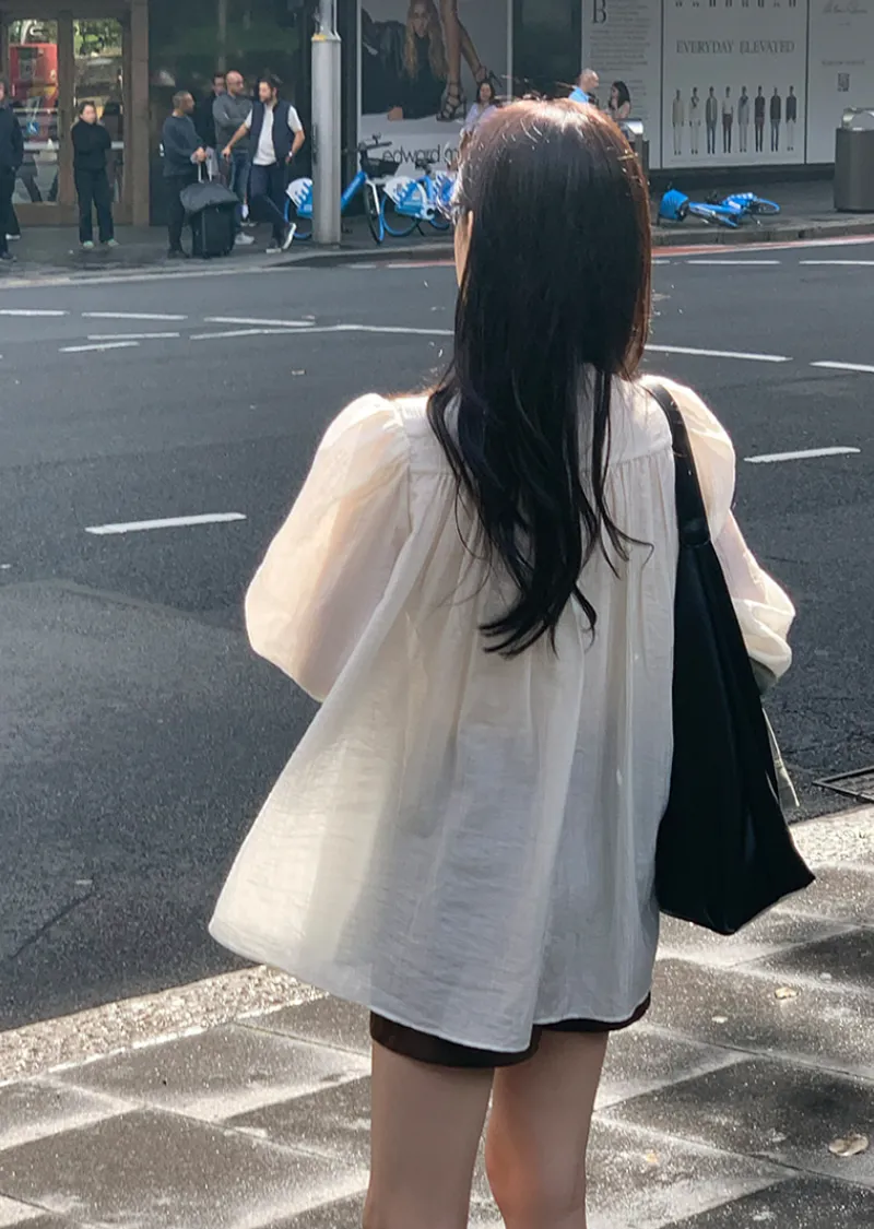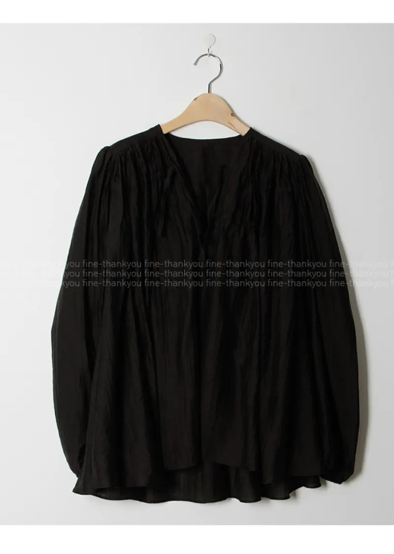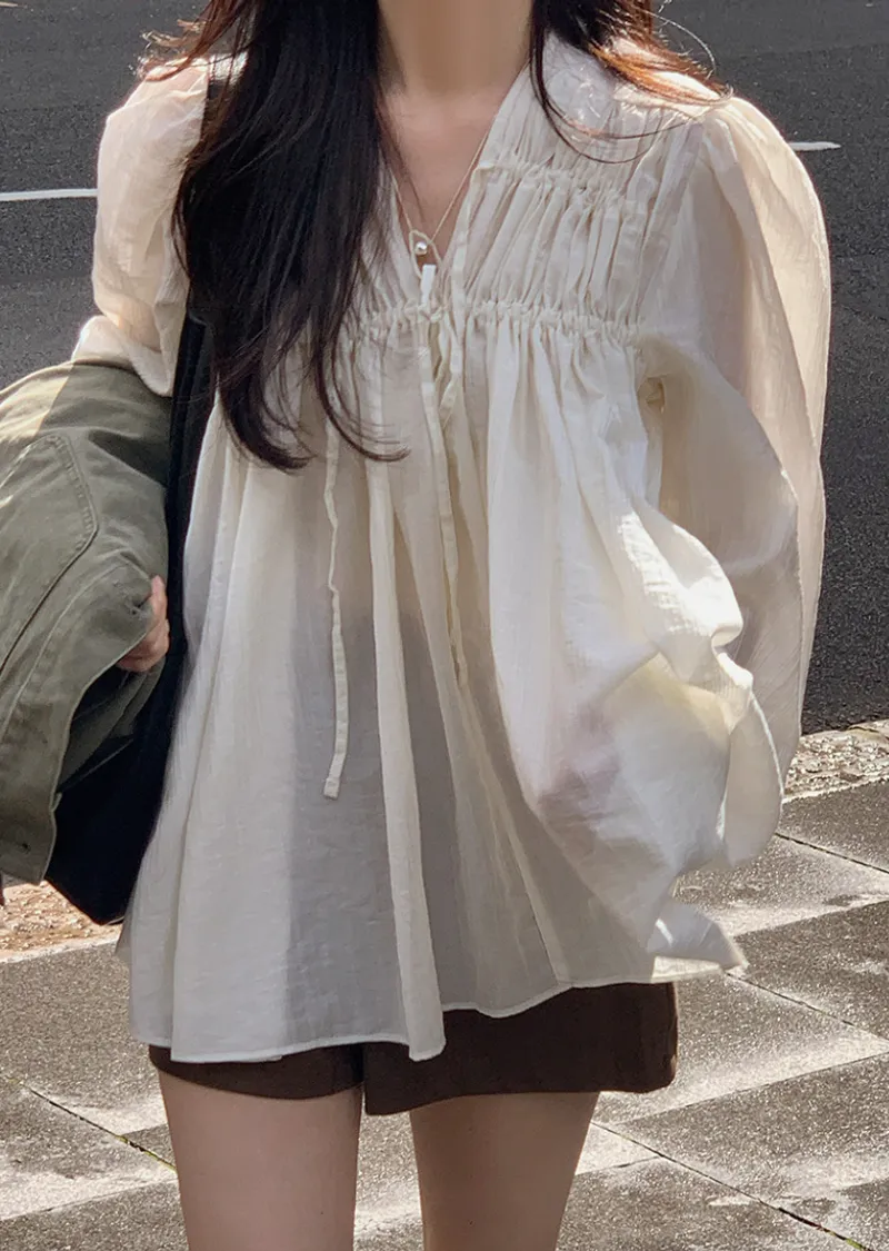 具有復古輪廓的可愛上衣 :)呈現出褶皺輪廓♡ 胸前綁帶可以用絲帶結打開和關閉 ,增添了更女性化的感覺 :) 傘擺形的剪裁不僅塑造了女性化的輪廓 ,而且還遮蓋了身形, 穿著舒適-! 泡泡袖使它更加女性化, 具有復古可愛感覺的少見設計 :)