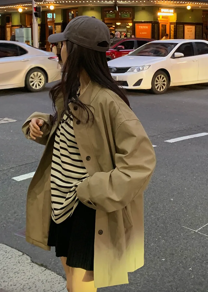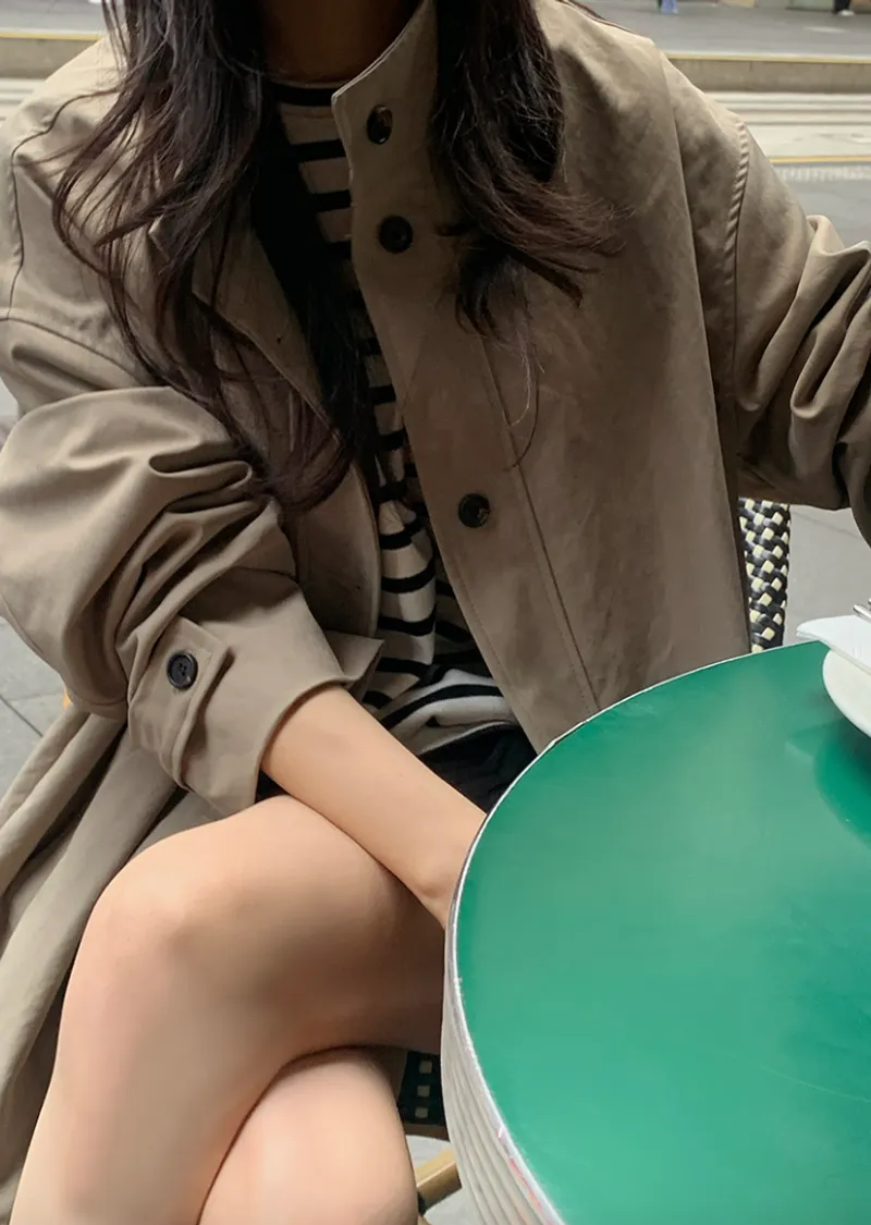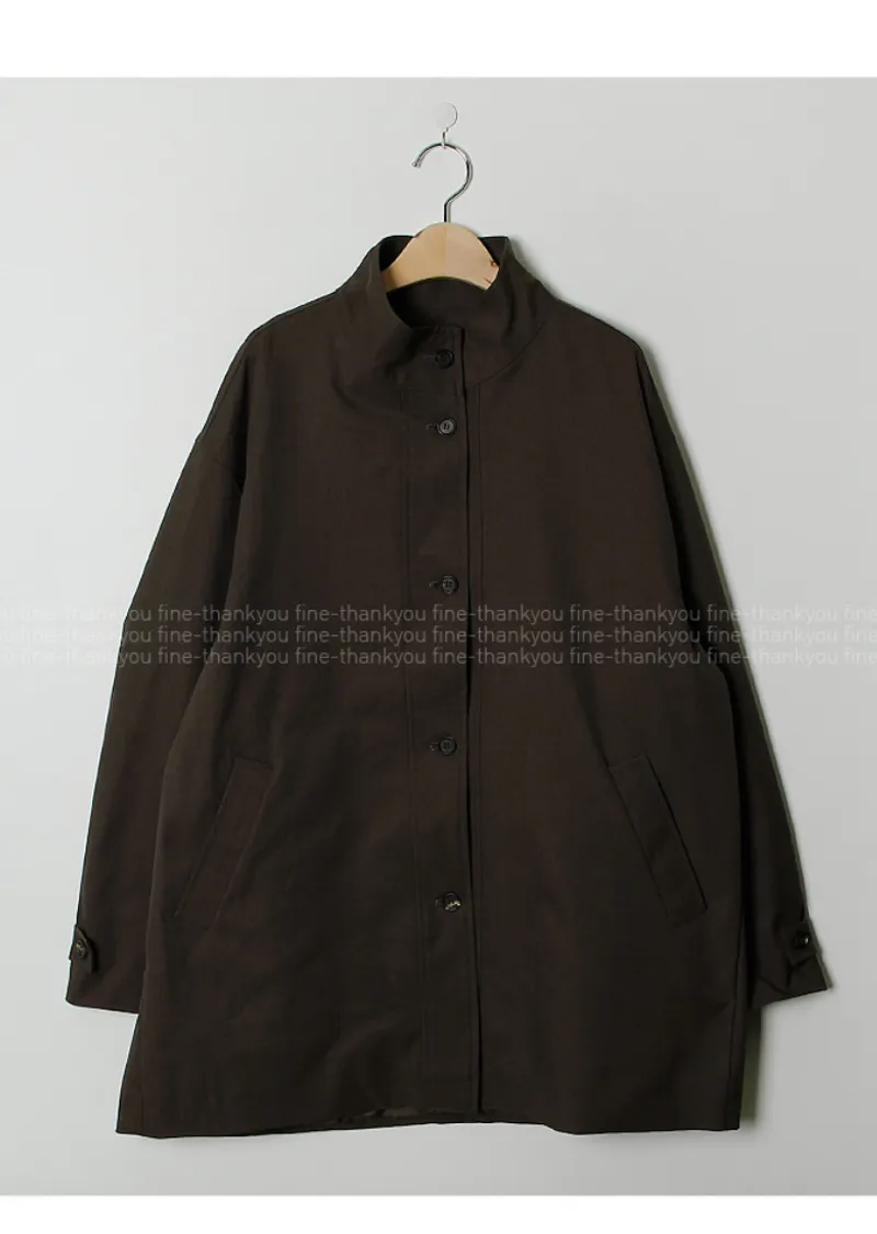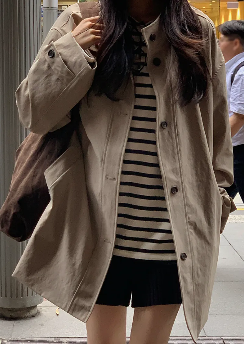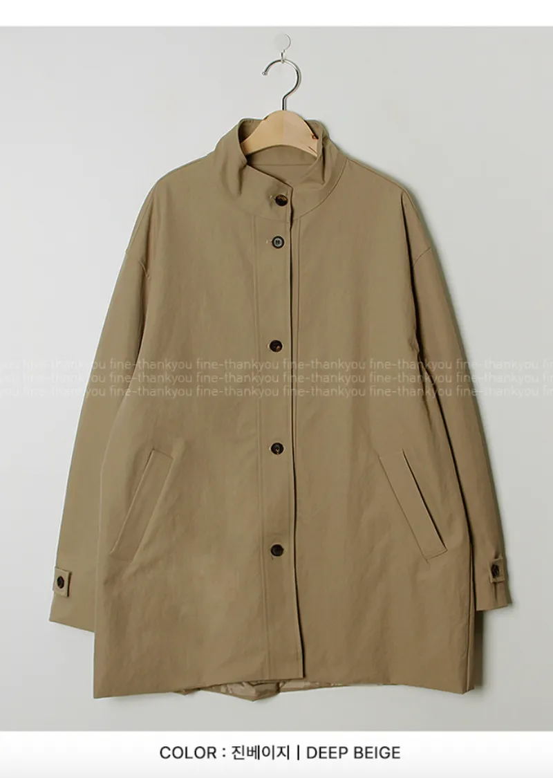 一件休閒的外套:)寬鬆的版型,長度蓋過臀部,適合任何身材!是換季時的絕佳外套。口袋提供充足的儲物空間和實用性,跳色的開合紐扣更增添了一絲微妙的質感 :)像風衣一樣沙沙作響的材質非常適合寒冷多風的日子,略高的領口設計讓它成為溫差較大的換季時必備單品 ,遮蓋頸部。看起來像是夾克和大衣混合的設計,顏色柔和,非常適合秋冬季節的日常穿著 :)