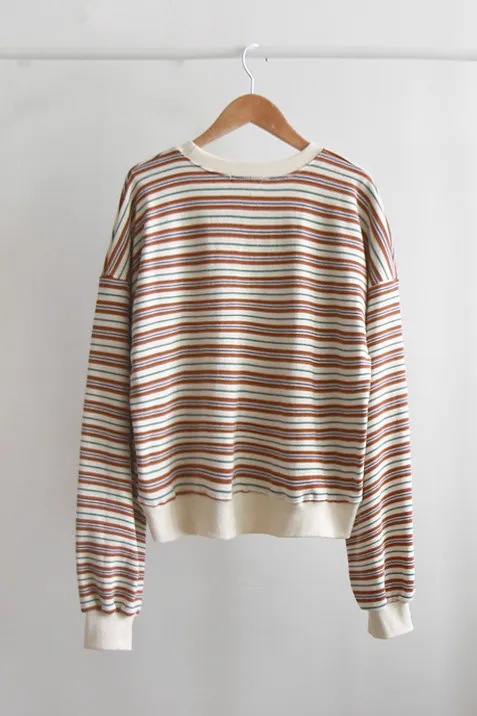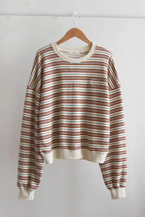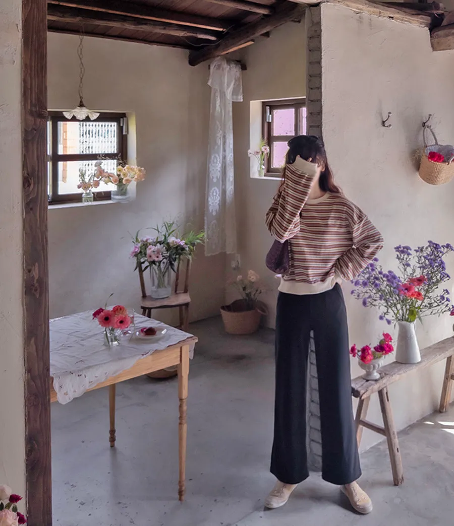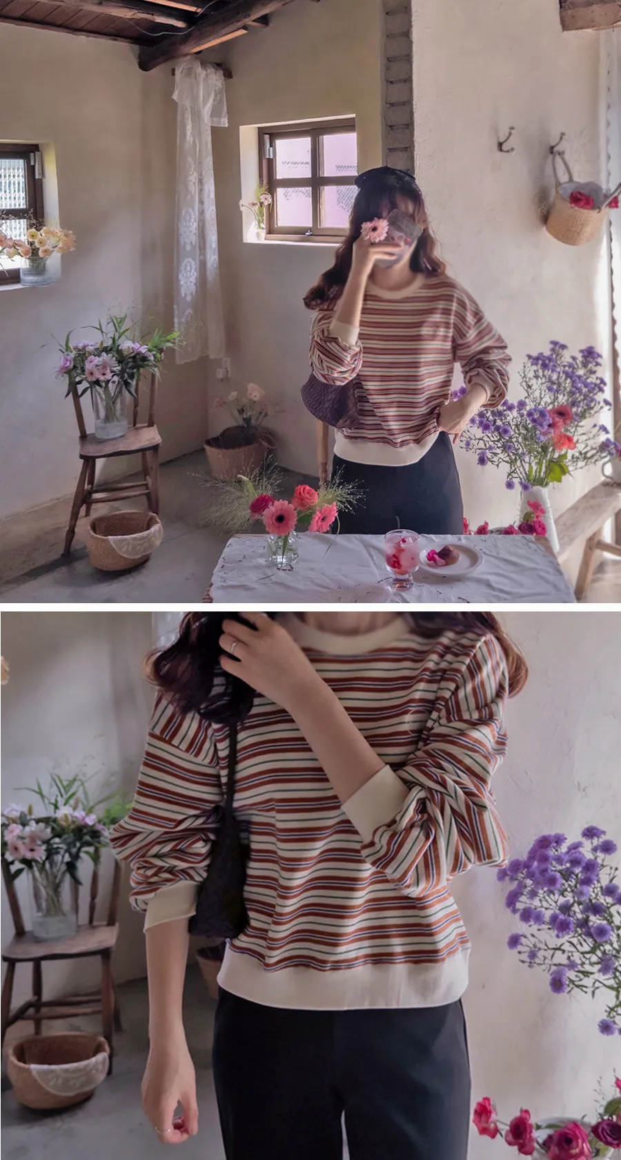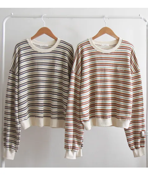 秋季百搭色彩條紋點綴字母刺繡穿搭上衣
