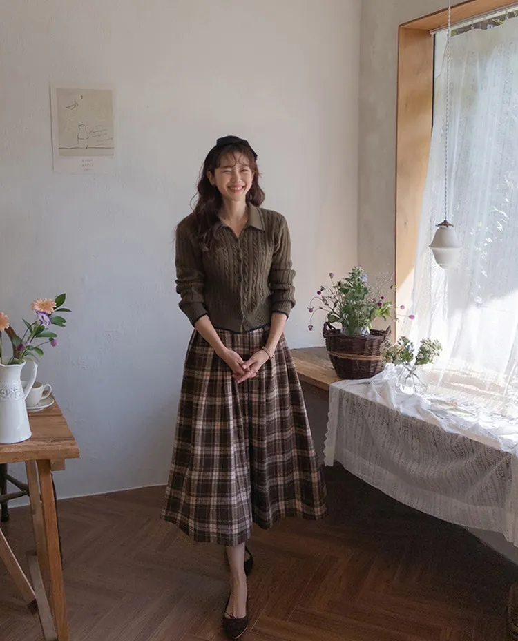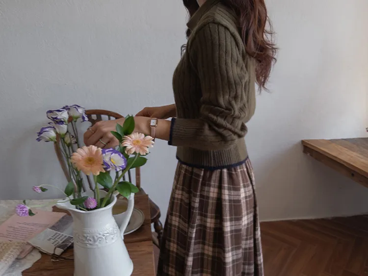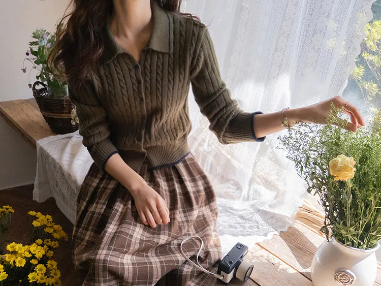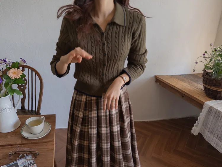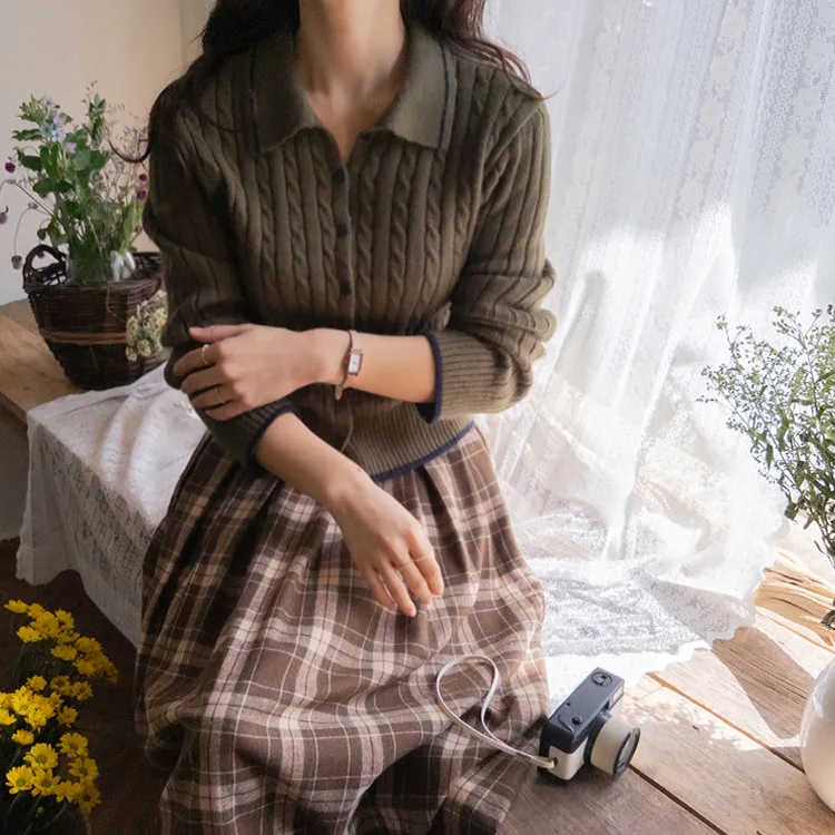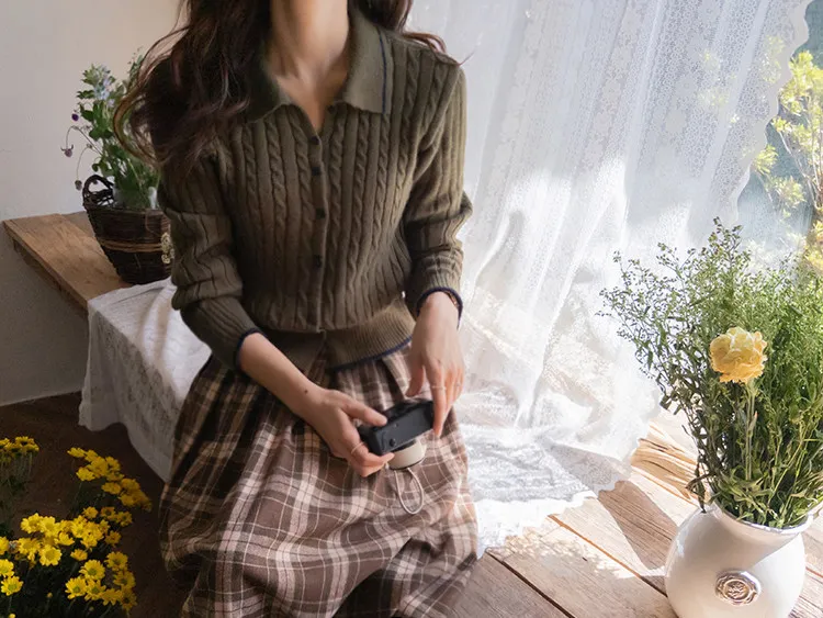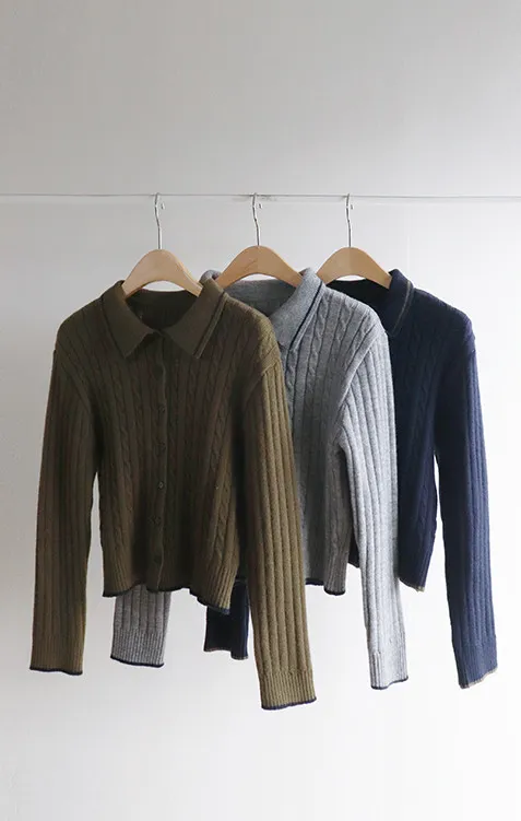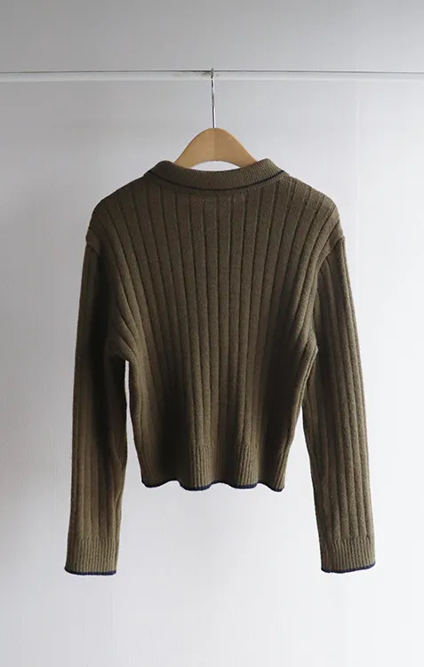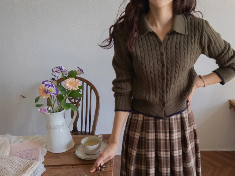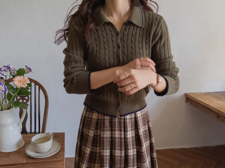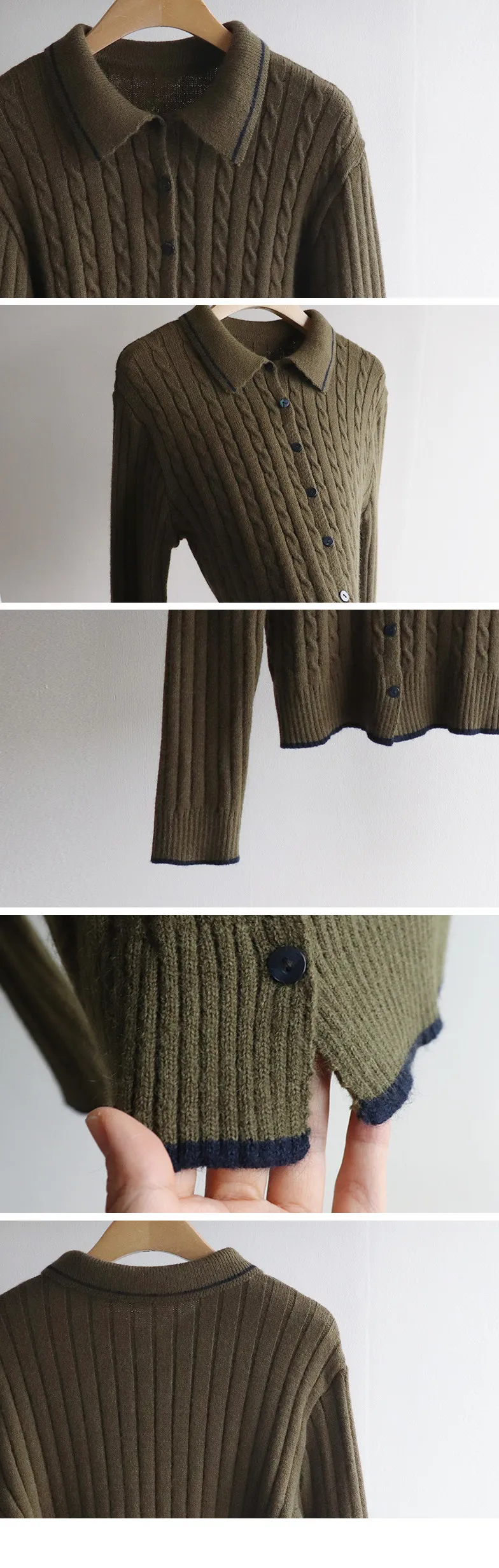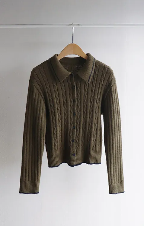 漂亮翻領配色線邊扭紋開衫 現貨軍綠