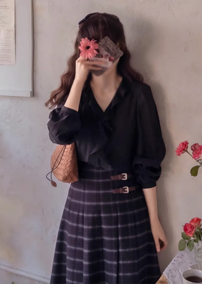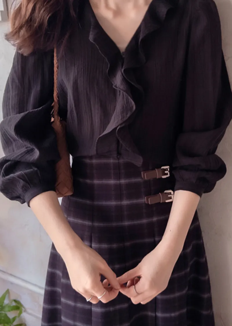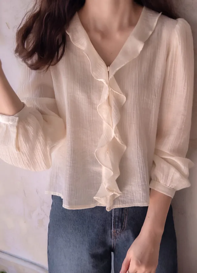 優雅可疊穿荷葉摺邊V領排扣上衣