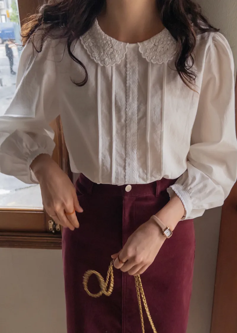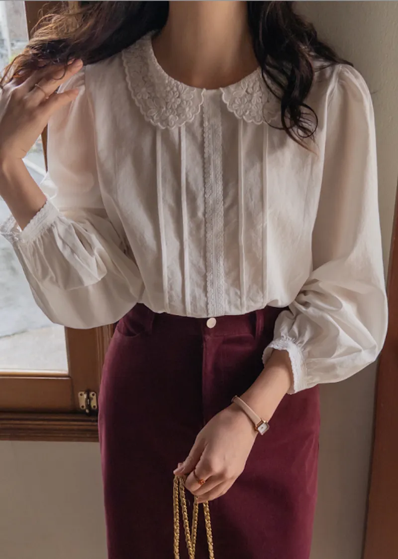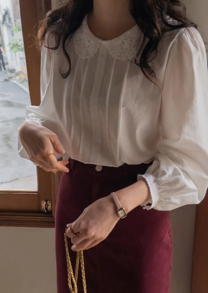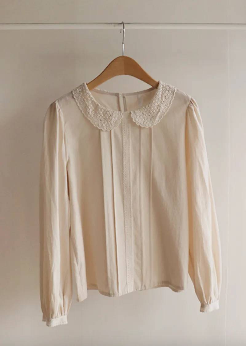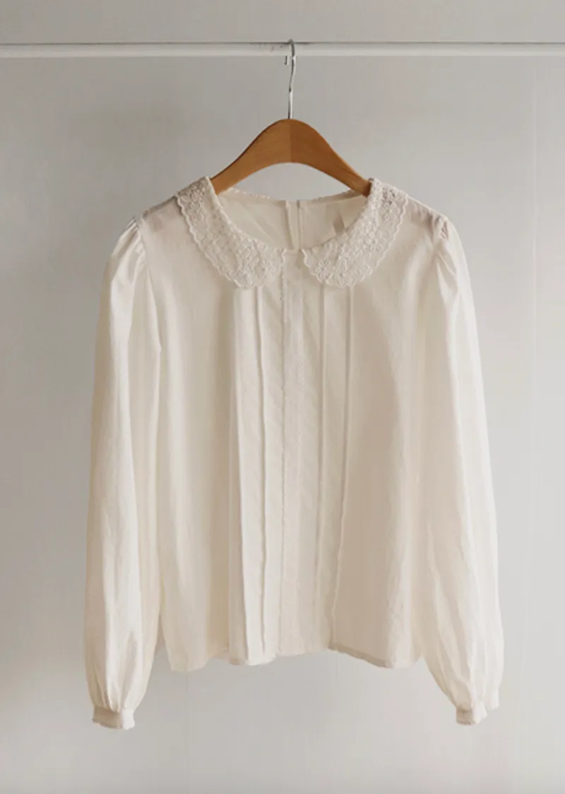 可愛花朵蕾絲領雙針褶線穿搭上衣