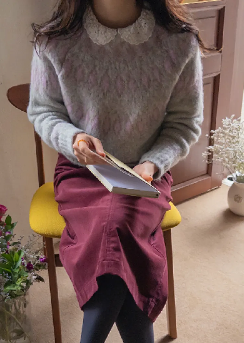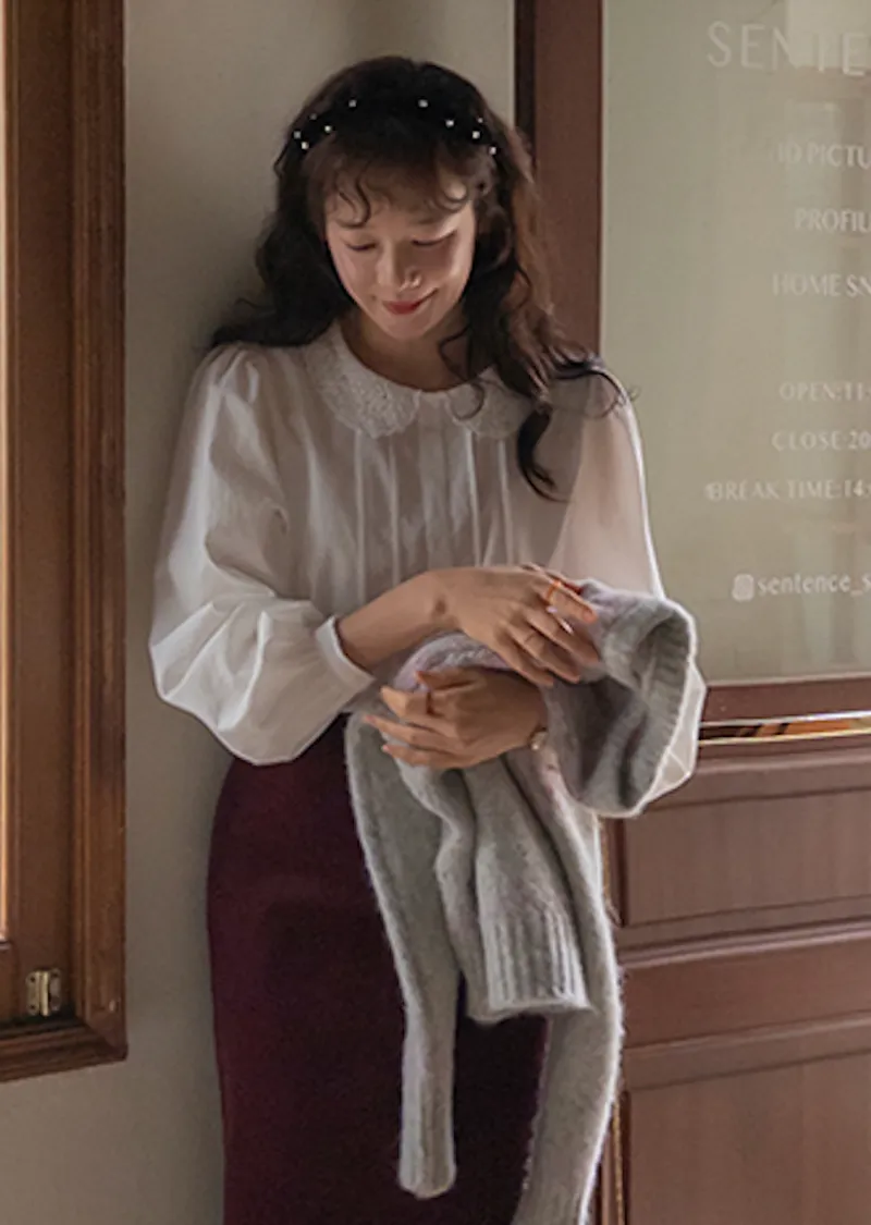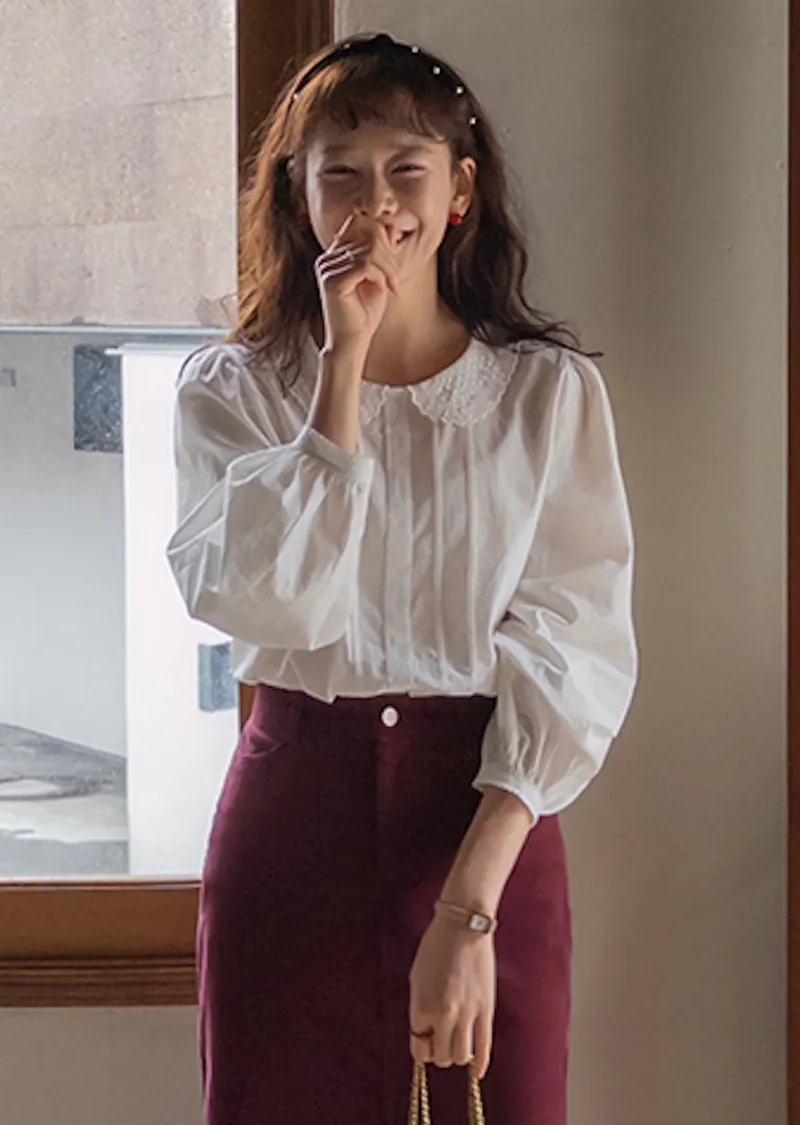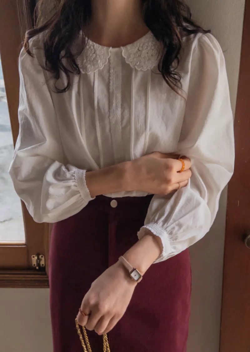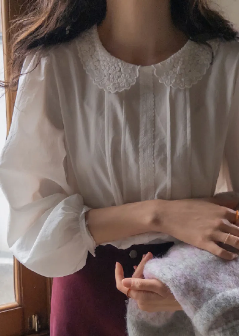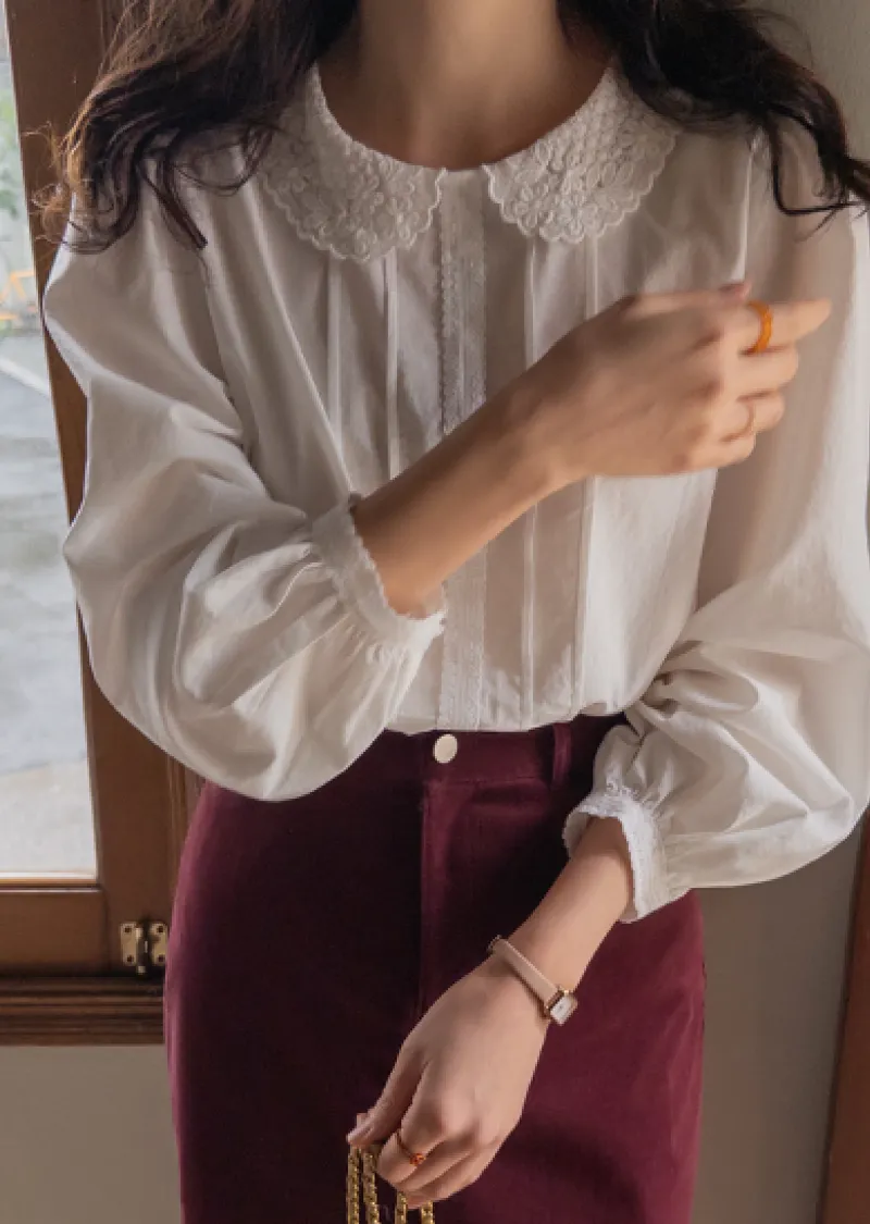 可愛花朵蕾絲領雙針褶線穿搭上衣