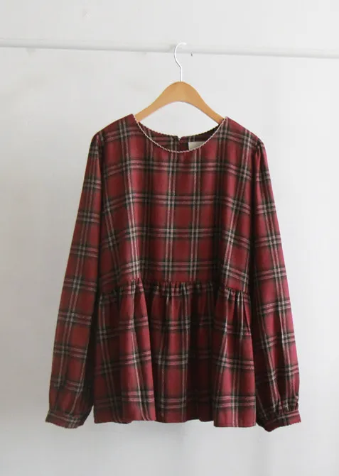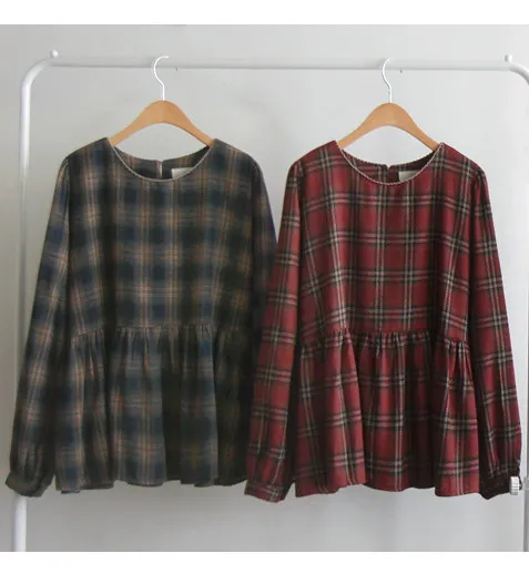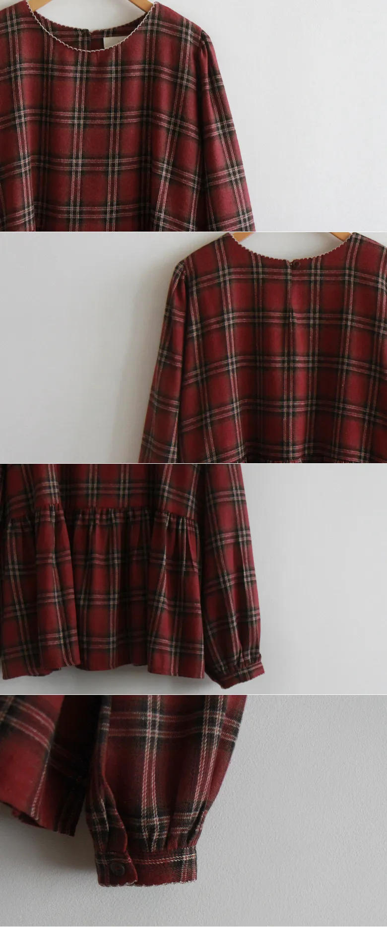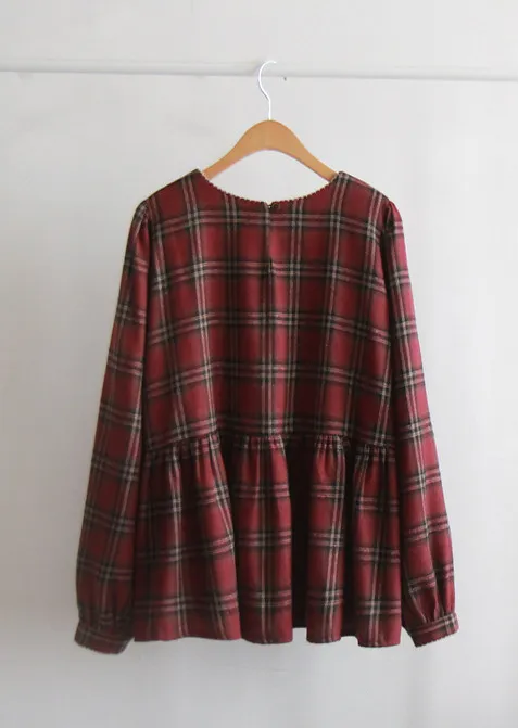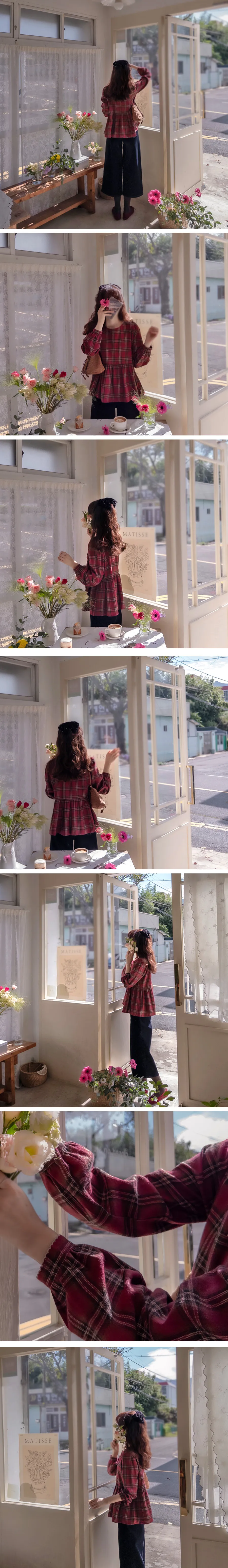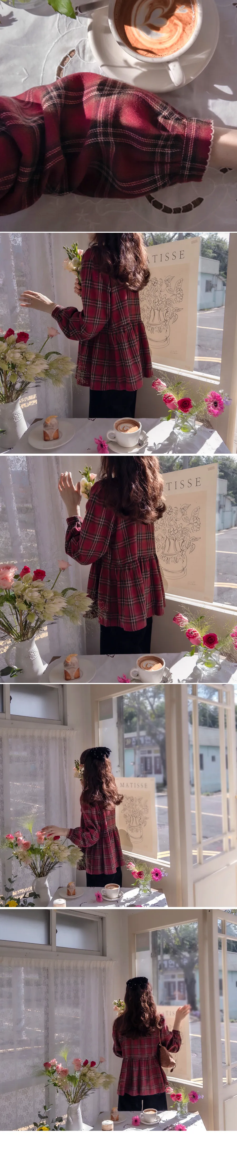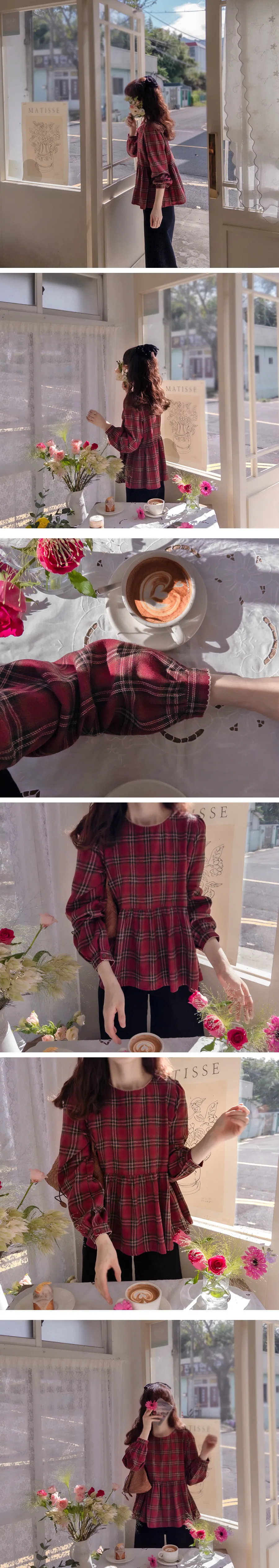 【領口與袖口採用迷你波浪形點綴】 【採用當季色彩,鮮豔格紋圖案上衣】 【腰部採用收腰設計,營造出可愛的氛圍】 【作為一款展現優雅氛圍上衣】