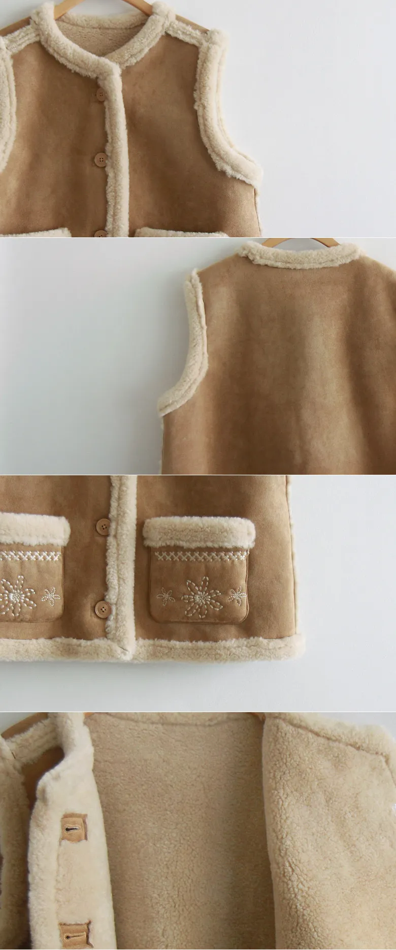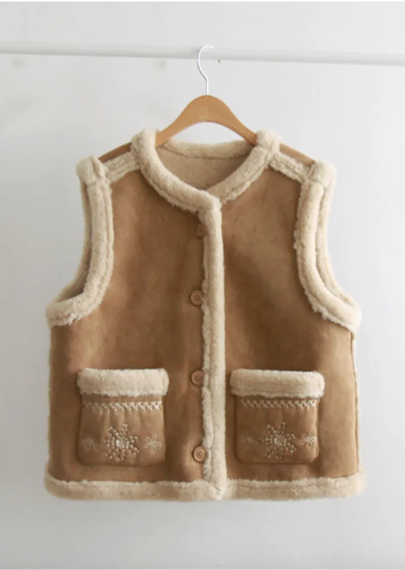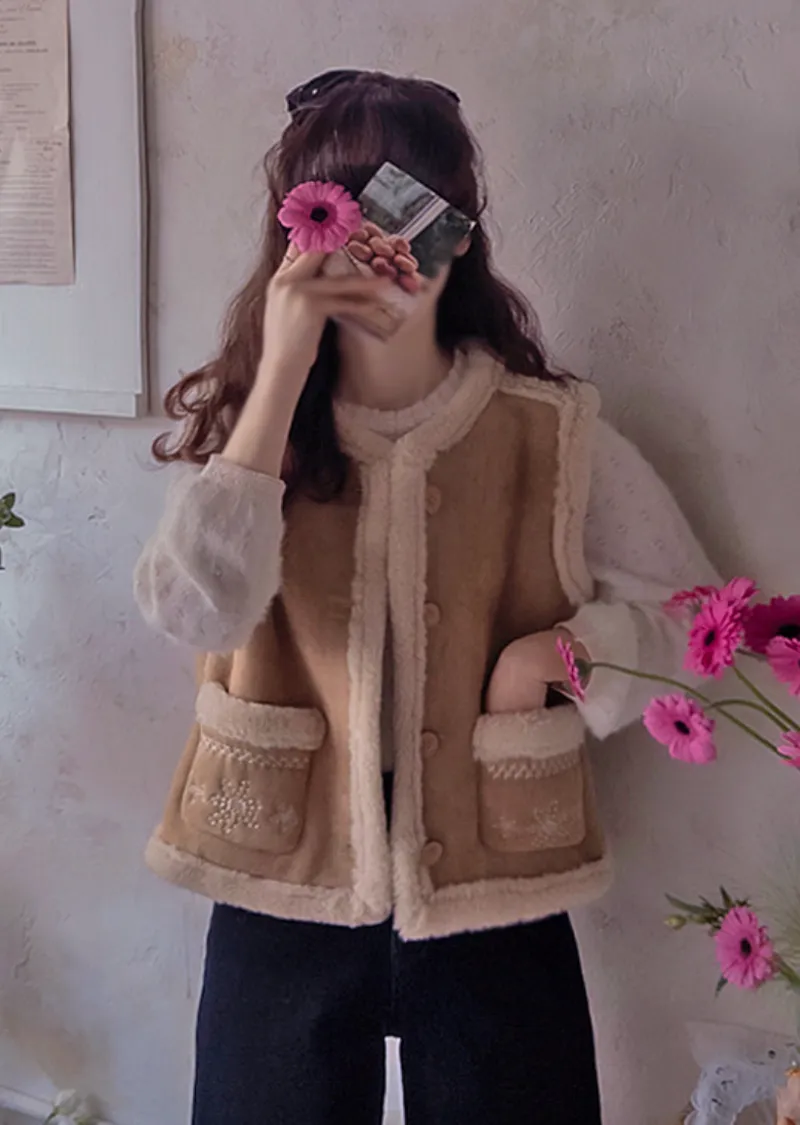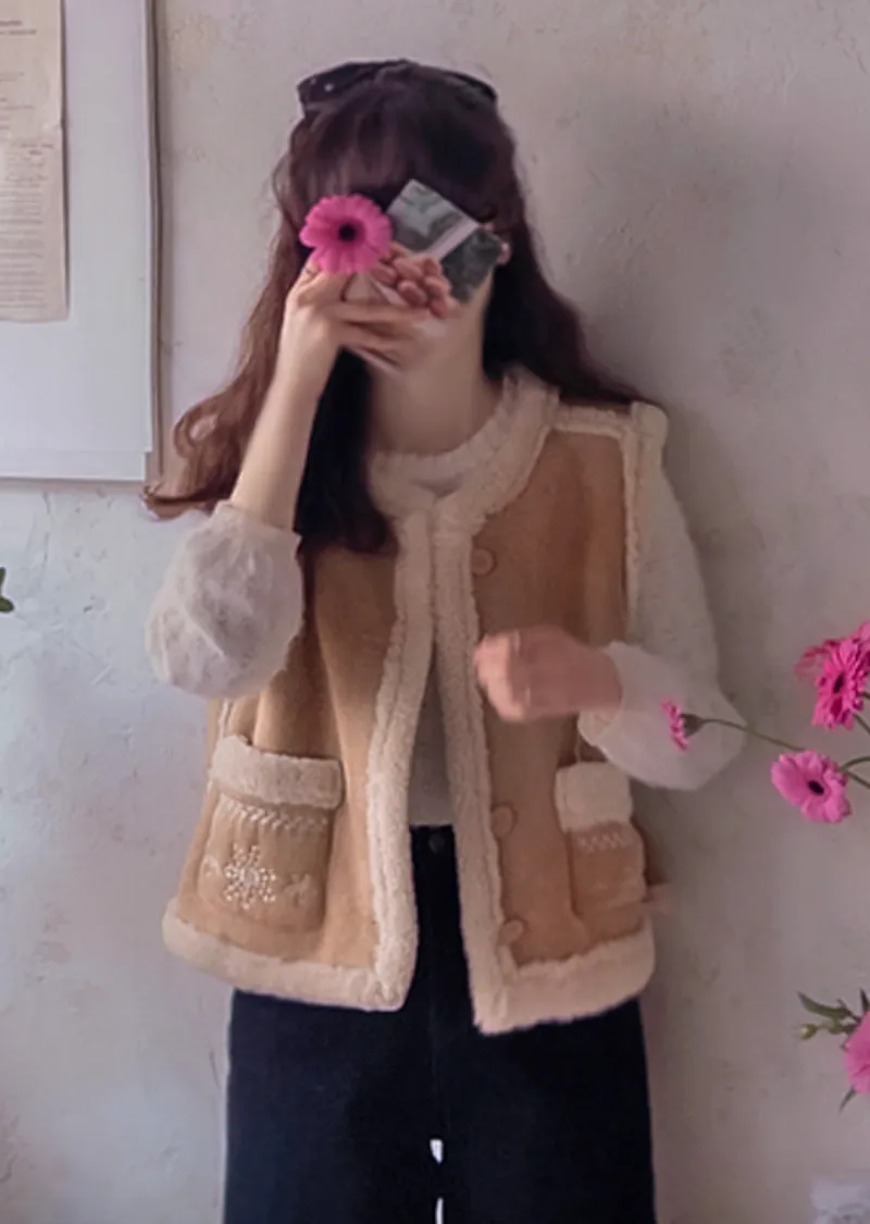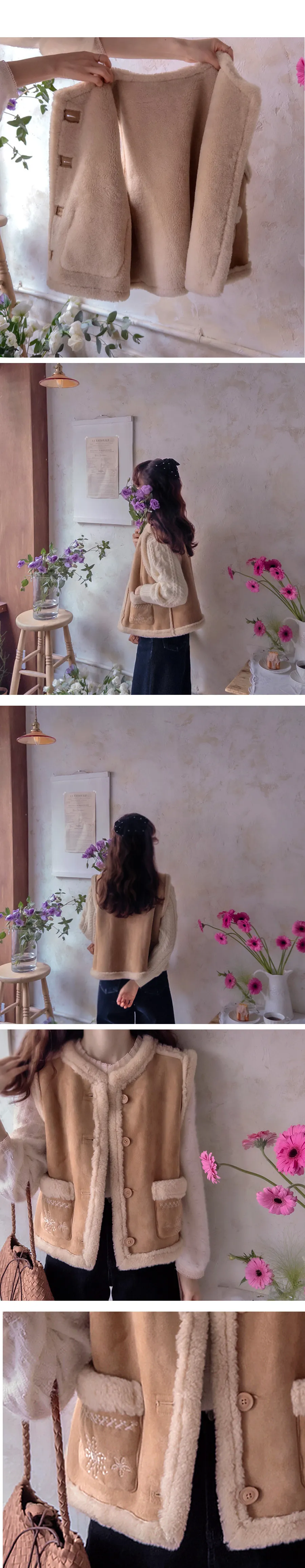 可愛花朵刺繡口袋內襯保暖麂皮背心