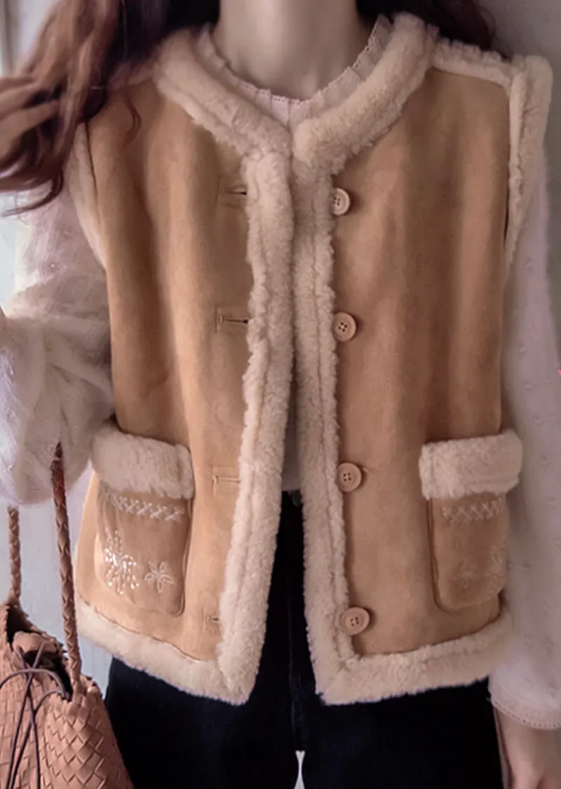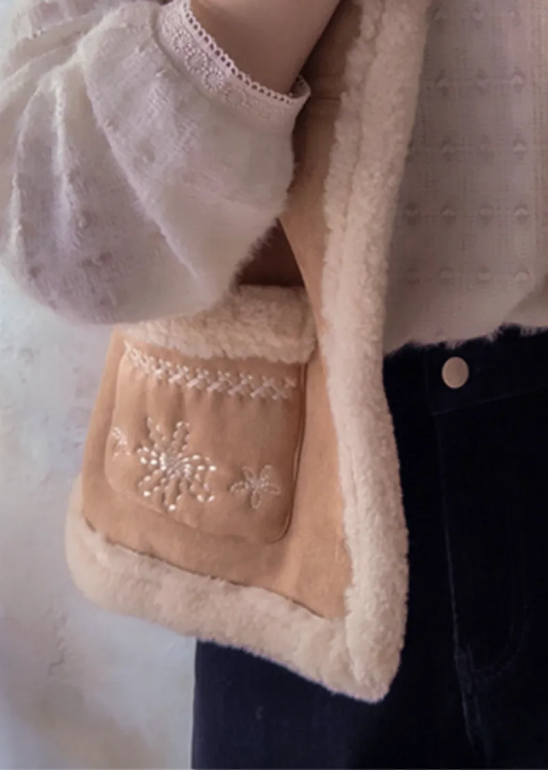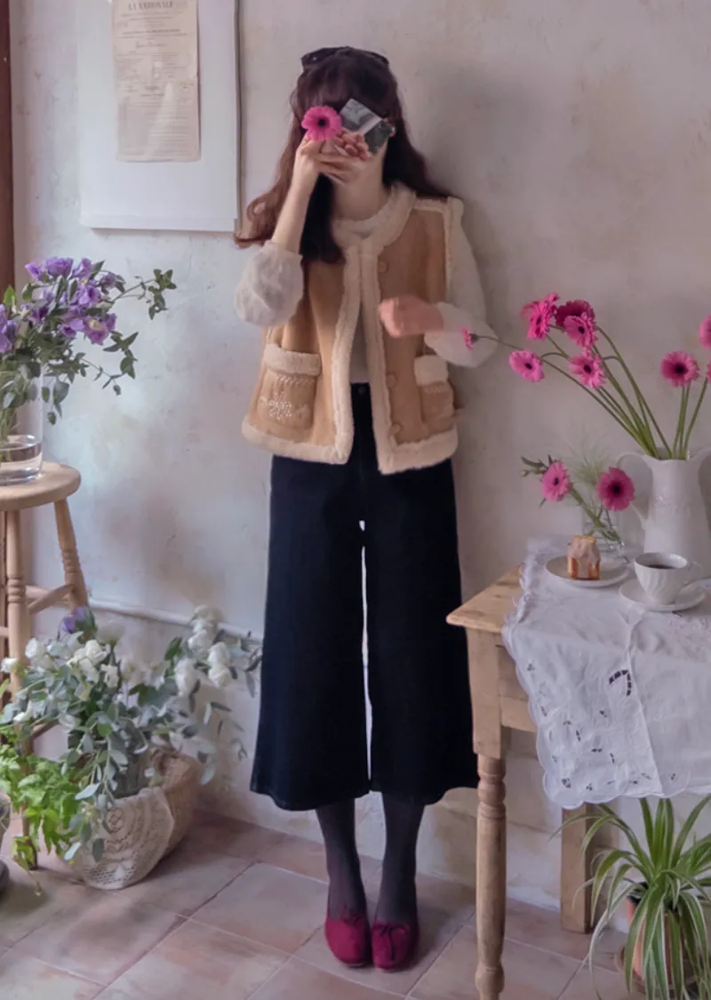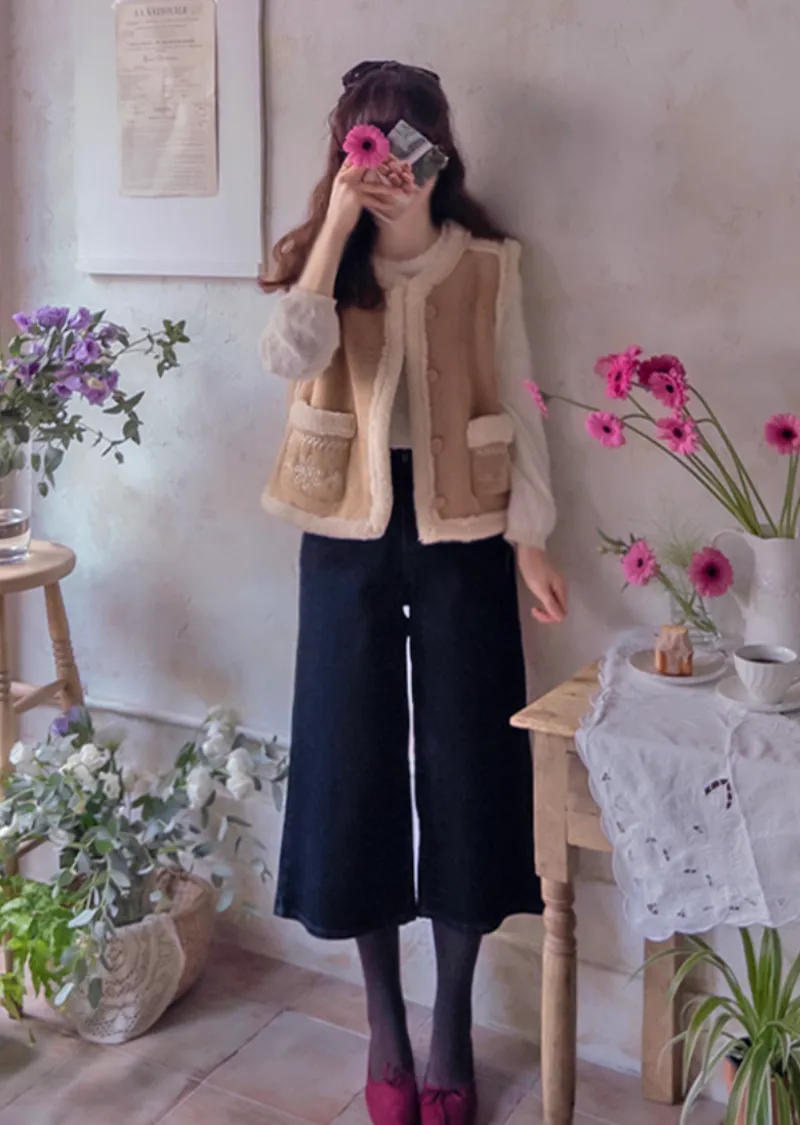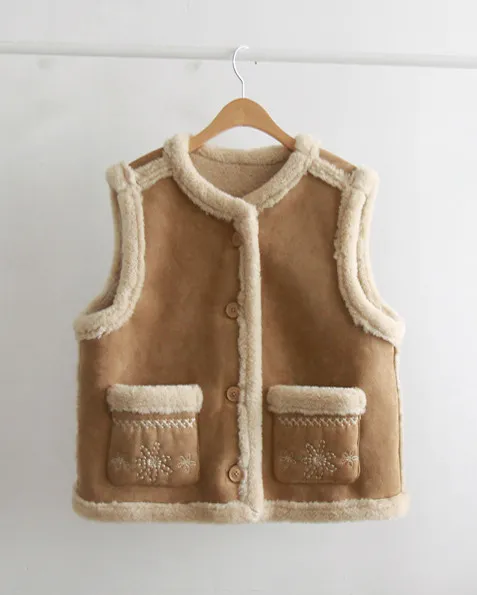 可愛花朵刺繡口袋內襯保暖麂皮背心