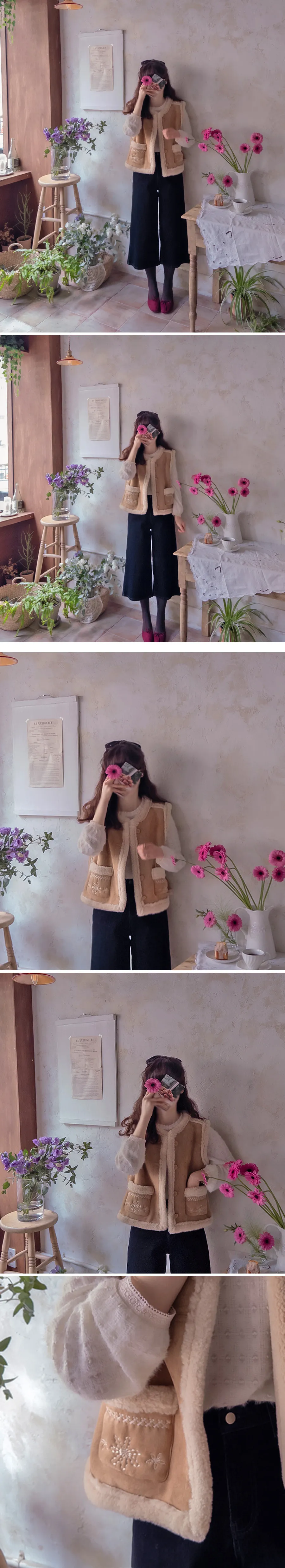 口袋刺繡保暖背心] [襯裡採用柔軟的毛皮] [營造可愛風格的背心] [舒適溫暖] [質地柔軟的時尚絨面背心] [口袋花朵刺繡是一大亮點] [作為奢華背心]