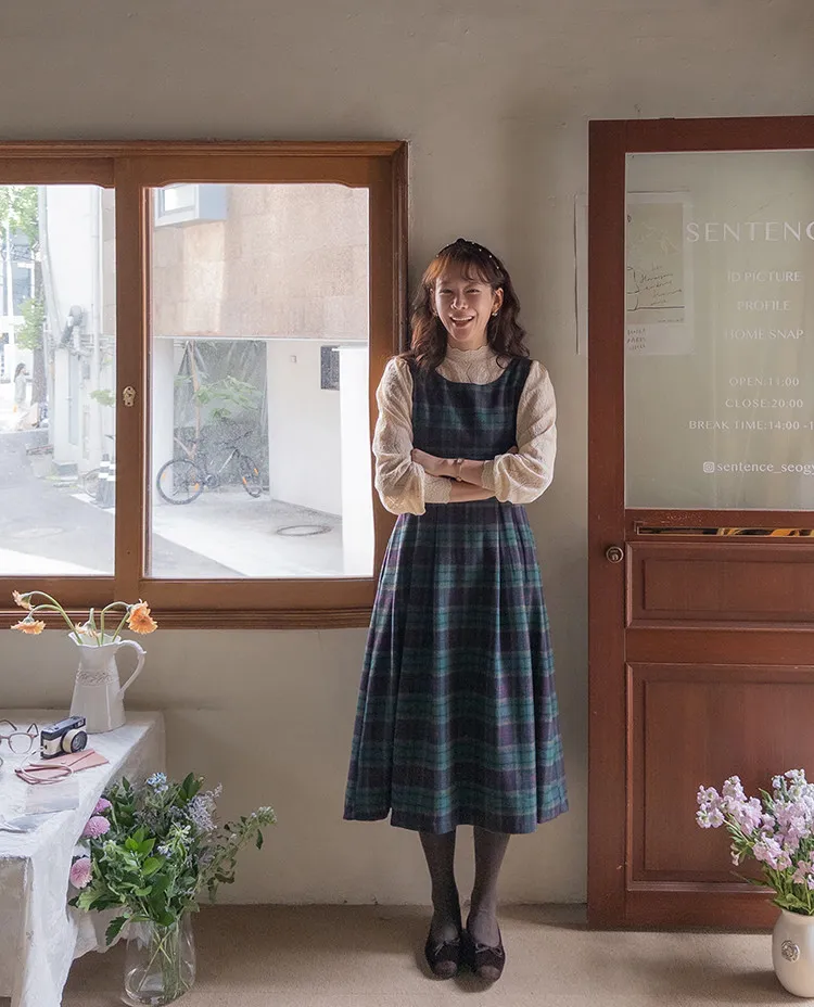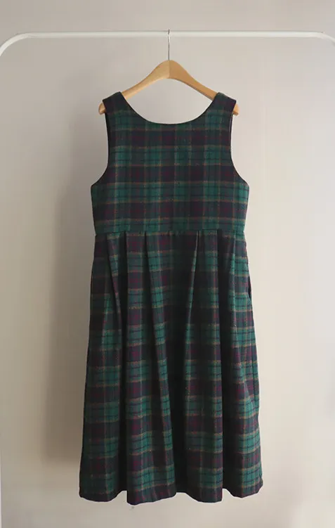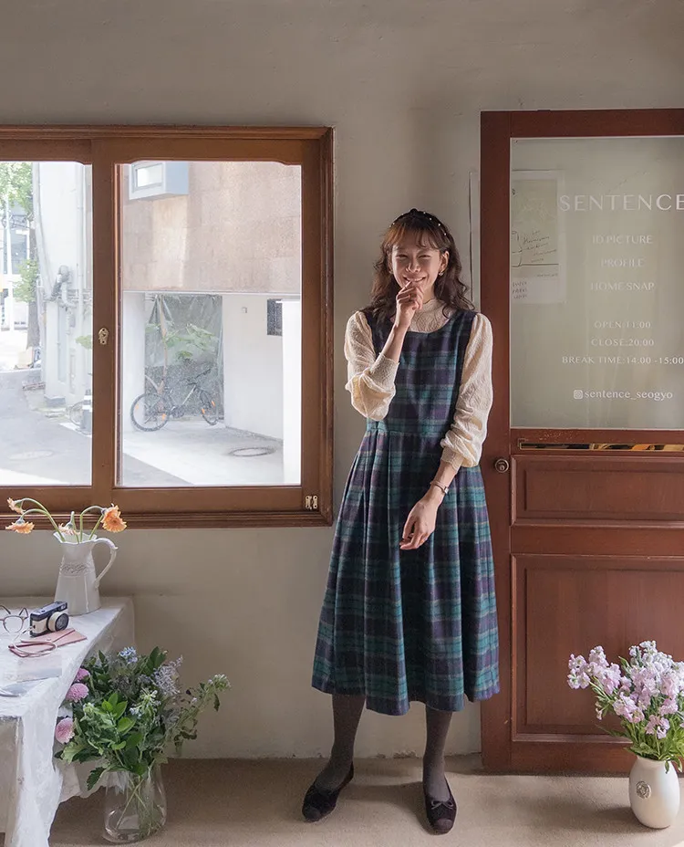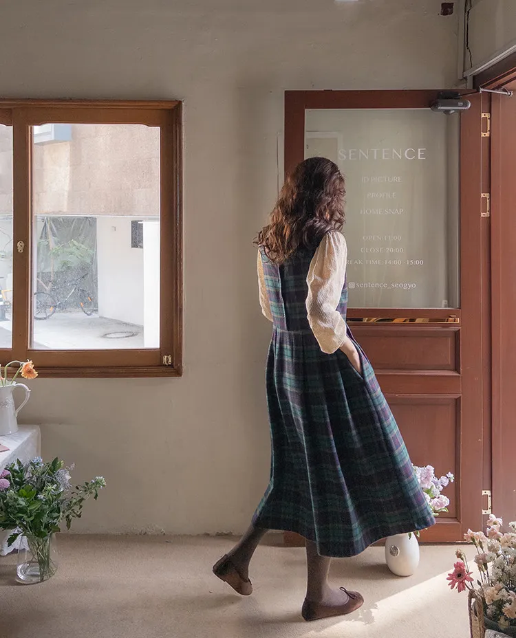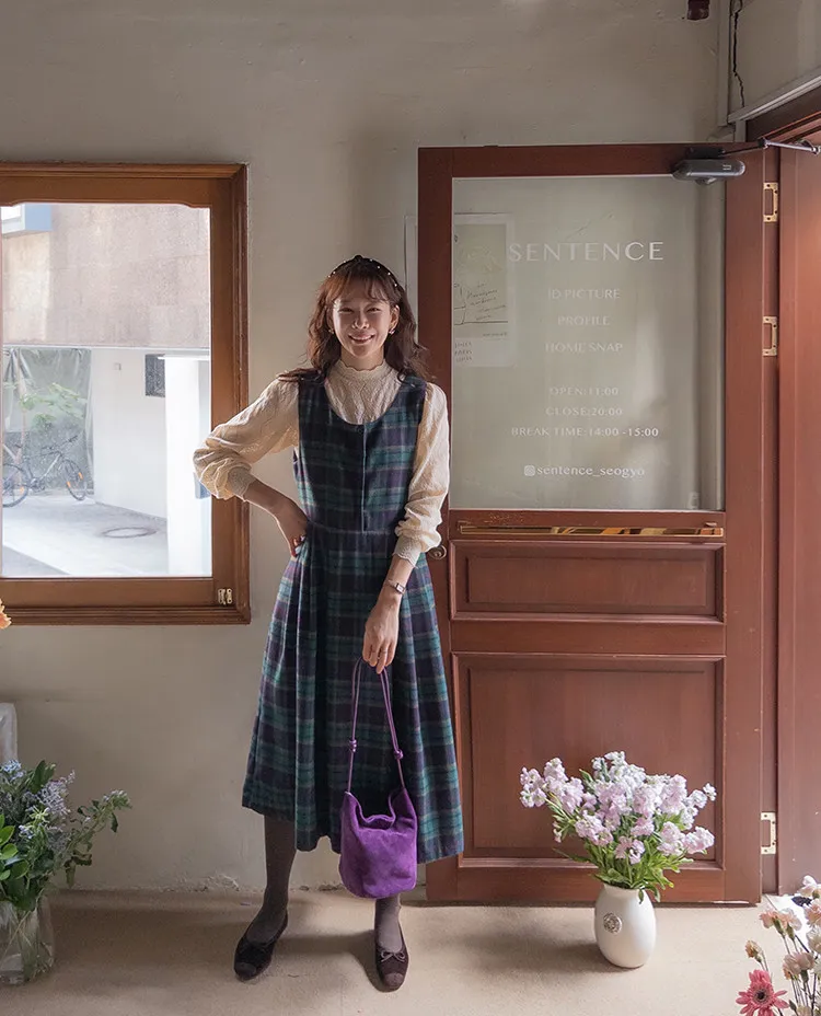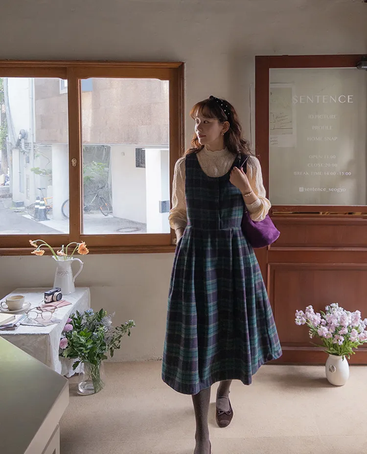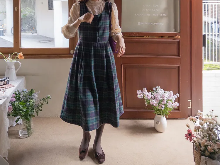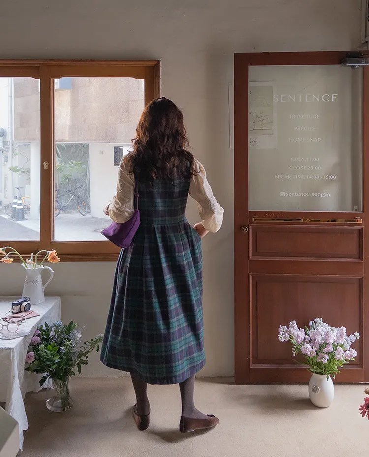 【溫暖舒適的格紋連身裙,配有羊毛內襯👗】 【前後都可以穿的雙向設計】 【根據內搭的不同,風格各異! 】 【從秋天到冬都很漂亮~】