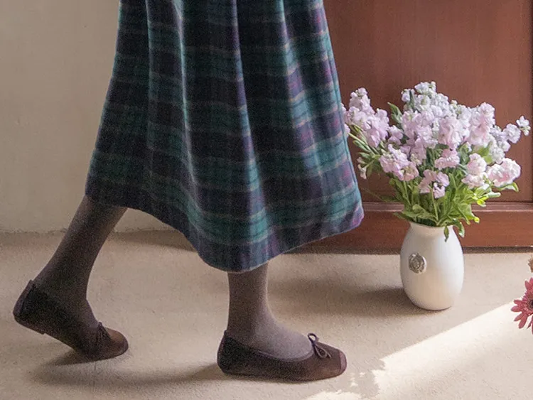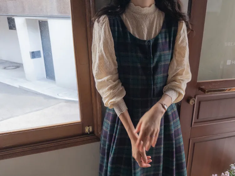 秋冬氛圍兩穿摺線裙擺溫暖舒適格紋連身裙
