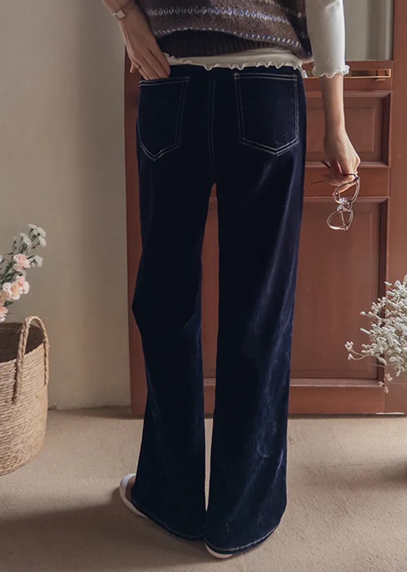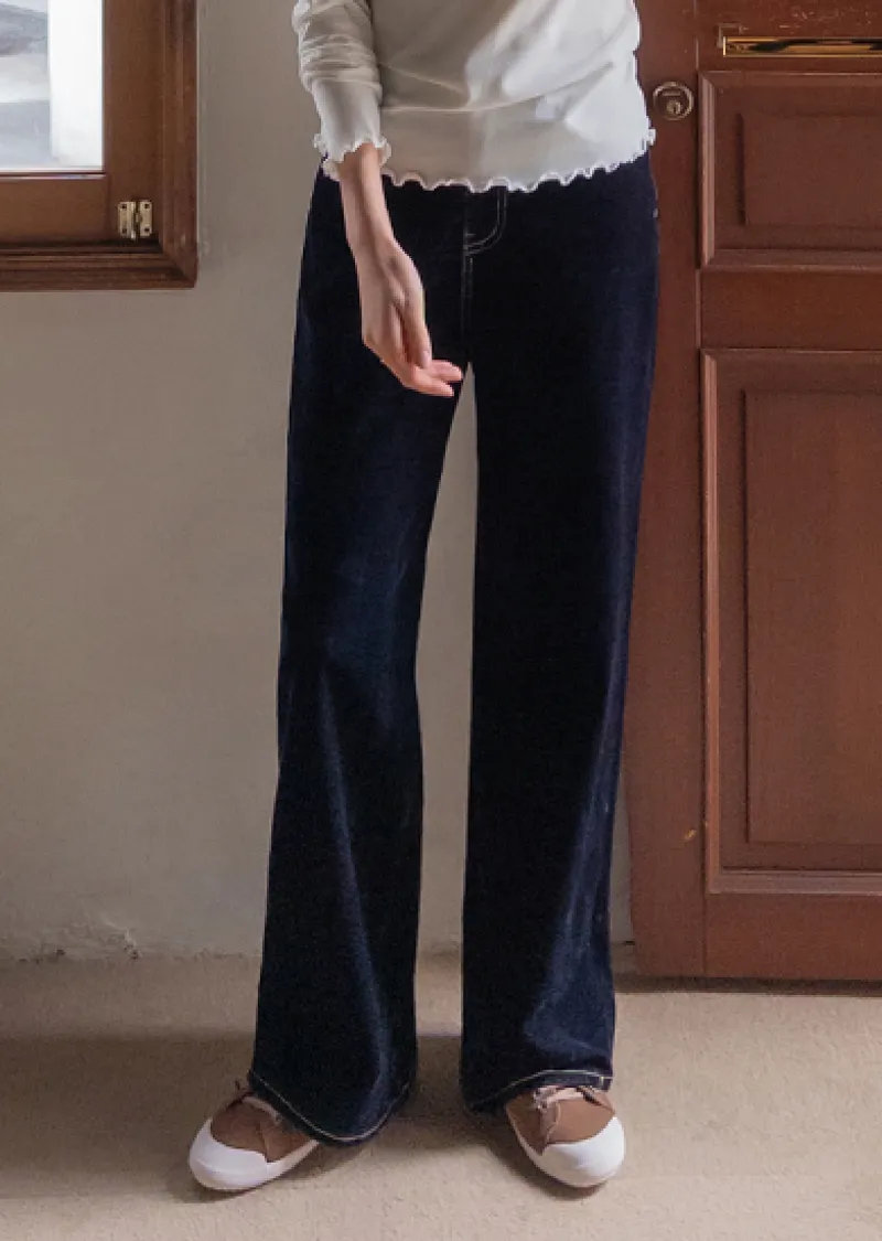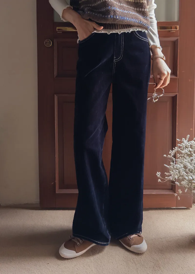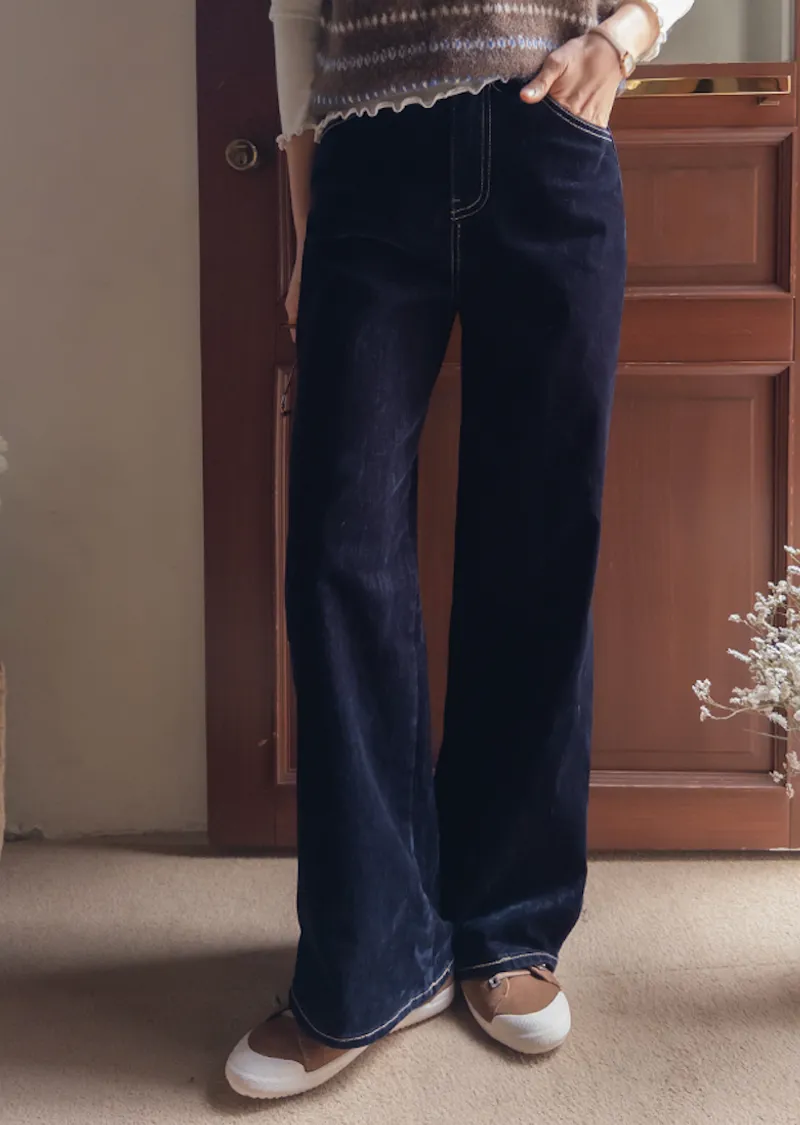 [奢華的天鵝絨牛仔褲] [隨著光線變化的微妙光澤] [適合每年長期穿著的材質] [舒適的全腰隱形彈性帶]
