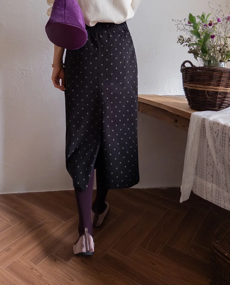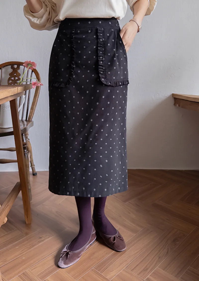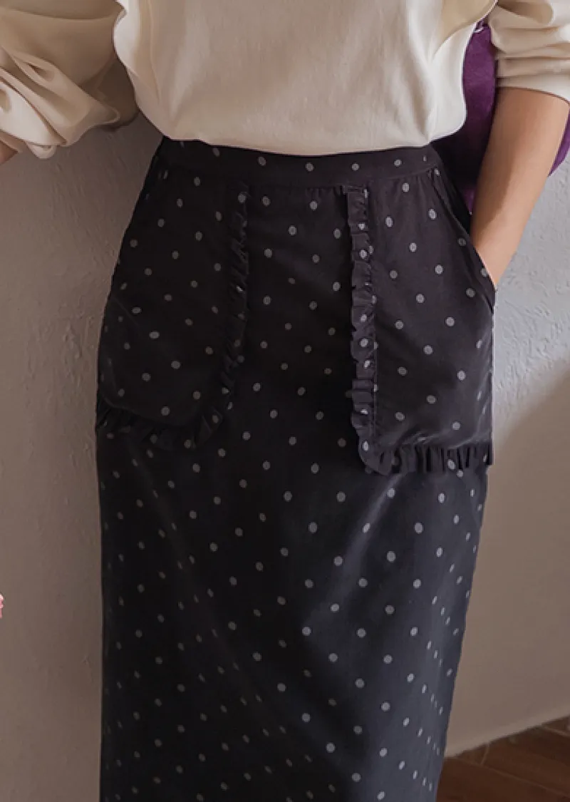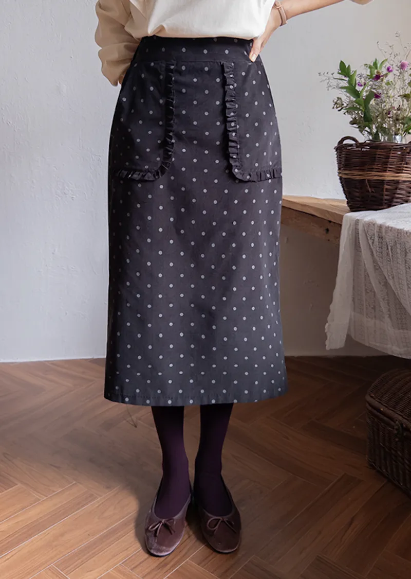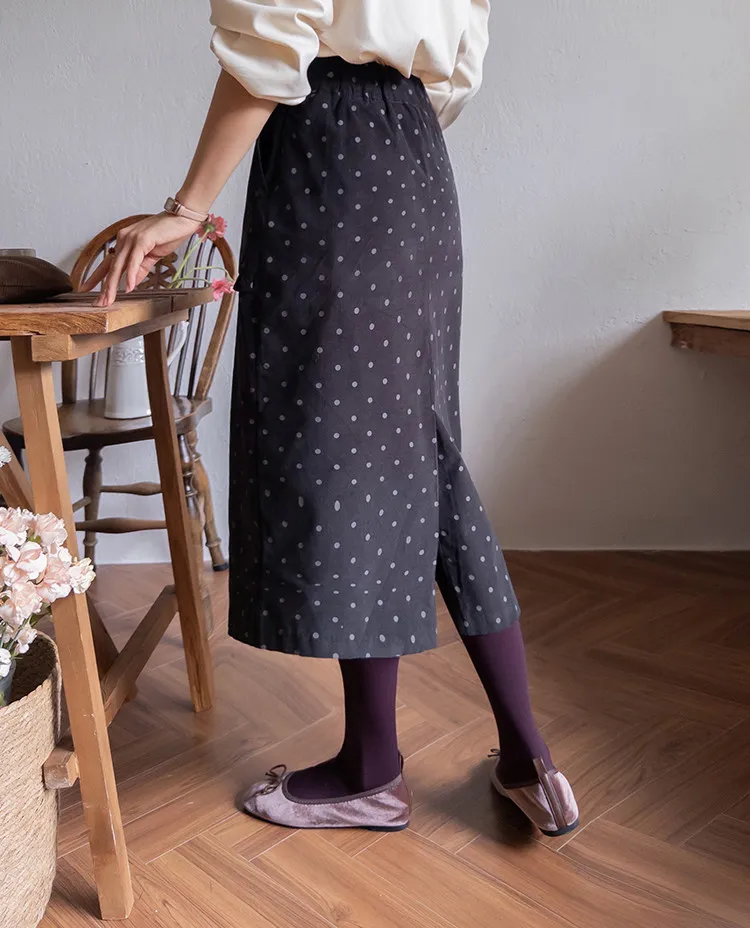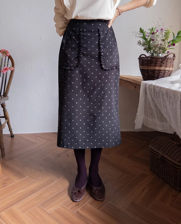 【充滿可愛感~圓點長款裙子♥】【溫柔的圓點圖案是亮點!】【兩側帶有荷葉邊細節的口袋,增添立體感】【後開衩&後腰彈性帶設計,活動自如】