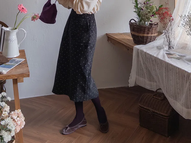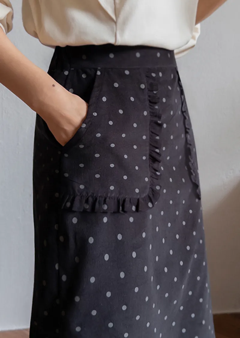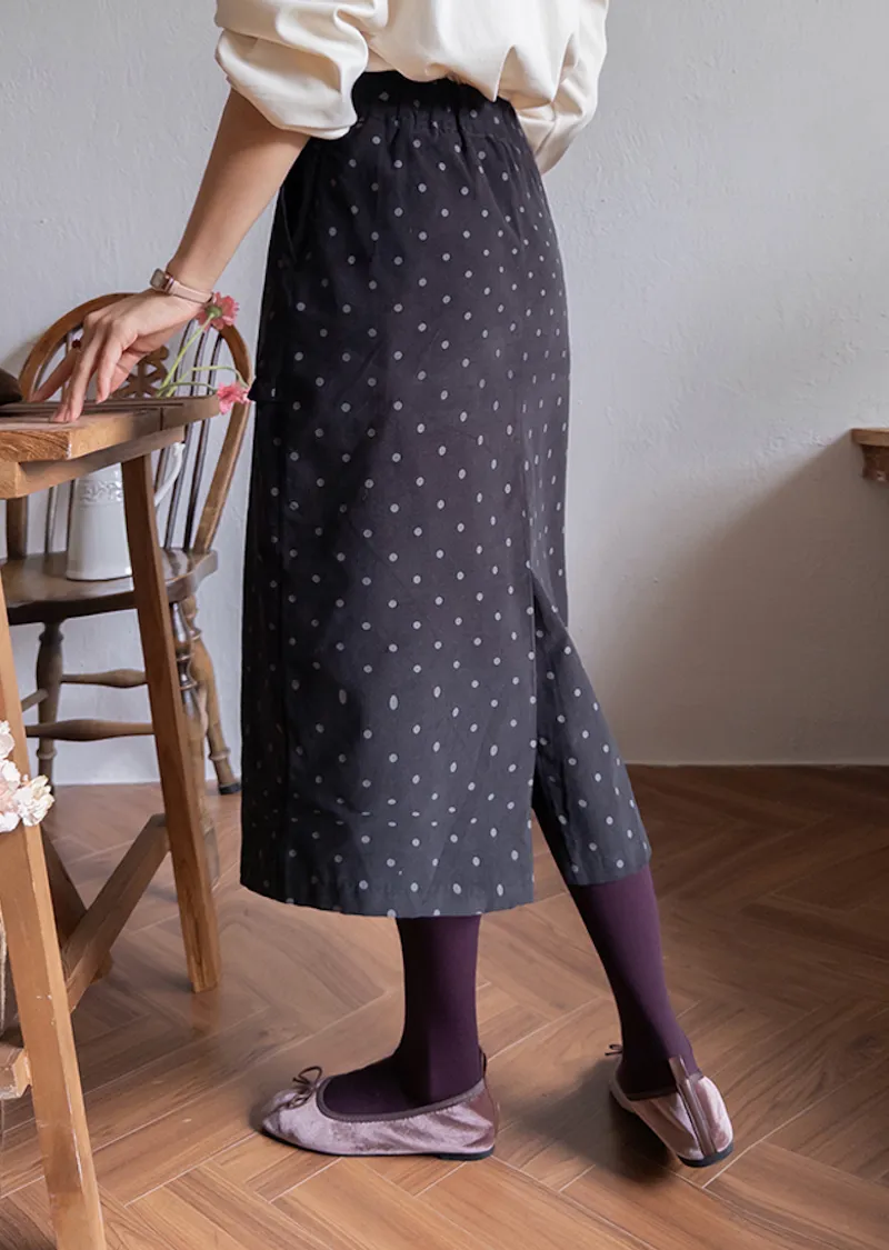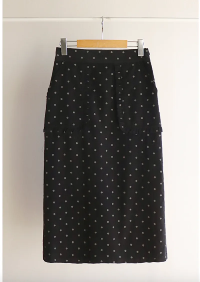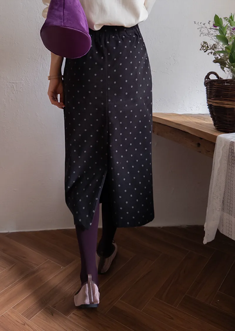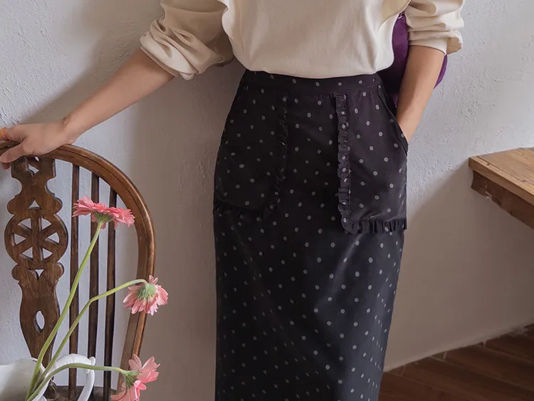 【充滿可愛感~圓點長款裙子♥】【溫柔的圓點圖案是亮點!】【兩側帶有荷葉邊細節的口袋,增添立體感】【後開衩&後腰彈性帶設計,活動自如】