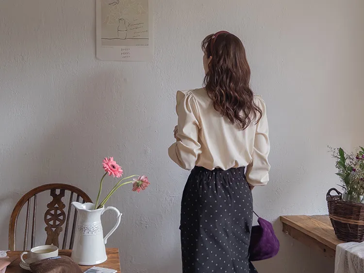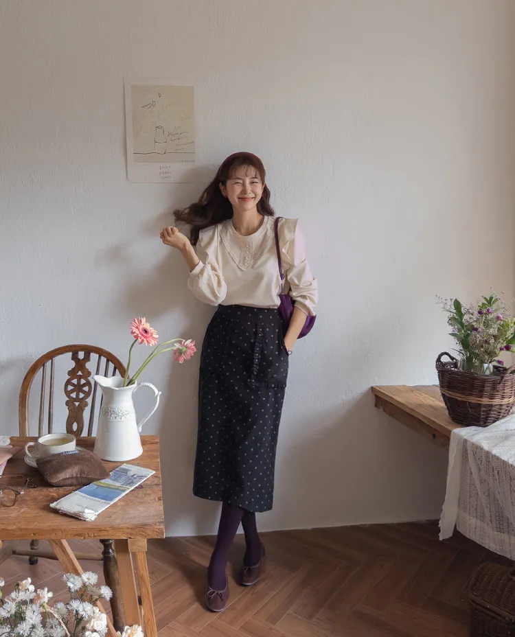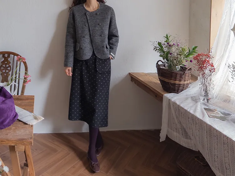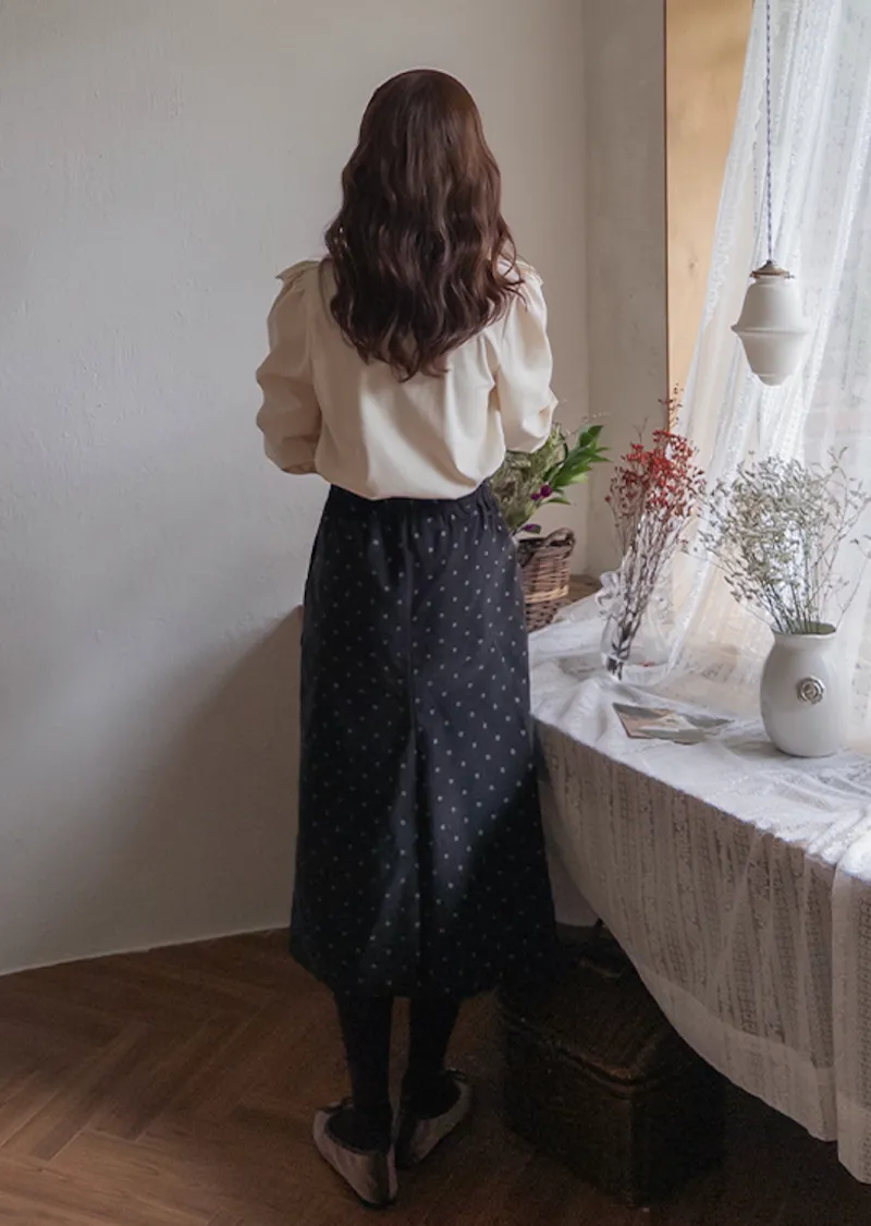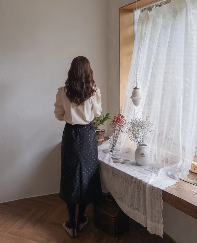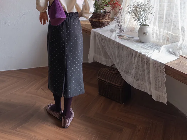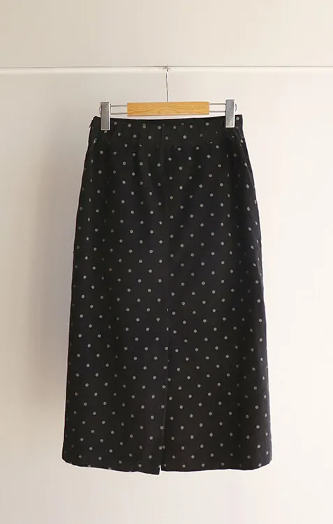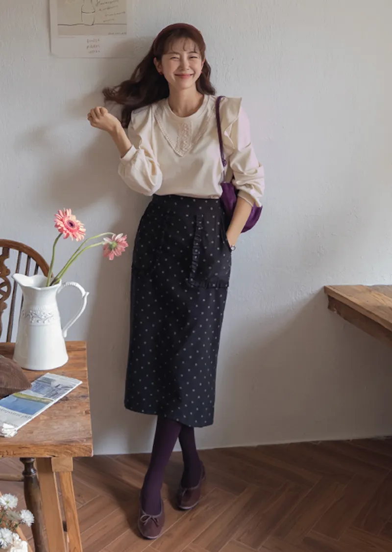 【充滿可愛感~圓點長款裙子♥】【溫柔的圓點圖案是亮點!】【兩側帶有荷葉邊細節的口袋,增添立體感】【後開衩&後腰彈性帶設計,活動自如】