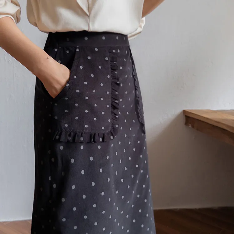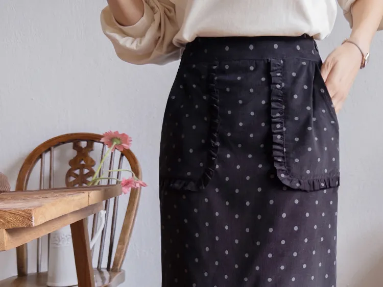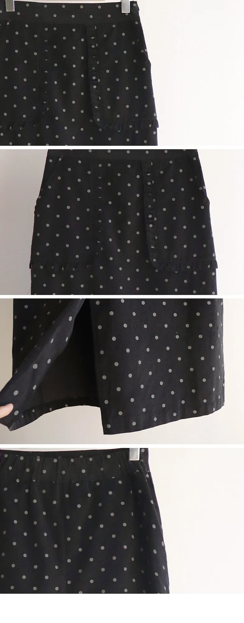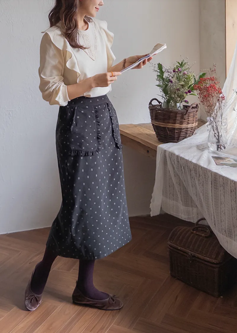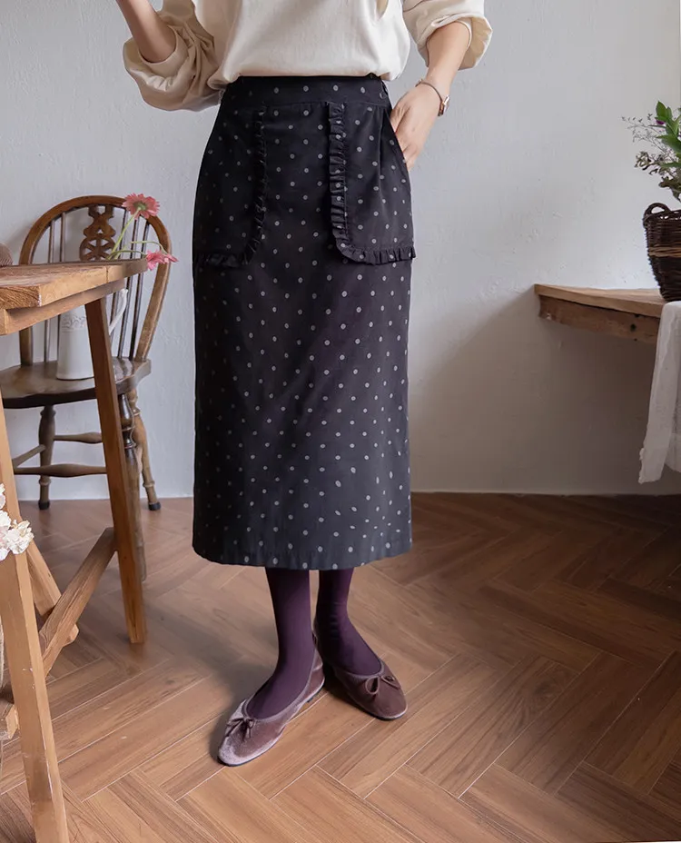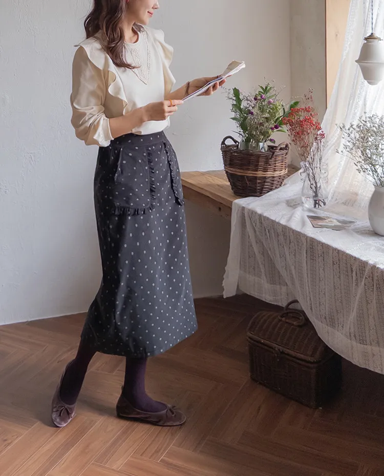 可愛立體感荷葉摺邊口袋圓點點中長裙