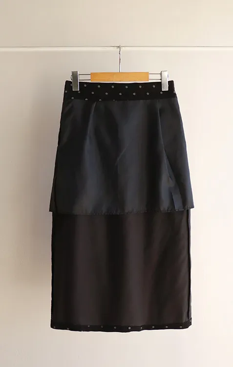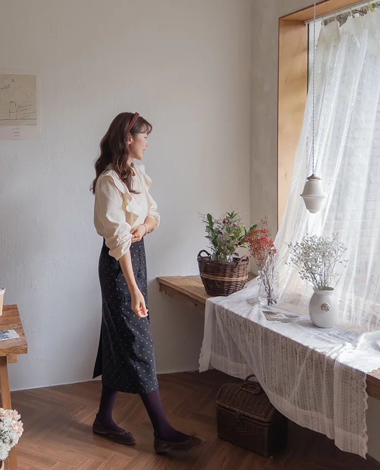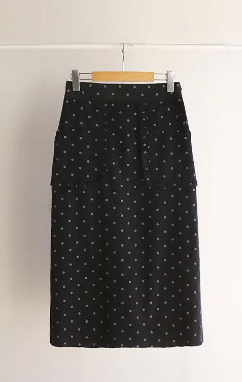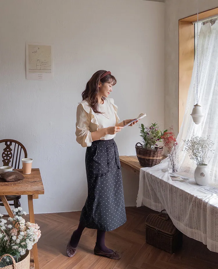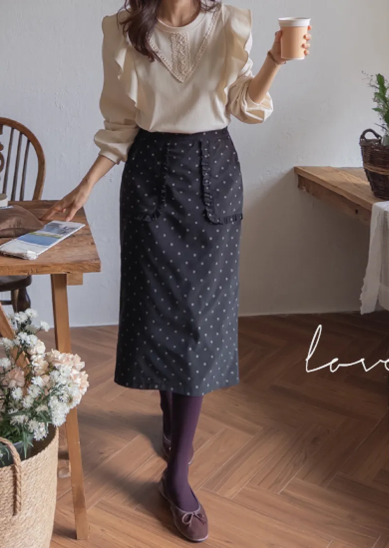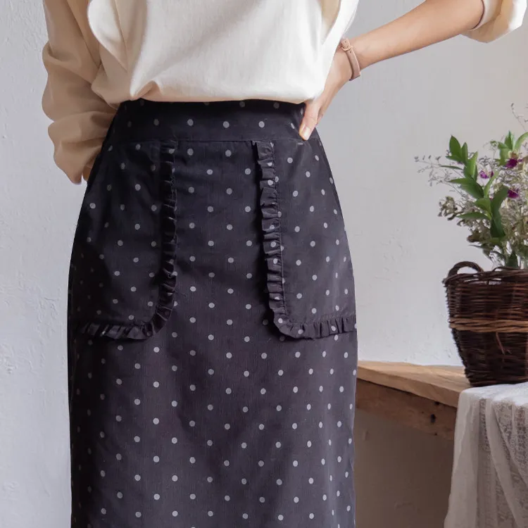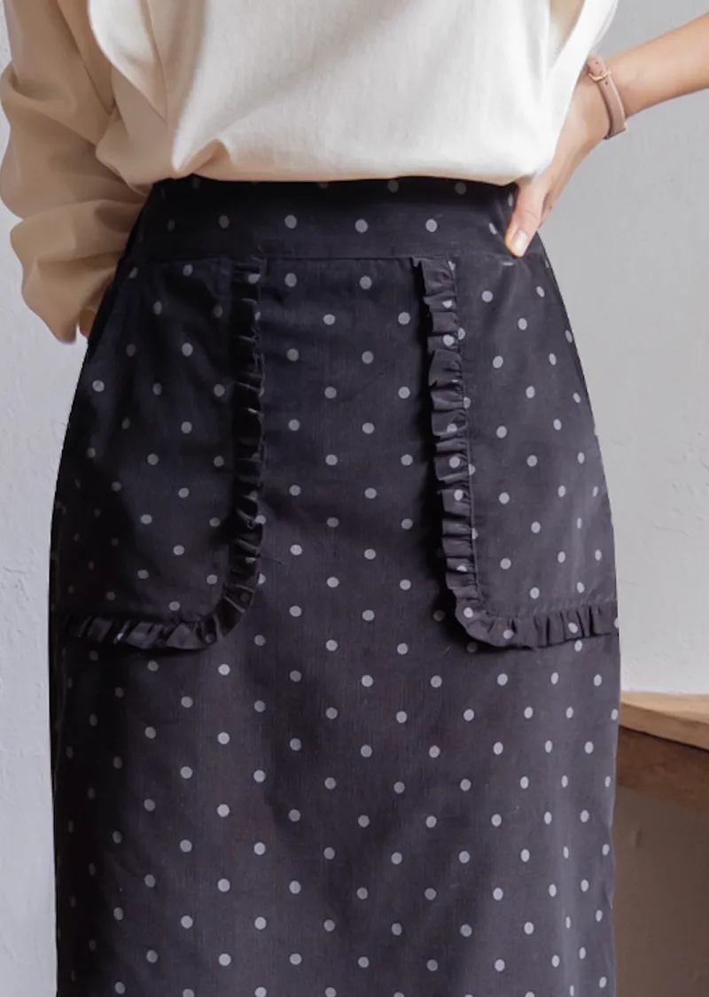 可愛立體感荷葉摺邊口袋圓點點中長裙