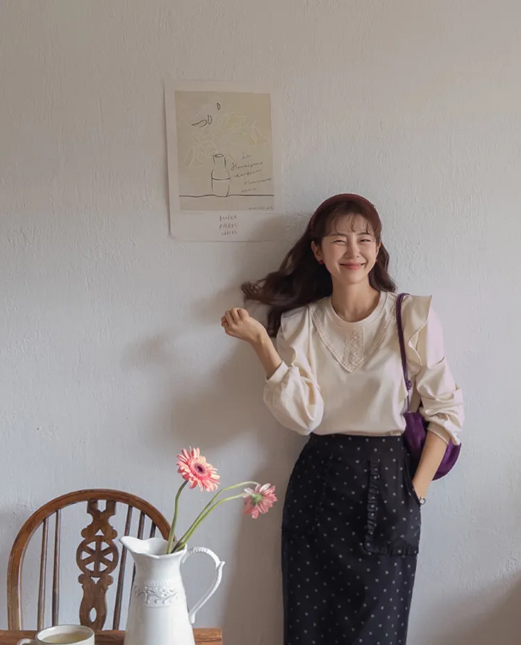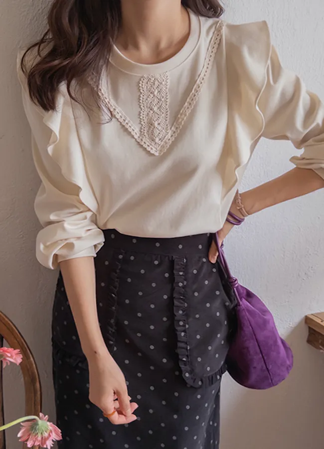 柔美輪廓荷葉摺邊點綴蕾絲舒適上衣