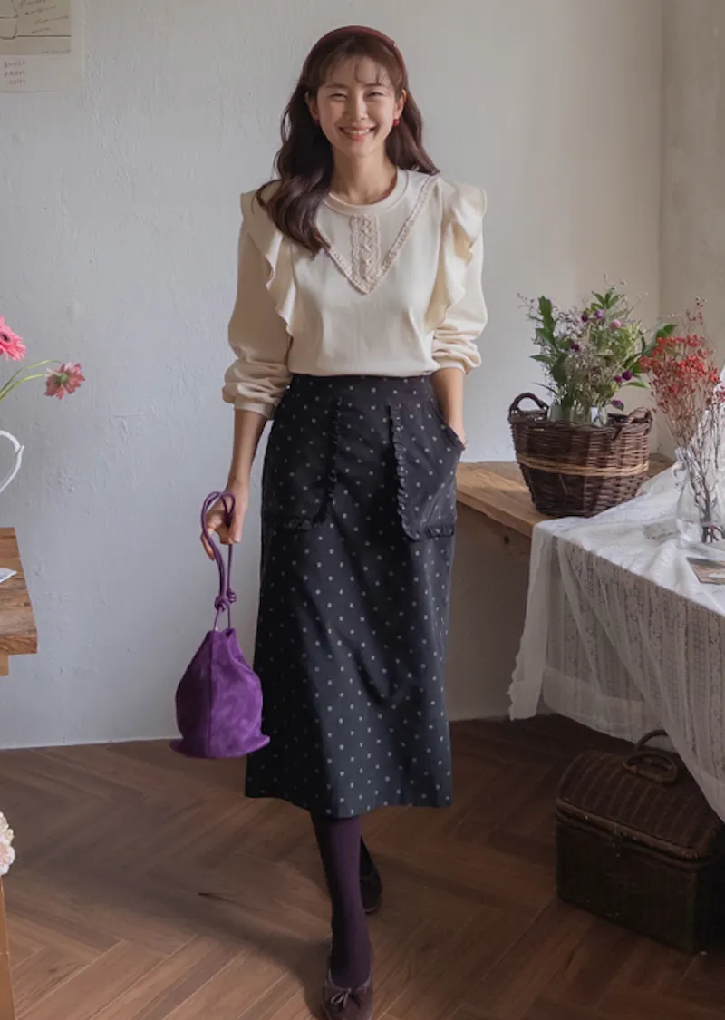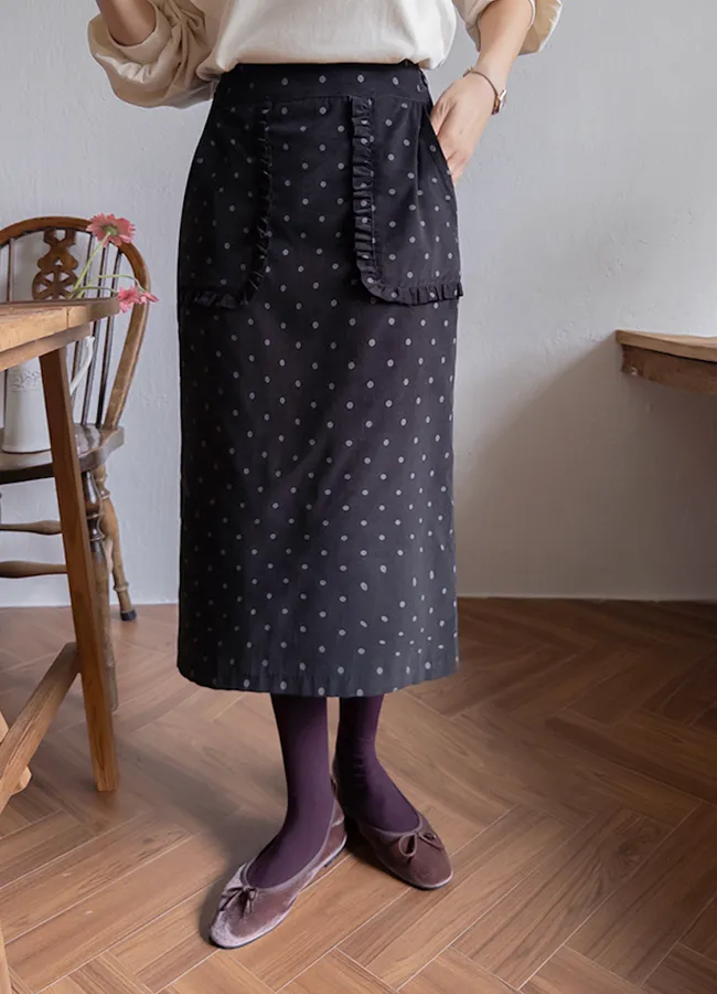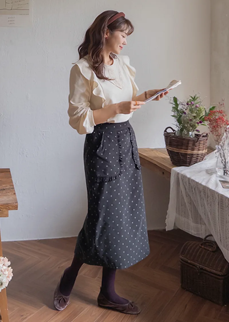 可愛立體感荷葉摺邊口袋圓點點中長裙