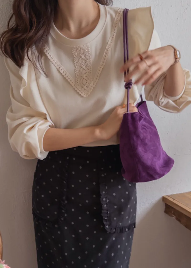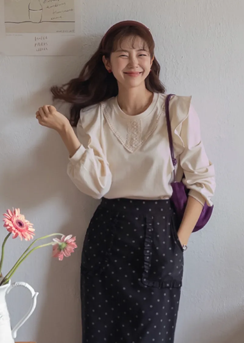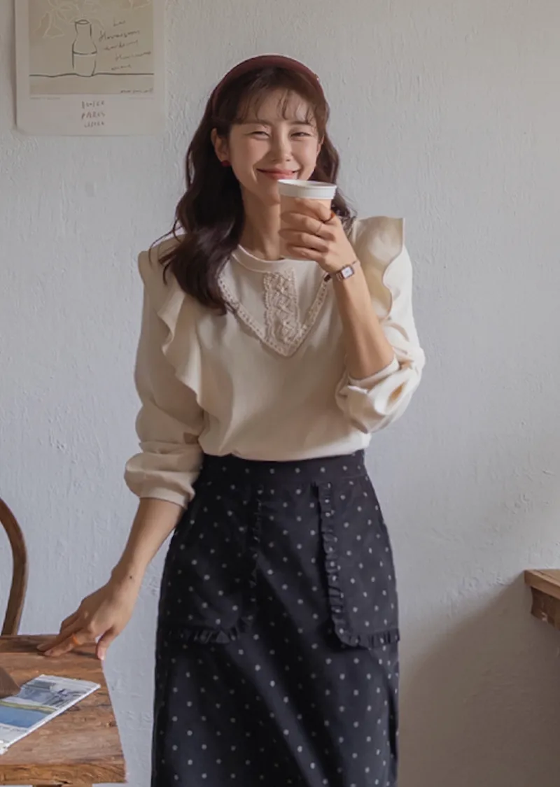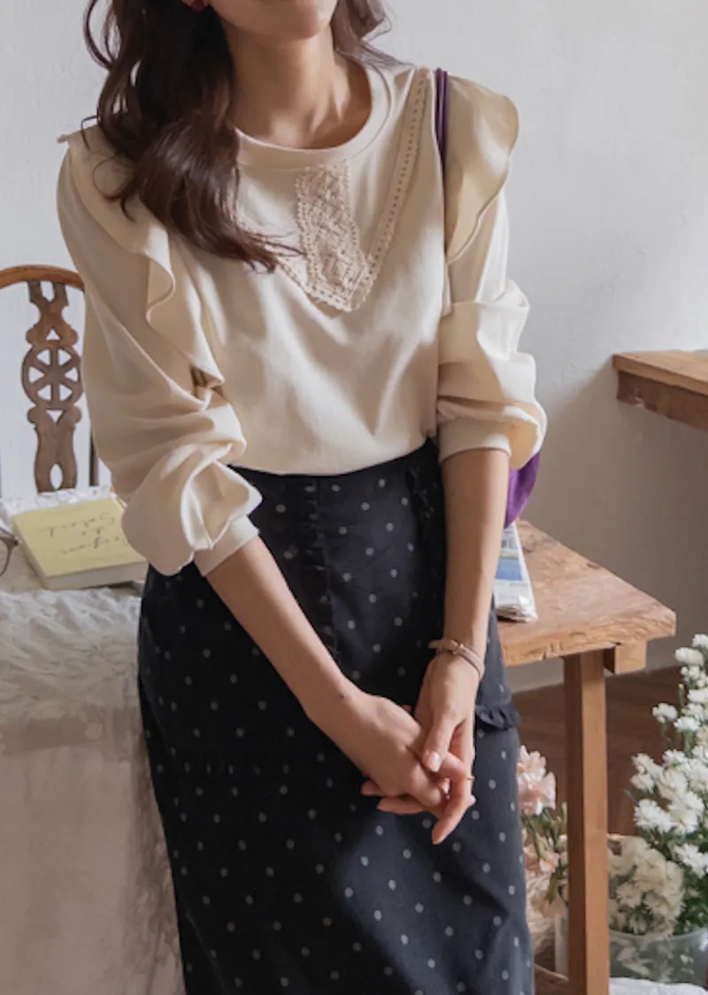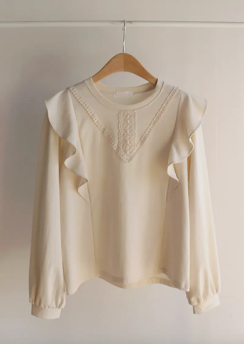 柔美輪廓荷葉摺邊點綴蕾絲舒適上衣