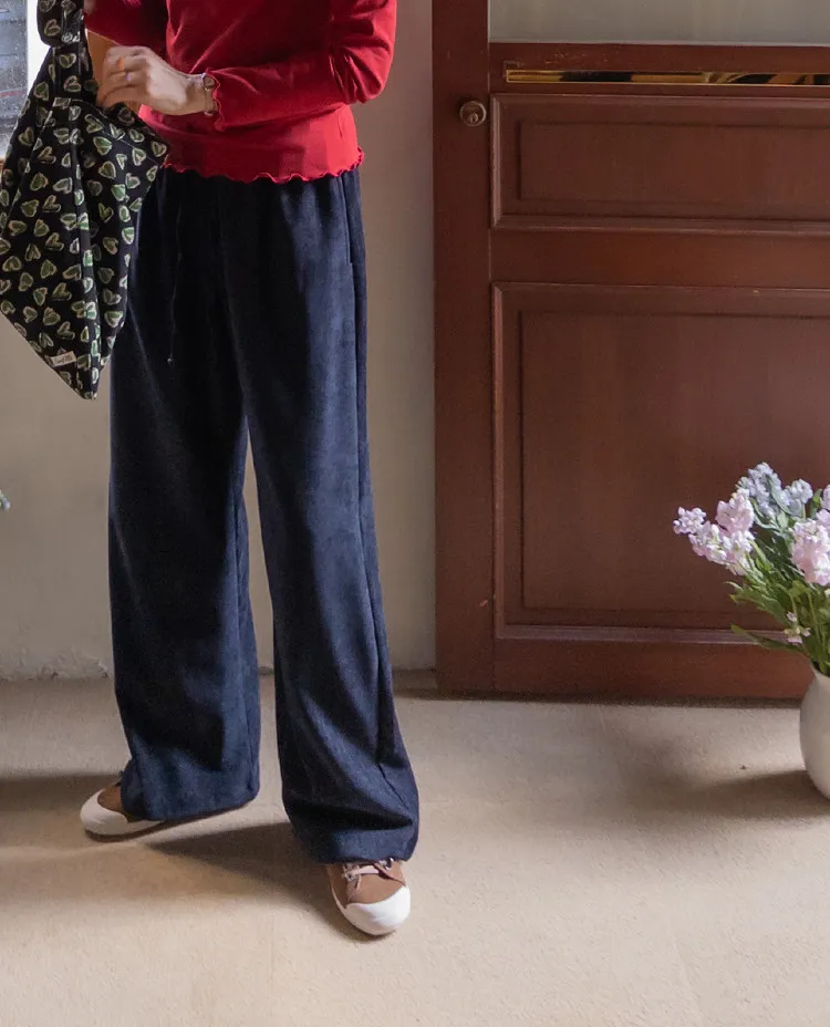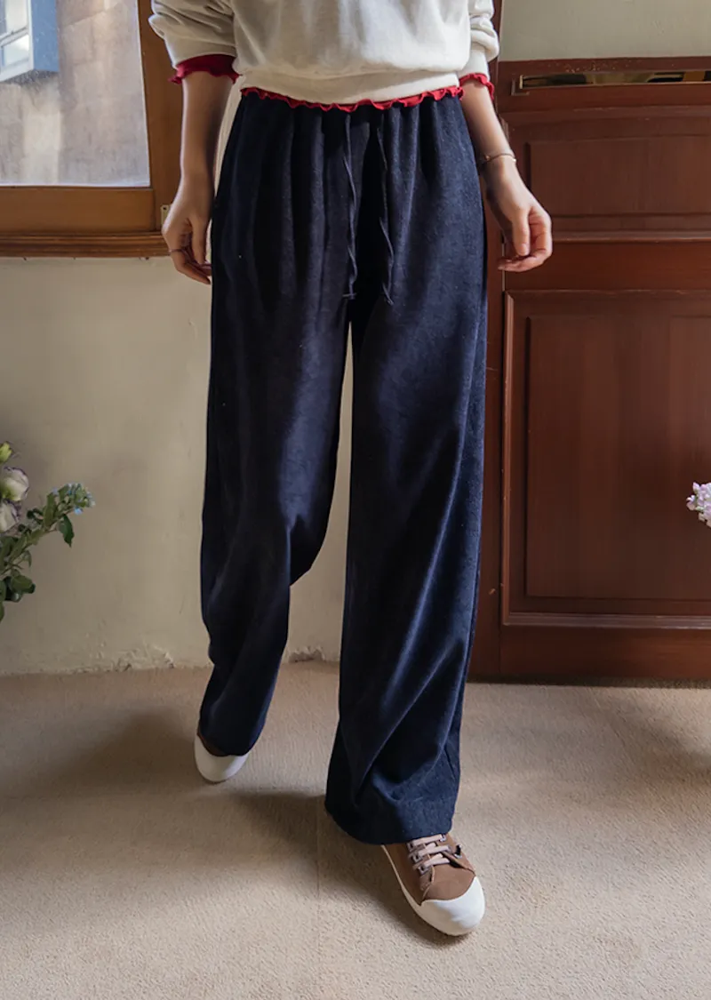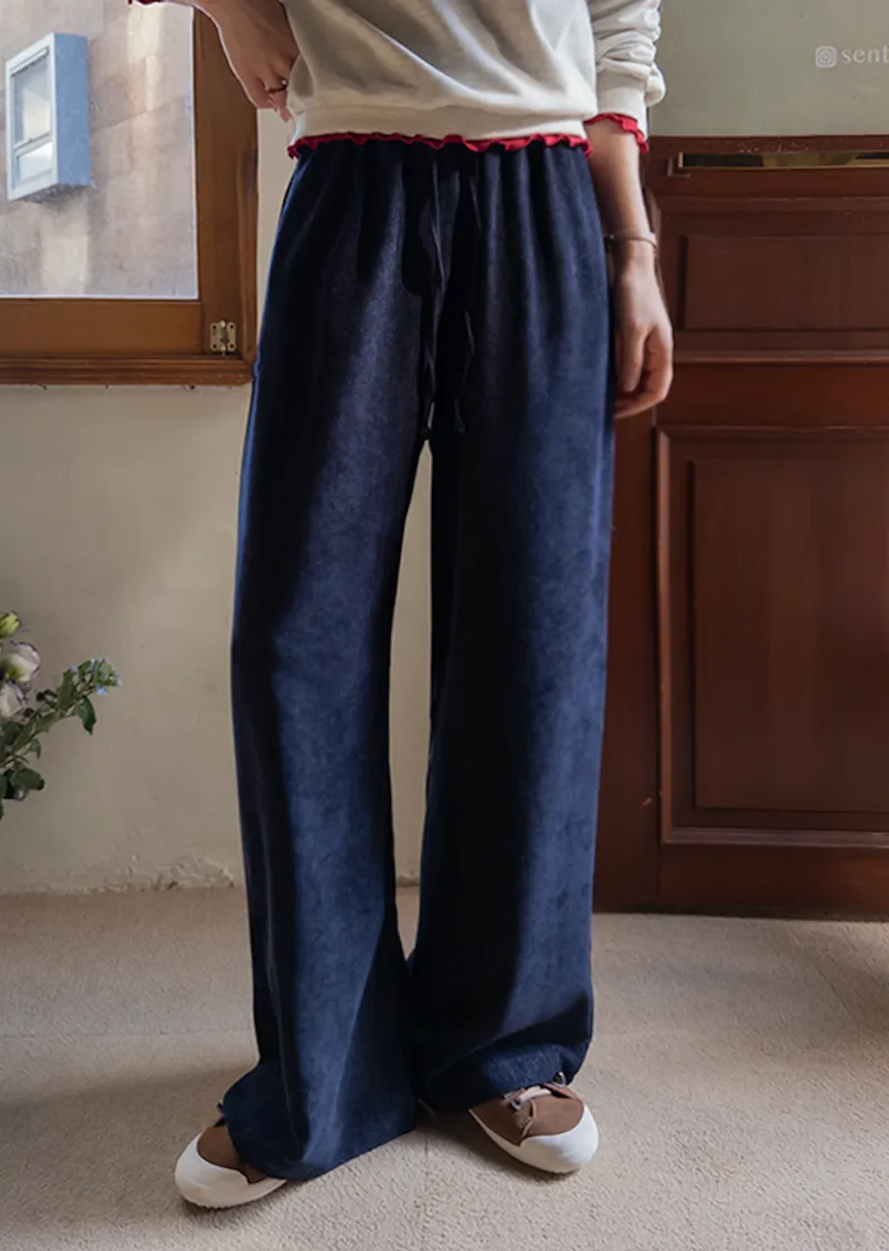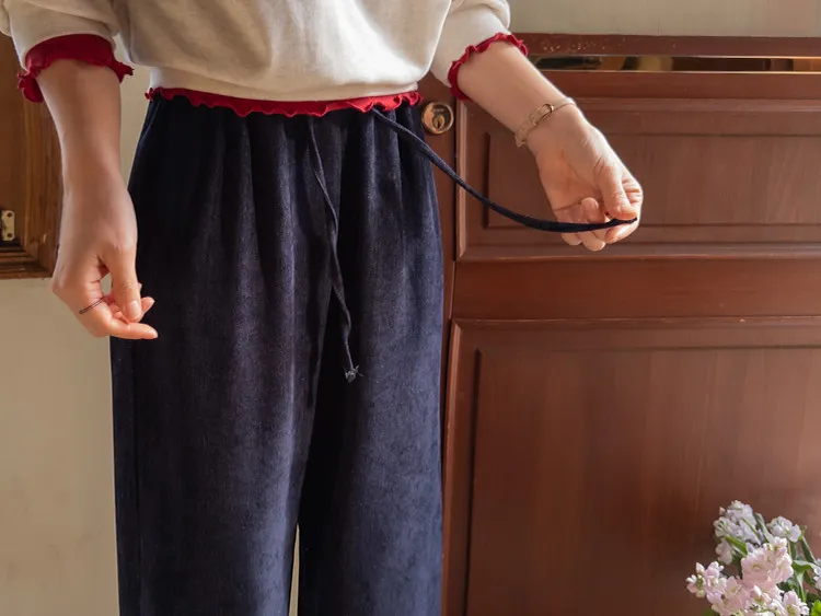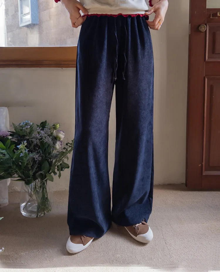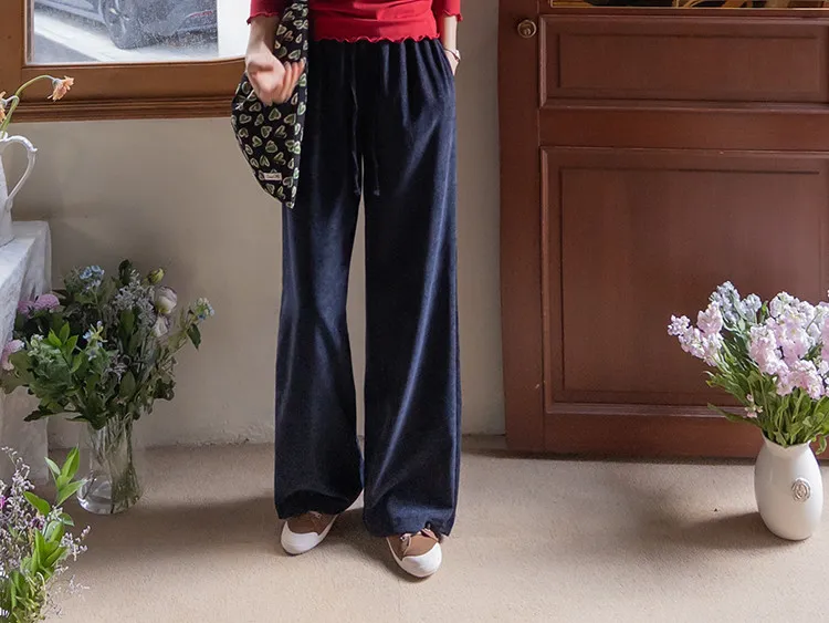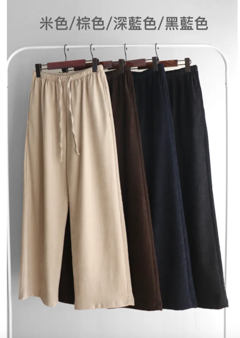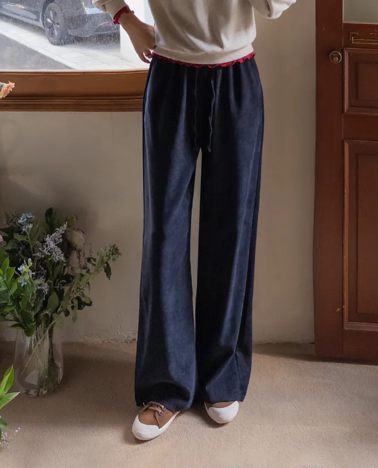 日常穿搭柔軟蓬鬆綁帶收腰寬版絨質休閒褲