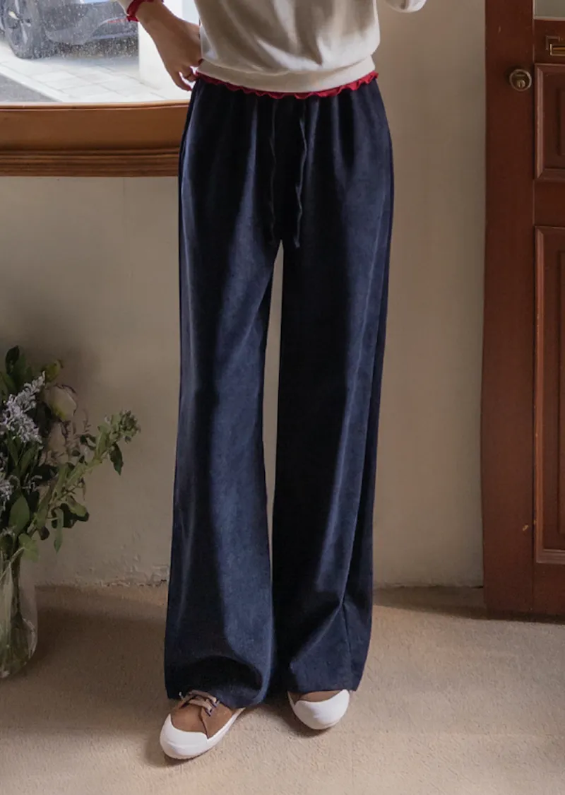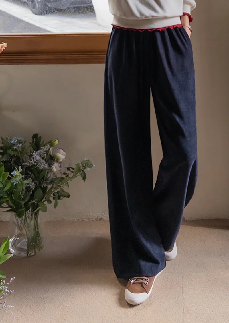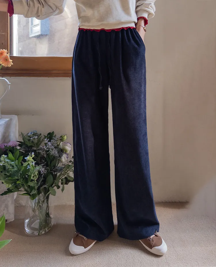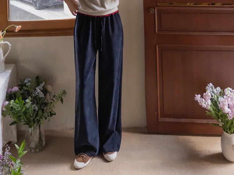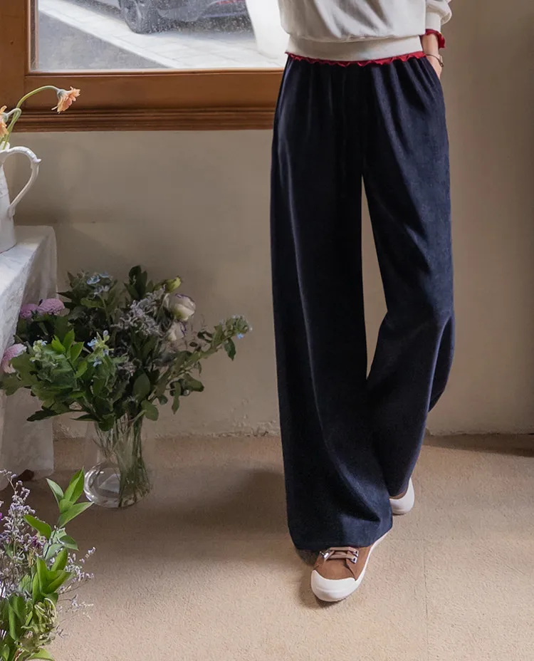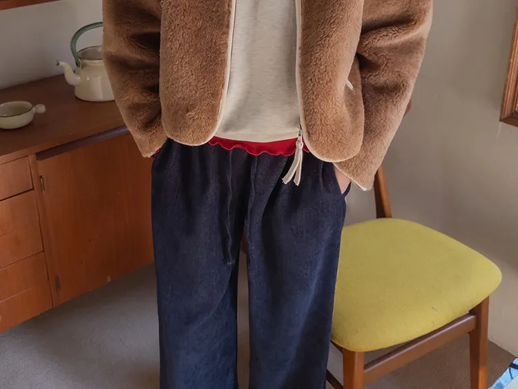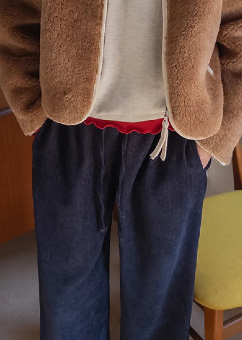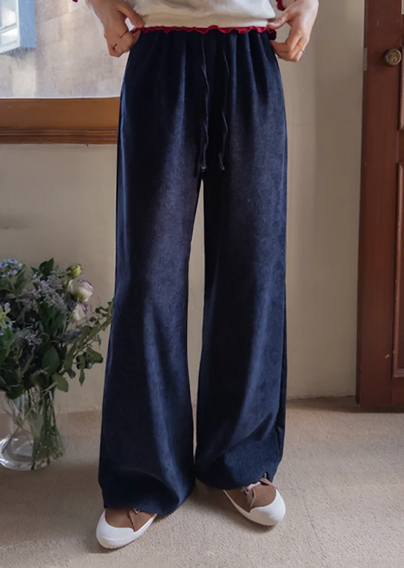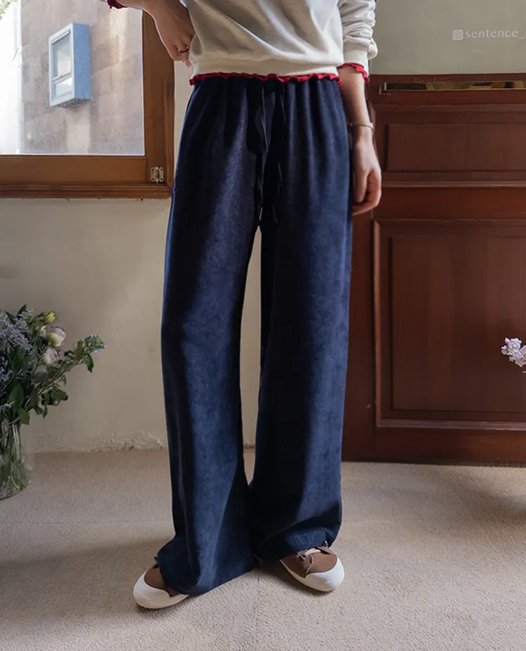 日常穿搭柔軟蓬鬆綁帶收腰寬版絨質休閒褲