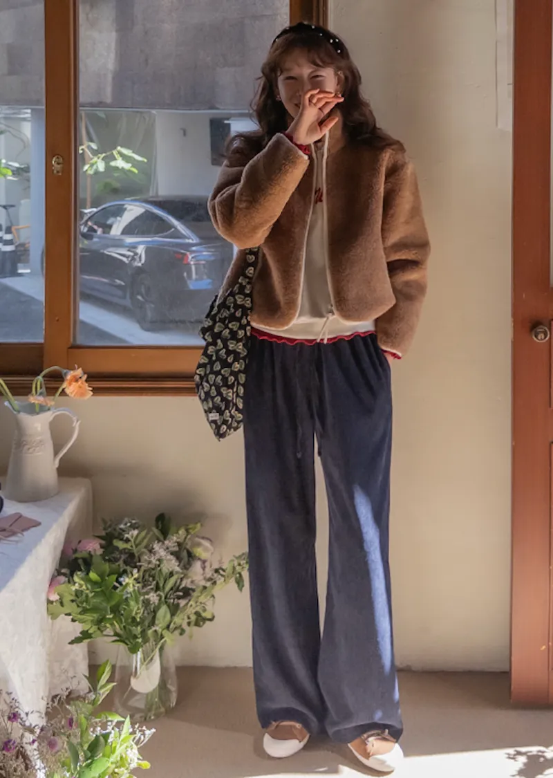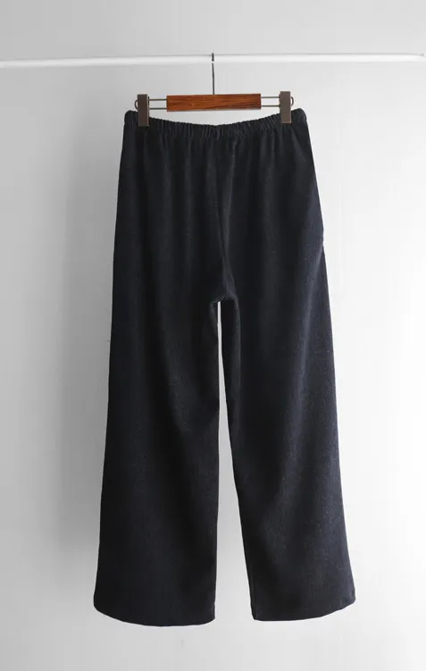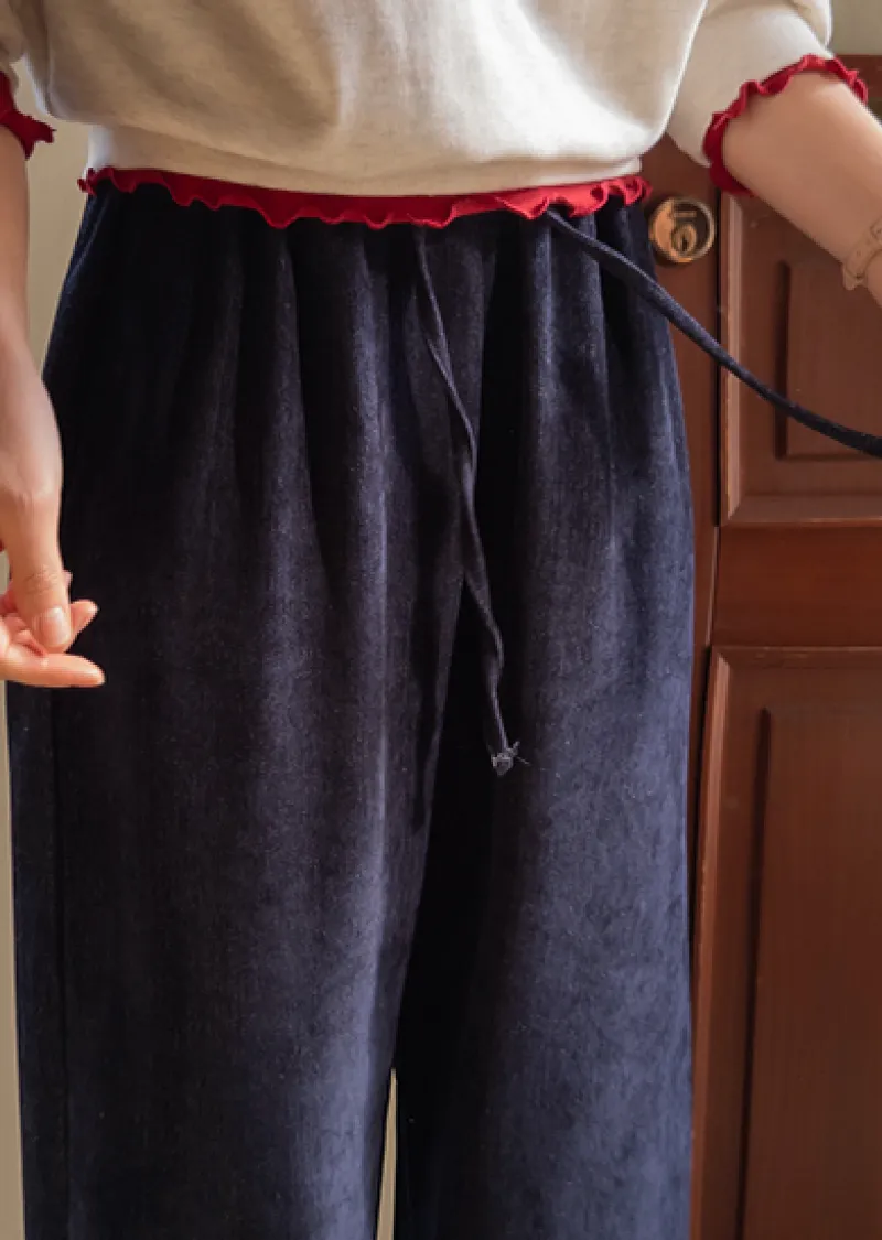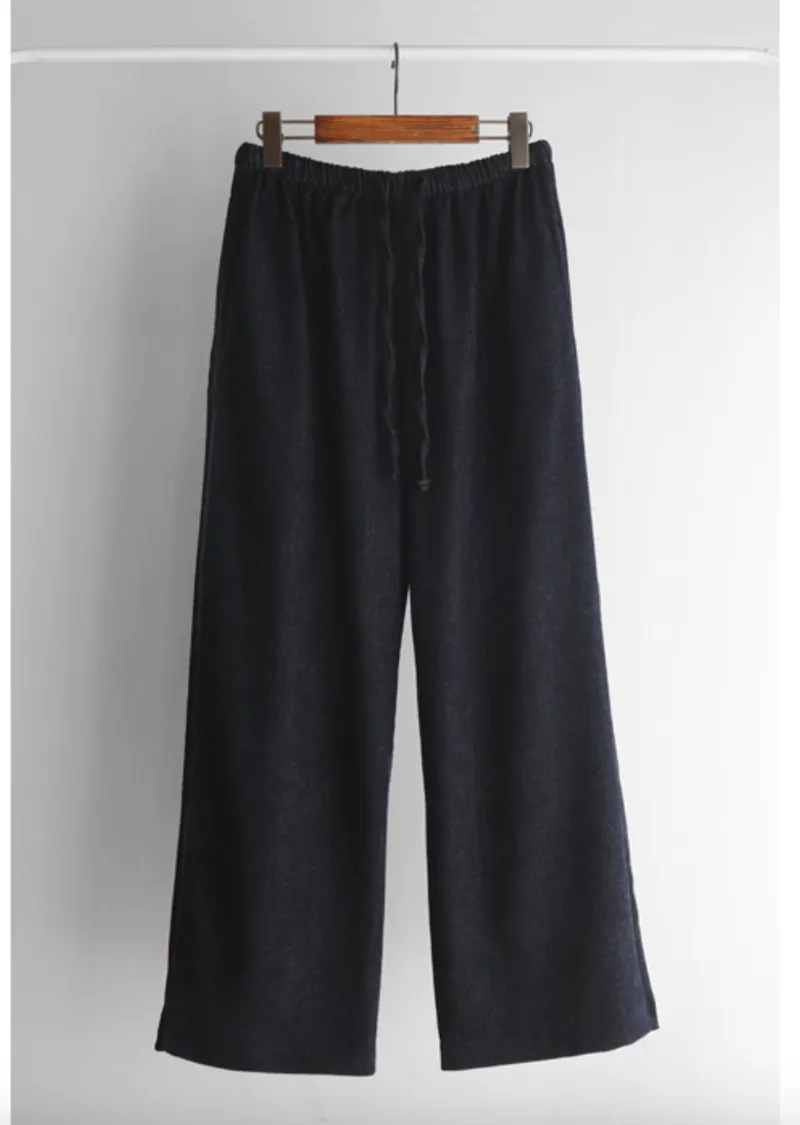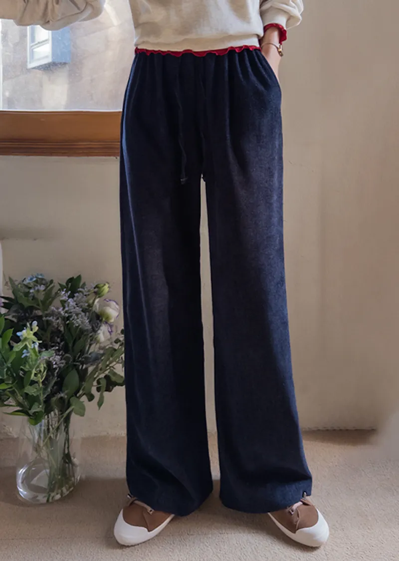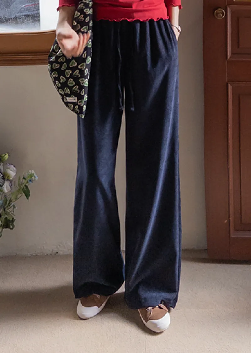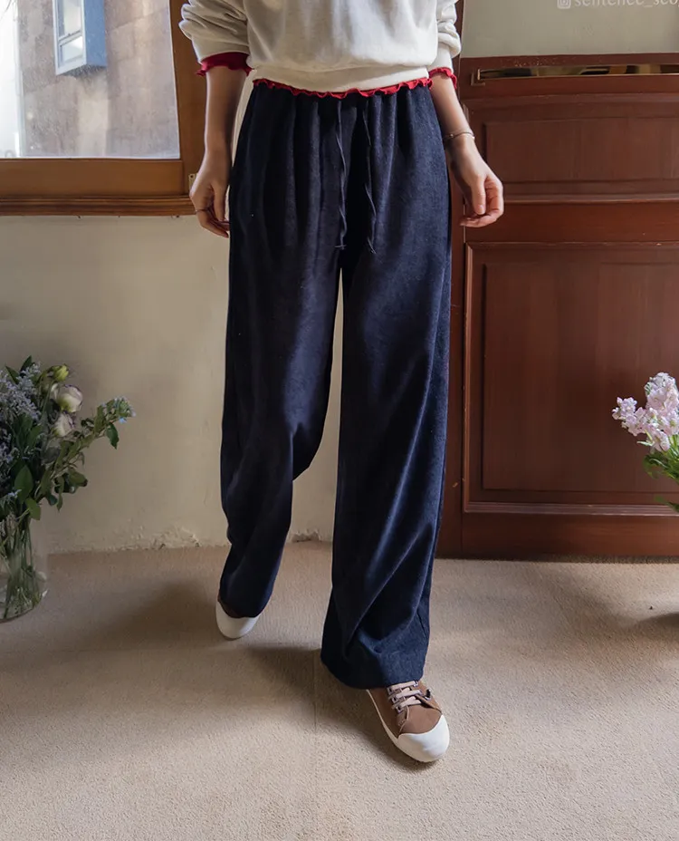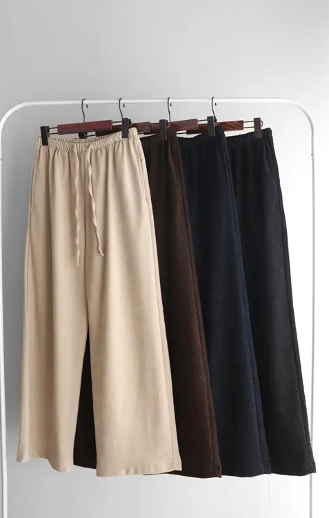 日常穿搭柔軟蓬鬆綁帶收腰寬版絨質休閒褲