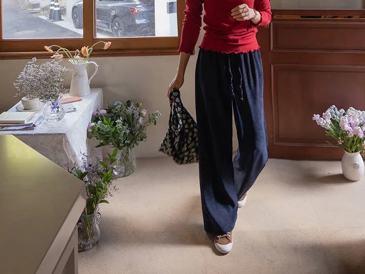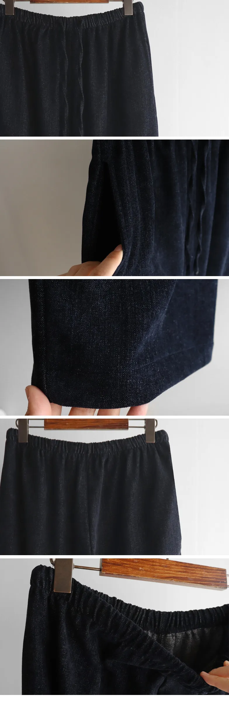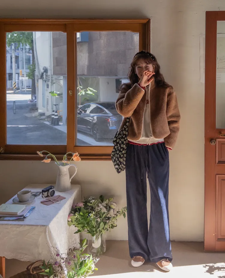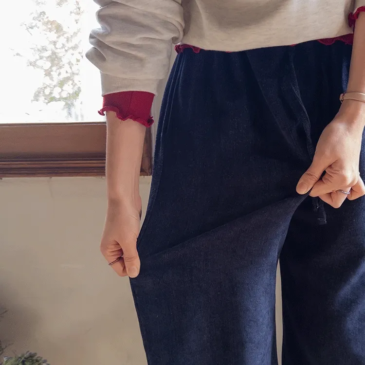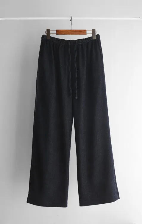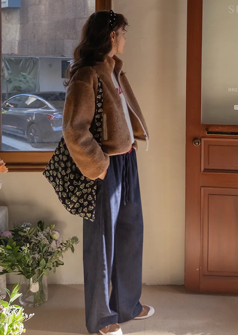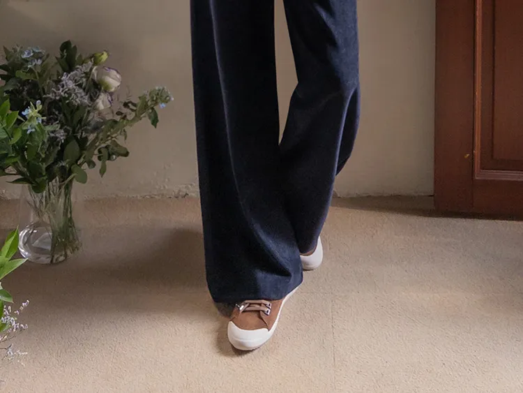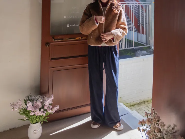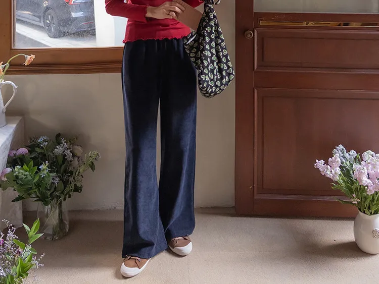 日常穿搭柔軟蓬鬆綁帶收腰寬版絨質休閒褲