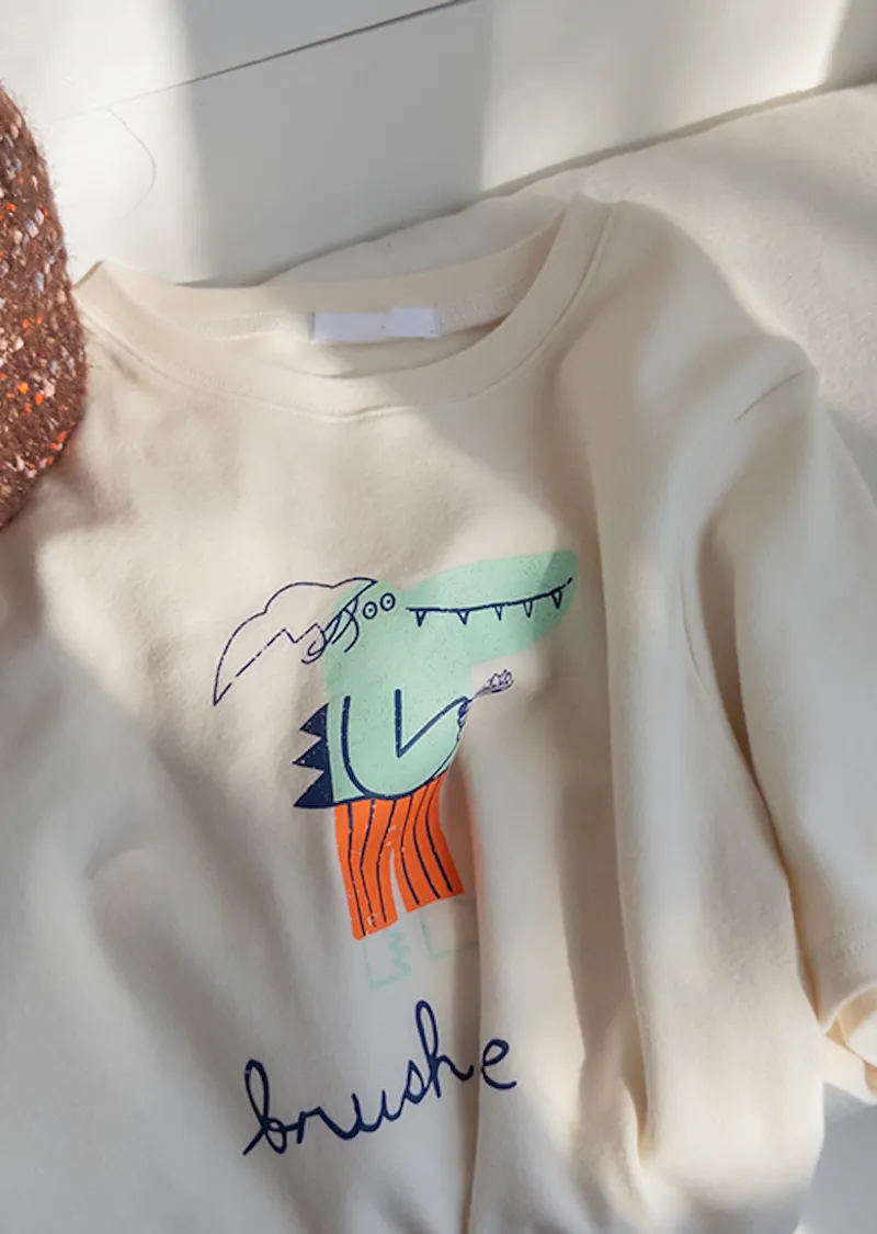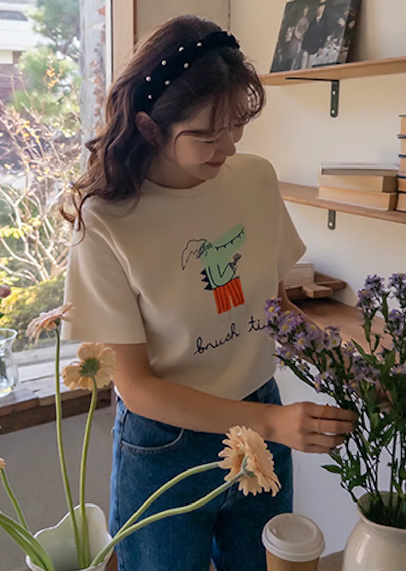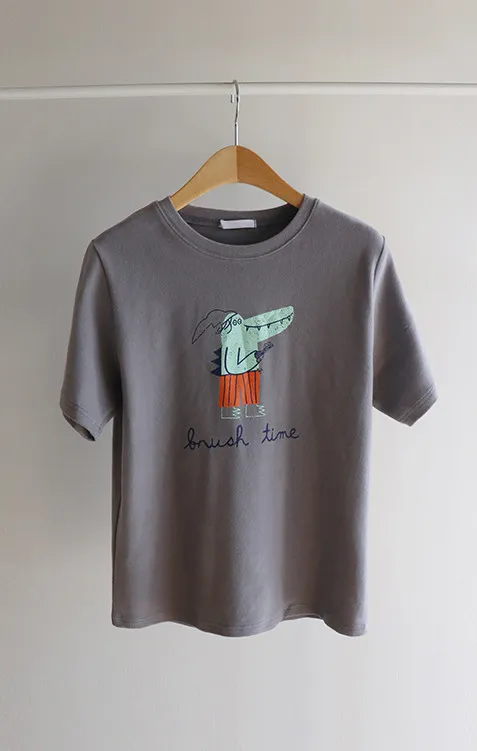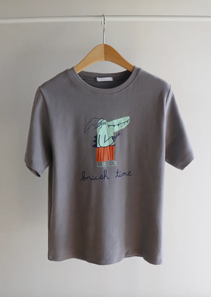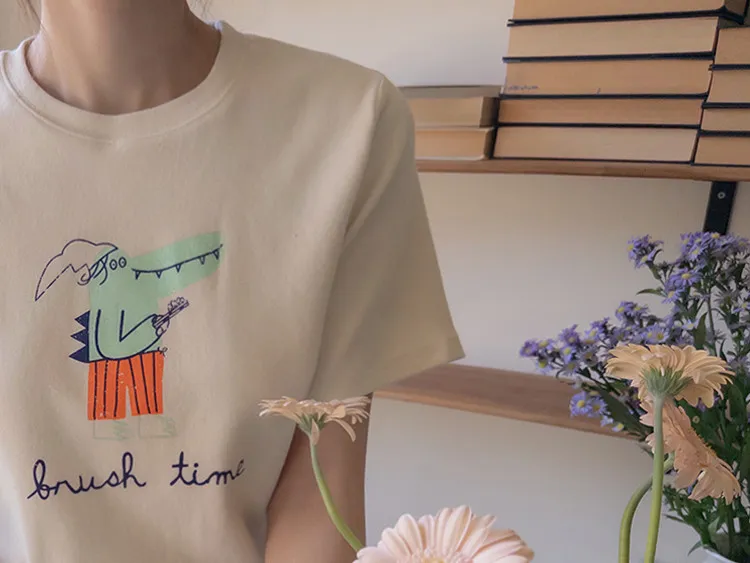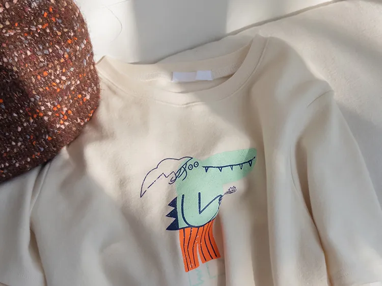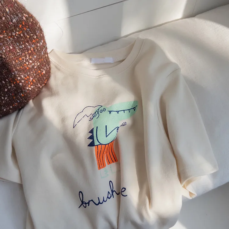 可愛呆萌鱷魚印花柔軟彈性絨質短袖上衣